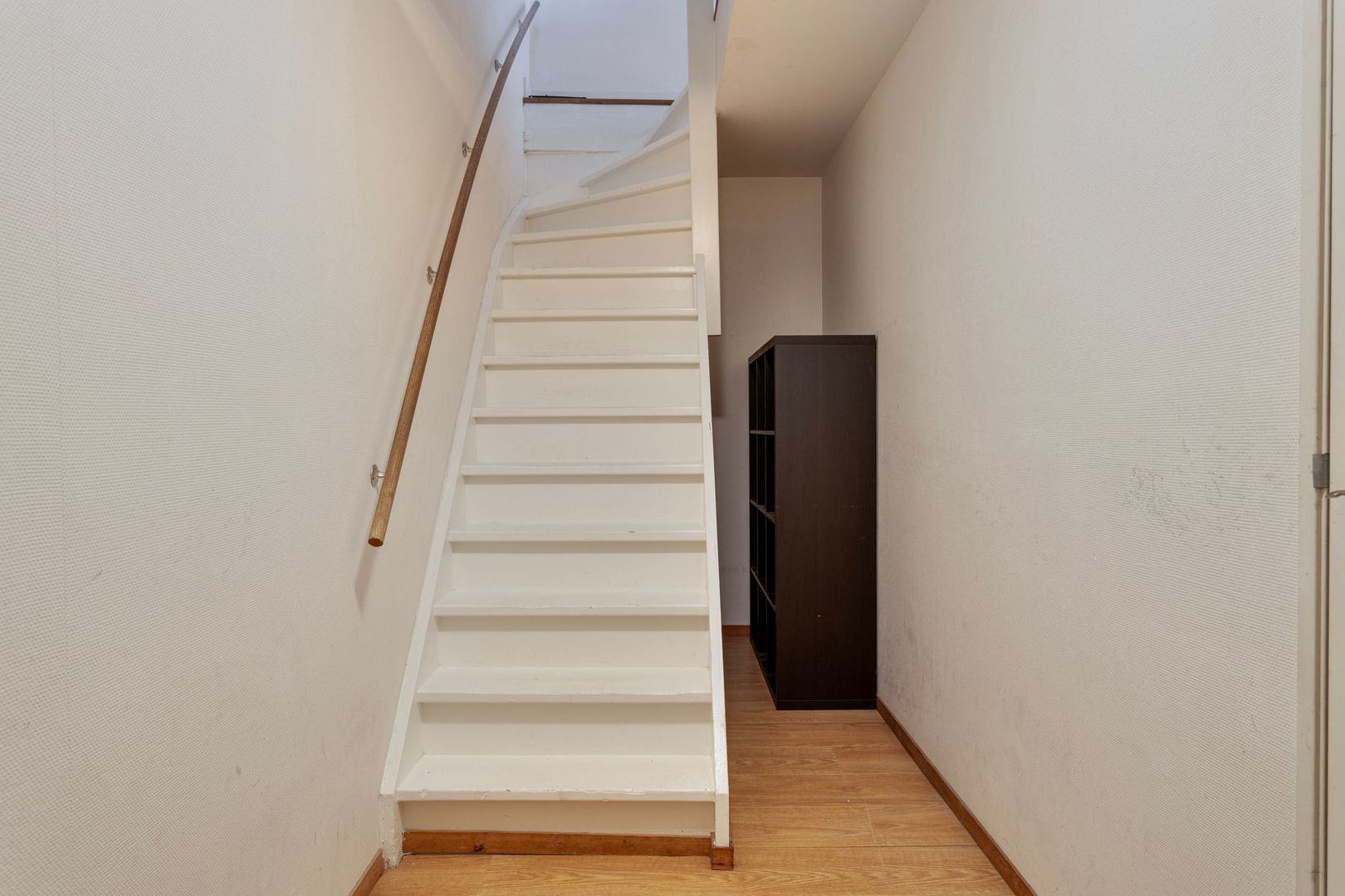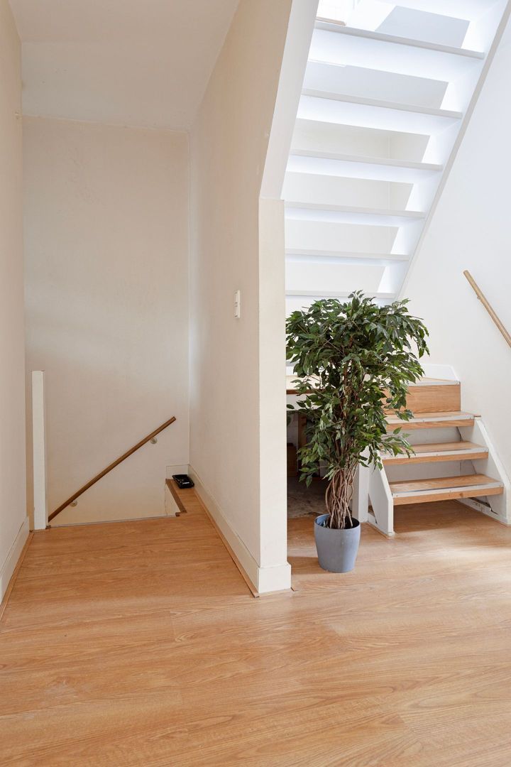 Trapopgang naar 2e verdieping met bordes, en handige opbergruimte onder het bordes.