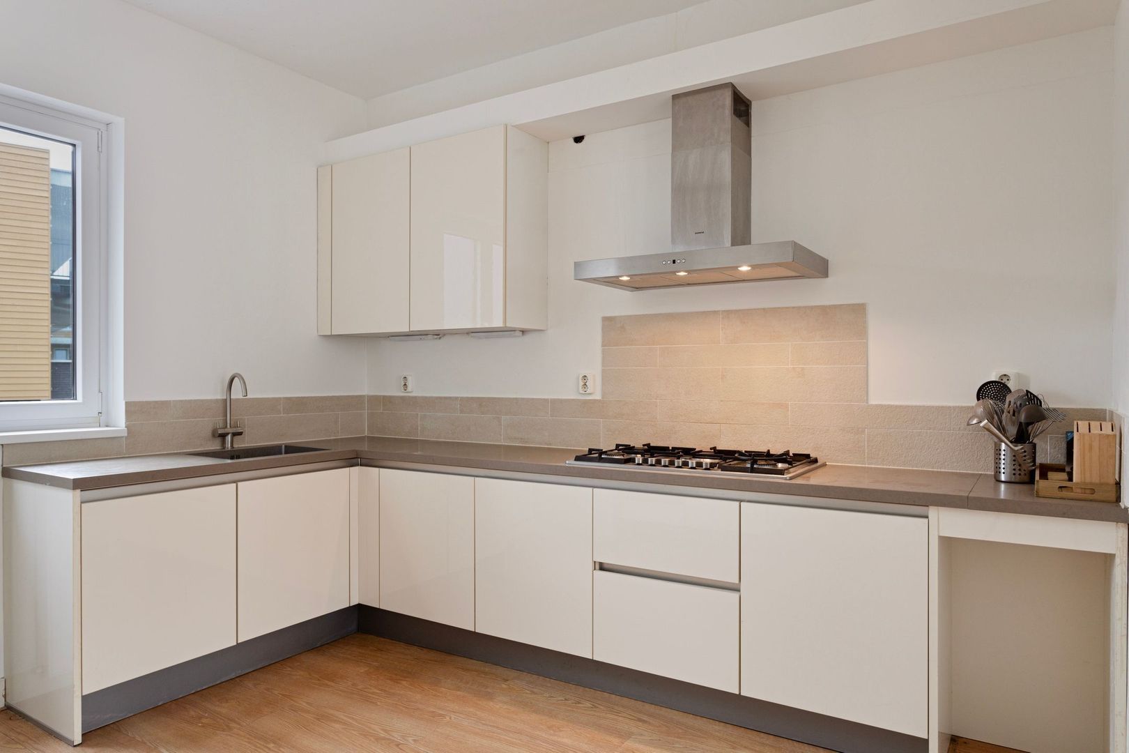 • Gehele woning voorzien van mooie laminaatvloer met ondervloer;