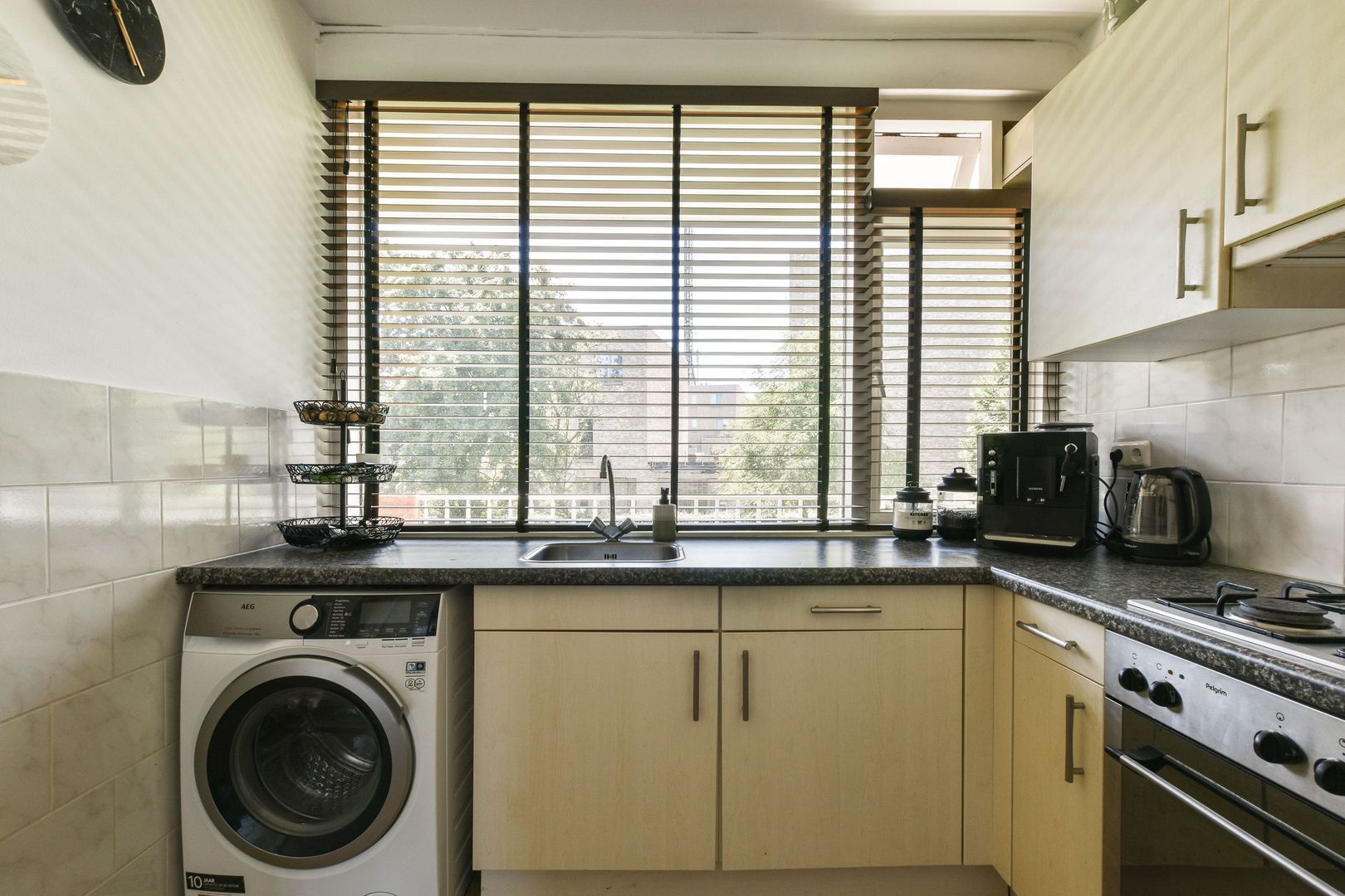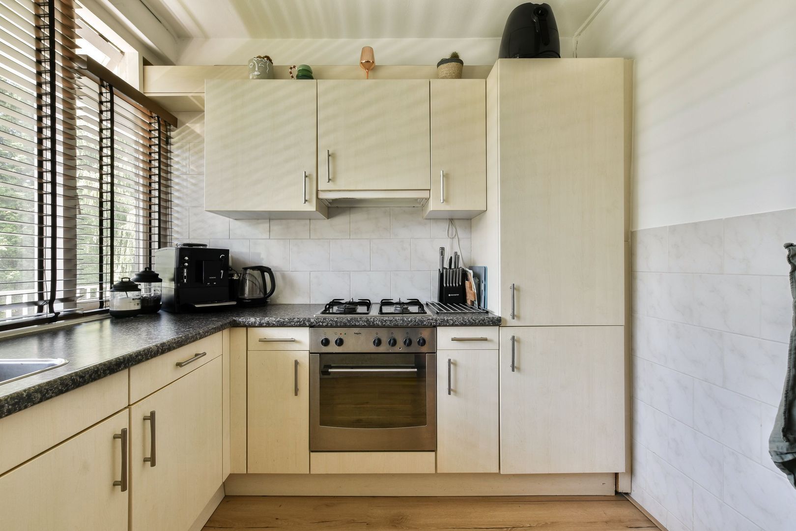 Dichte keuken van ca. 6,5 m2 met witte front en grijs werkblad. De keuken in hoekopstelling is voorzien van de navolgende inbouwapparatuur; oven, 4 pits gaskookplaat, koelkast en 3 laden vrieskast. In de keuken bevindt zich tevens de wasmachineaansluiting.