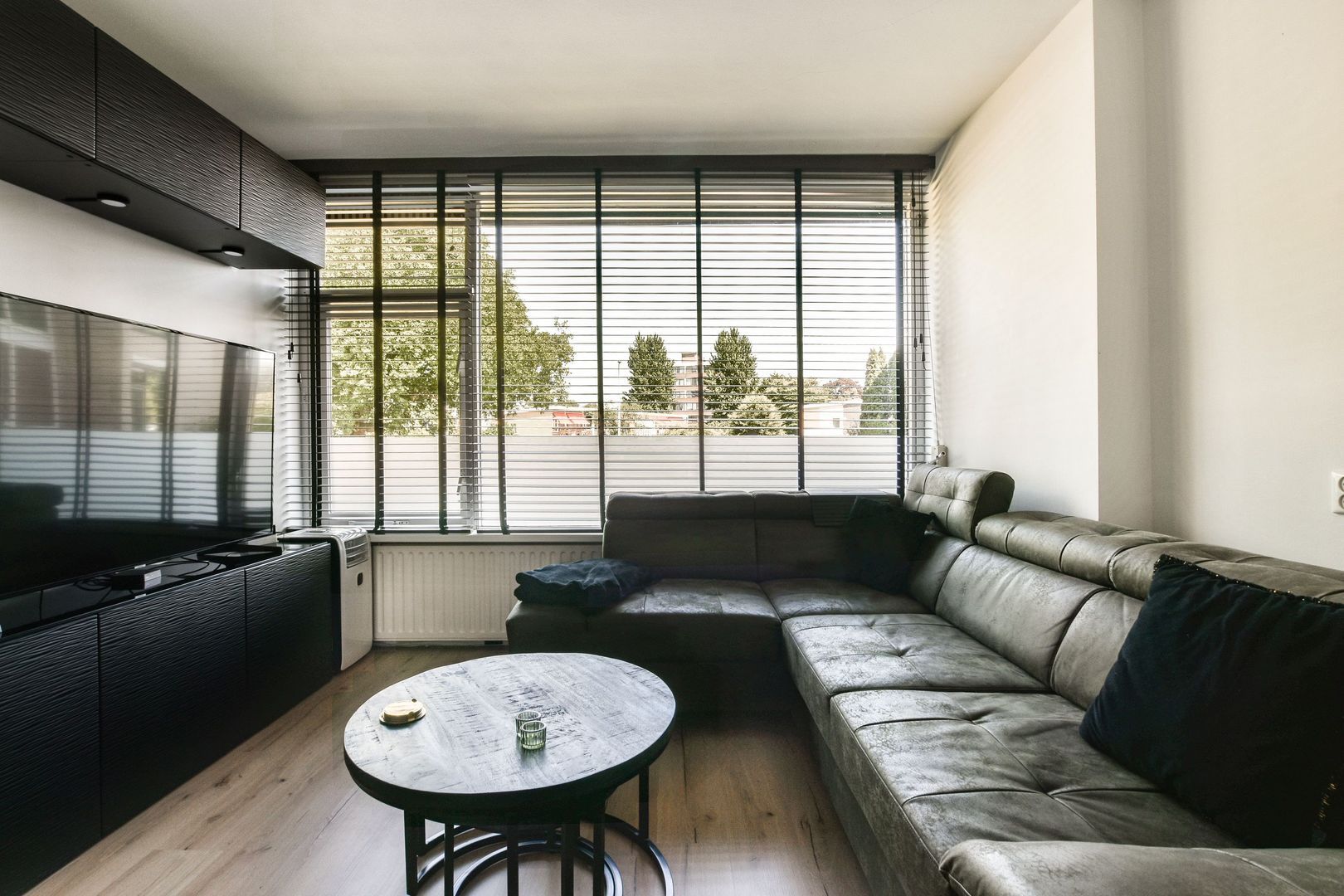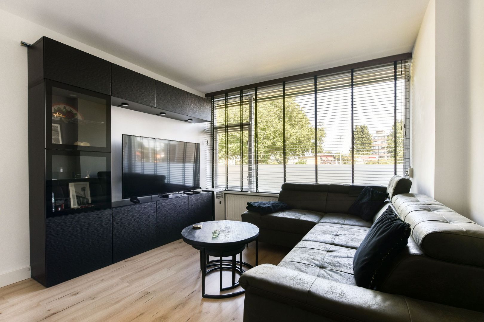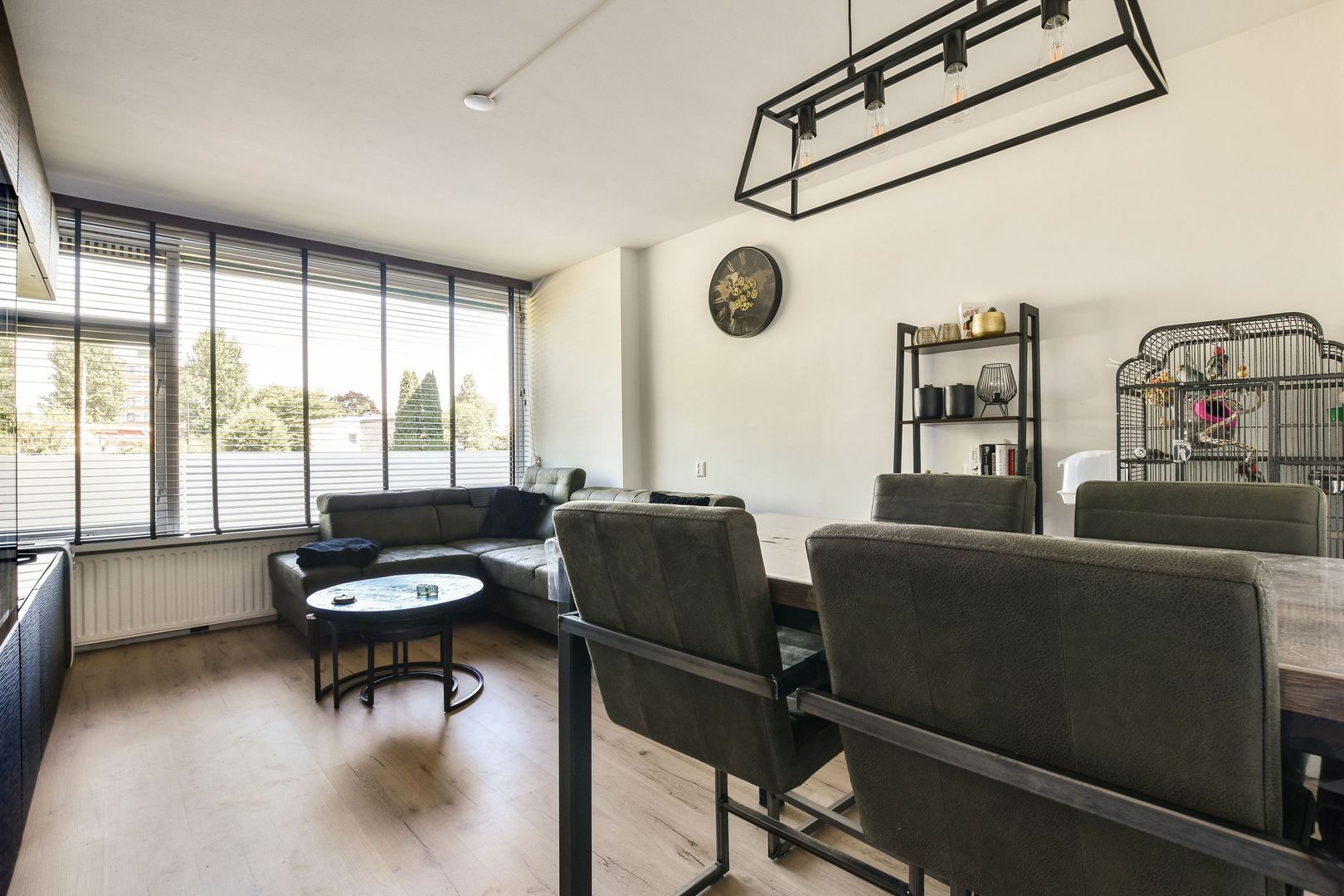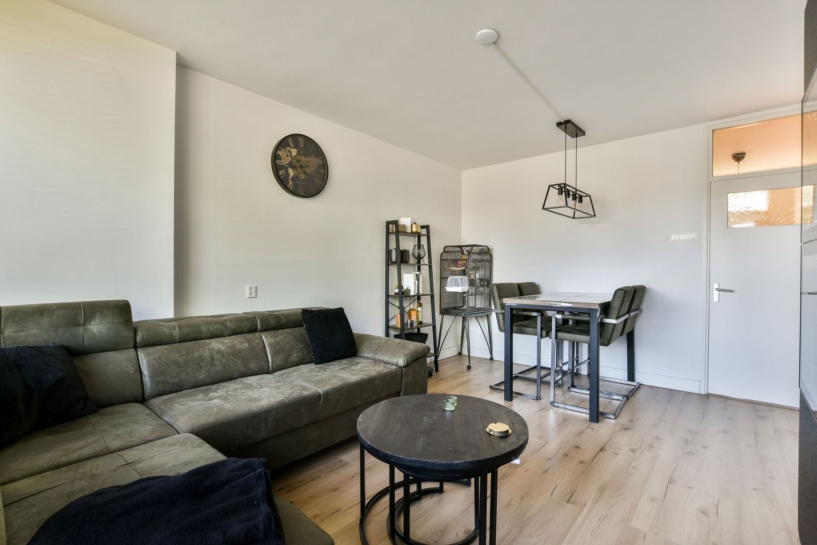 Lichte woonkamer van ca. 18m2 voorzien van houtlook laminaatvloer, groot raam met uitzicht, gestuukte wanden en gestuukt plafond.