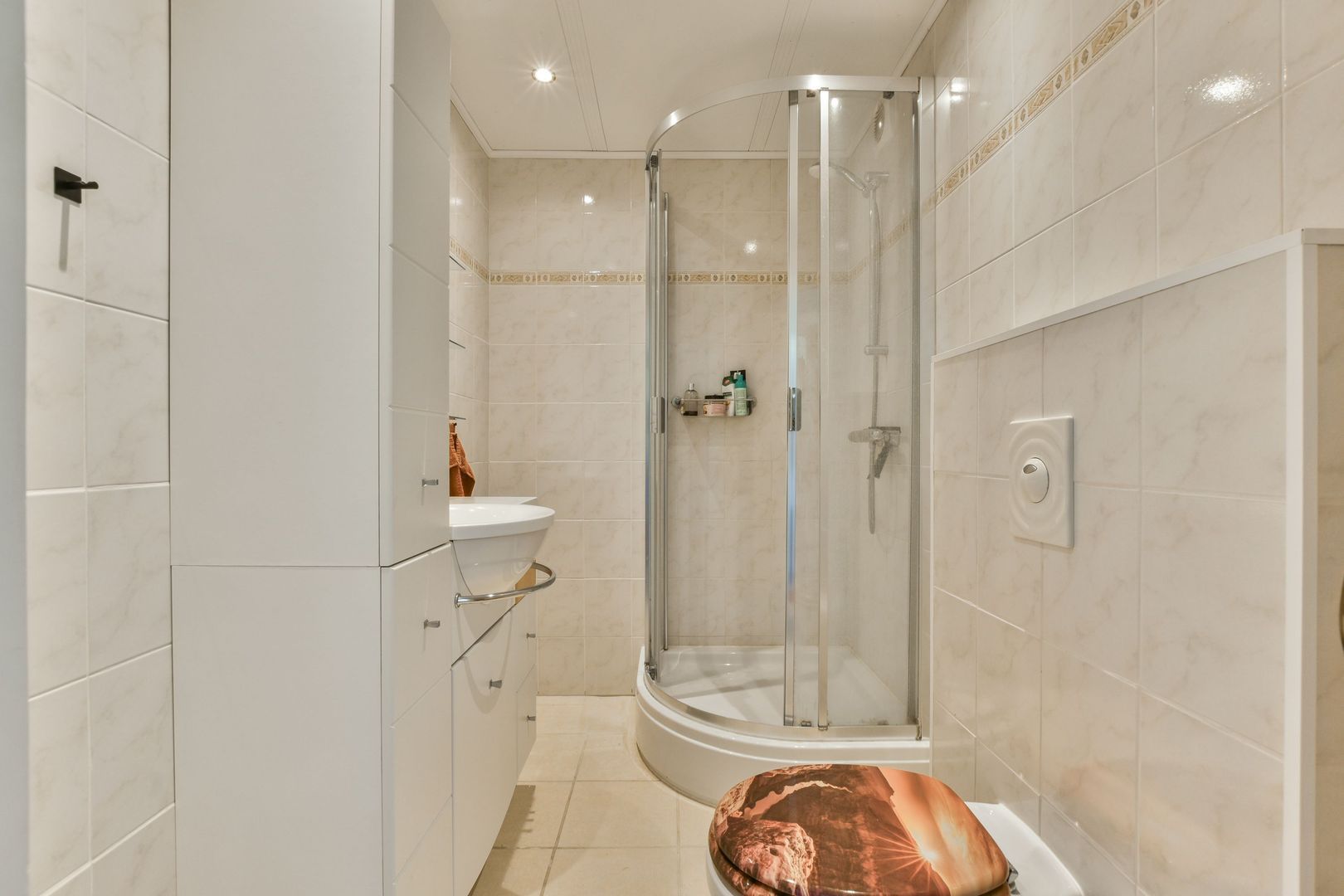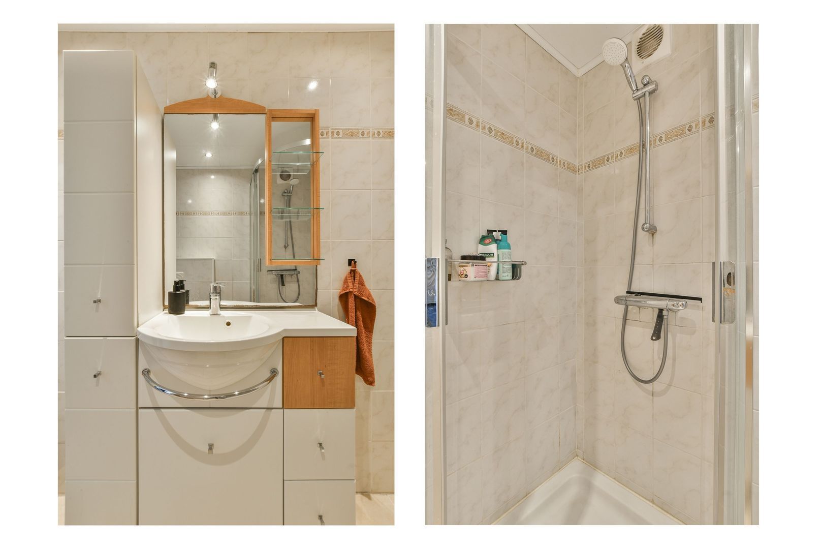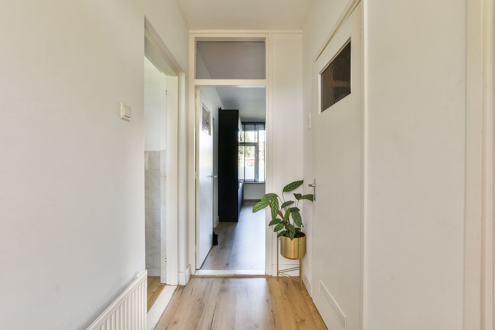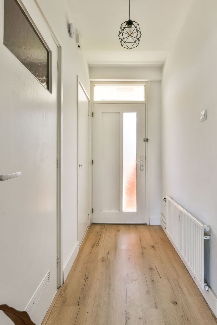 Entree, hal met laminaatvloer doorlopend naar de keuken, diepe bergkast voorzien van meterkast, opstelling boiler en veel bergruimte. Moderne badkamer met volledige betegeling, douchecabine met thermostaatkraan, zwevend toilet, wastafelmeubel, plafond met ingebouwde spots en een directe ventilatie naar buiten.