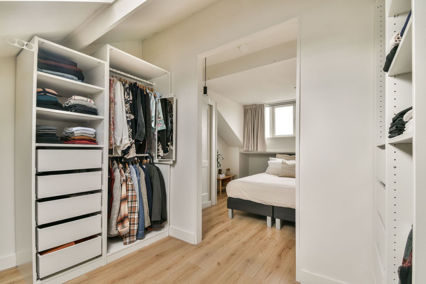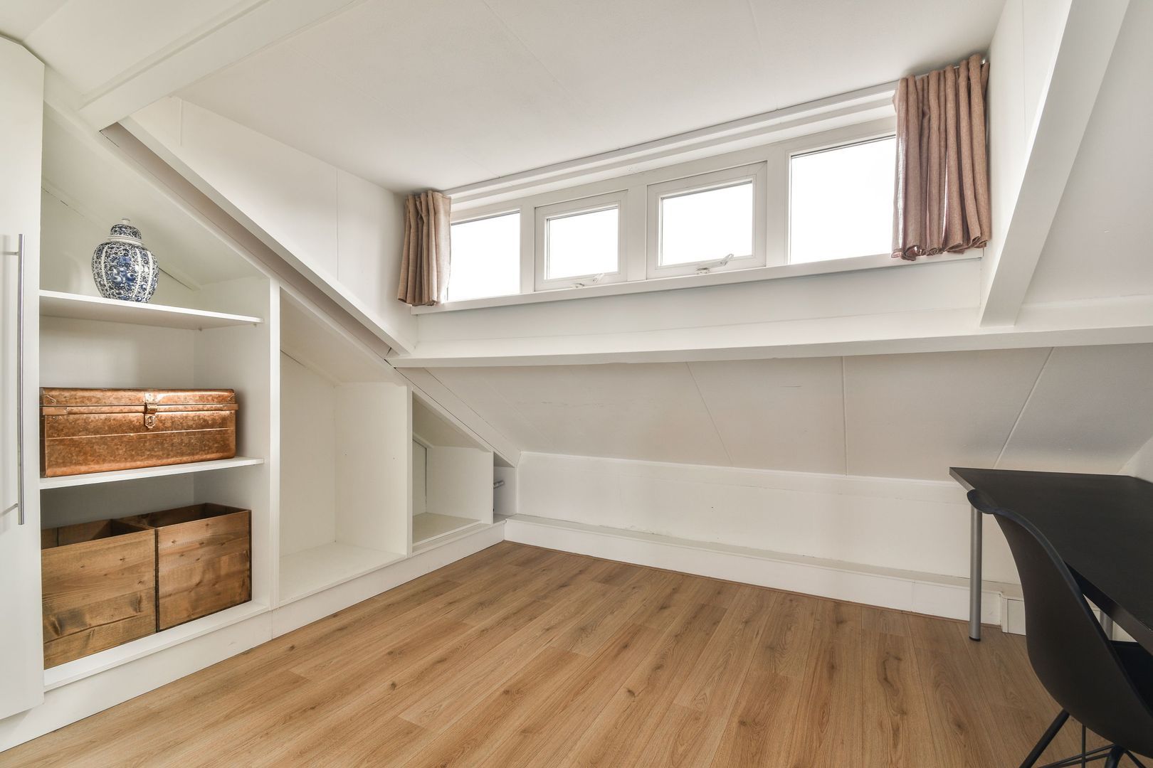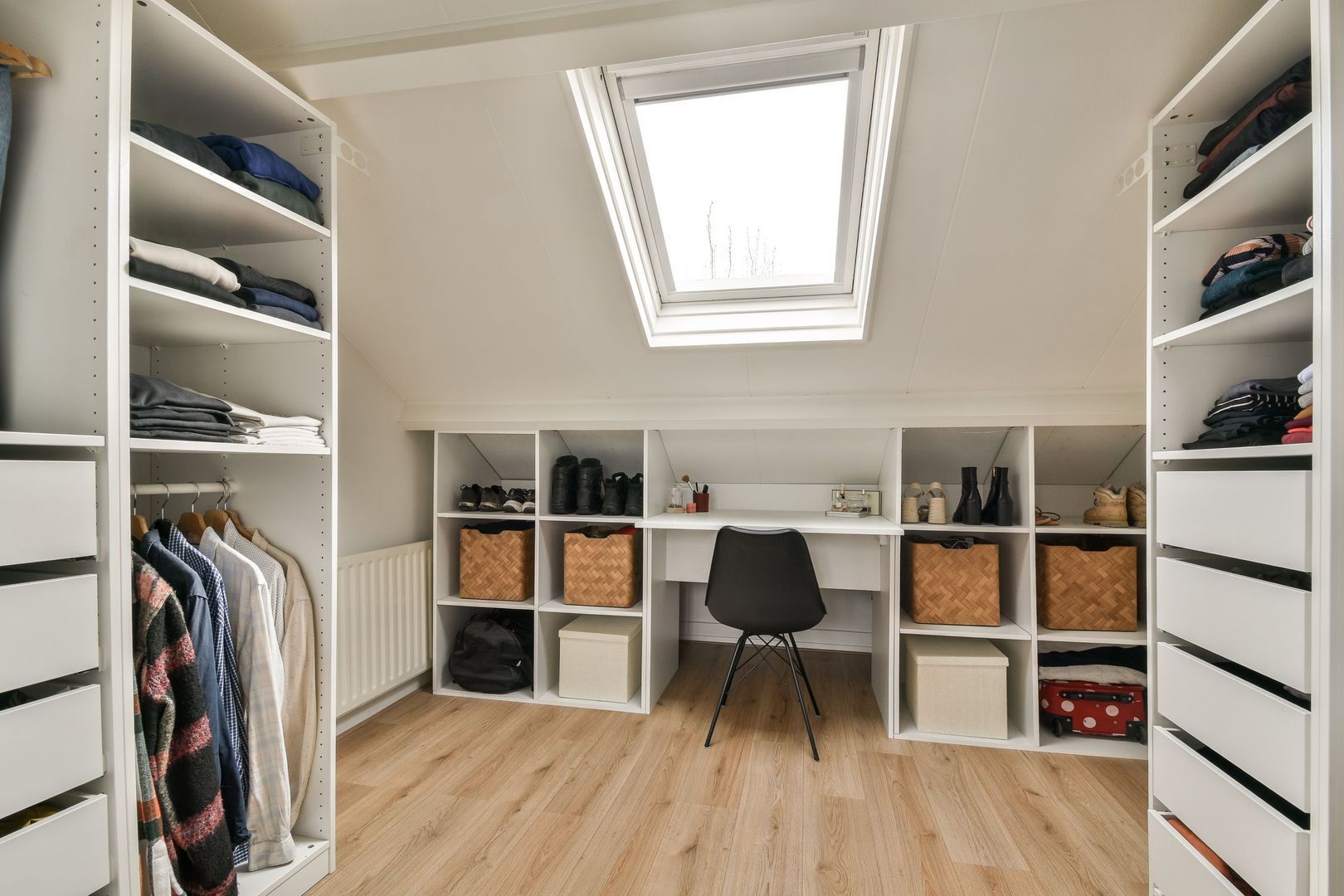 Ook aan opslagruimte is gedacht. Zo is er een vliering gerealiseerd en er zijn kasten onder de schuine delen op maat gemaakt.