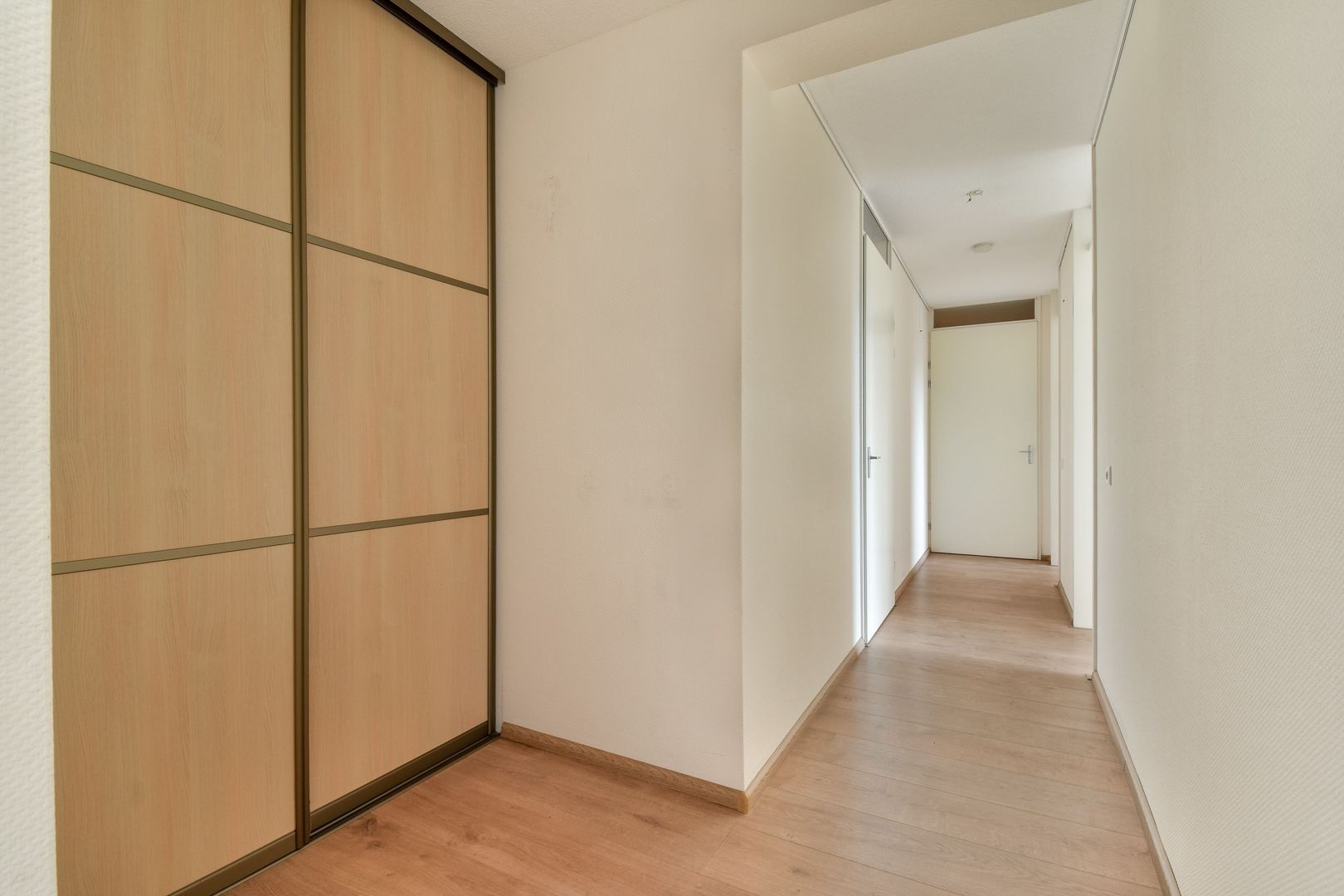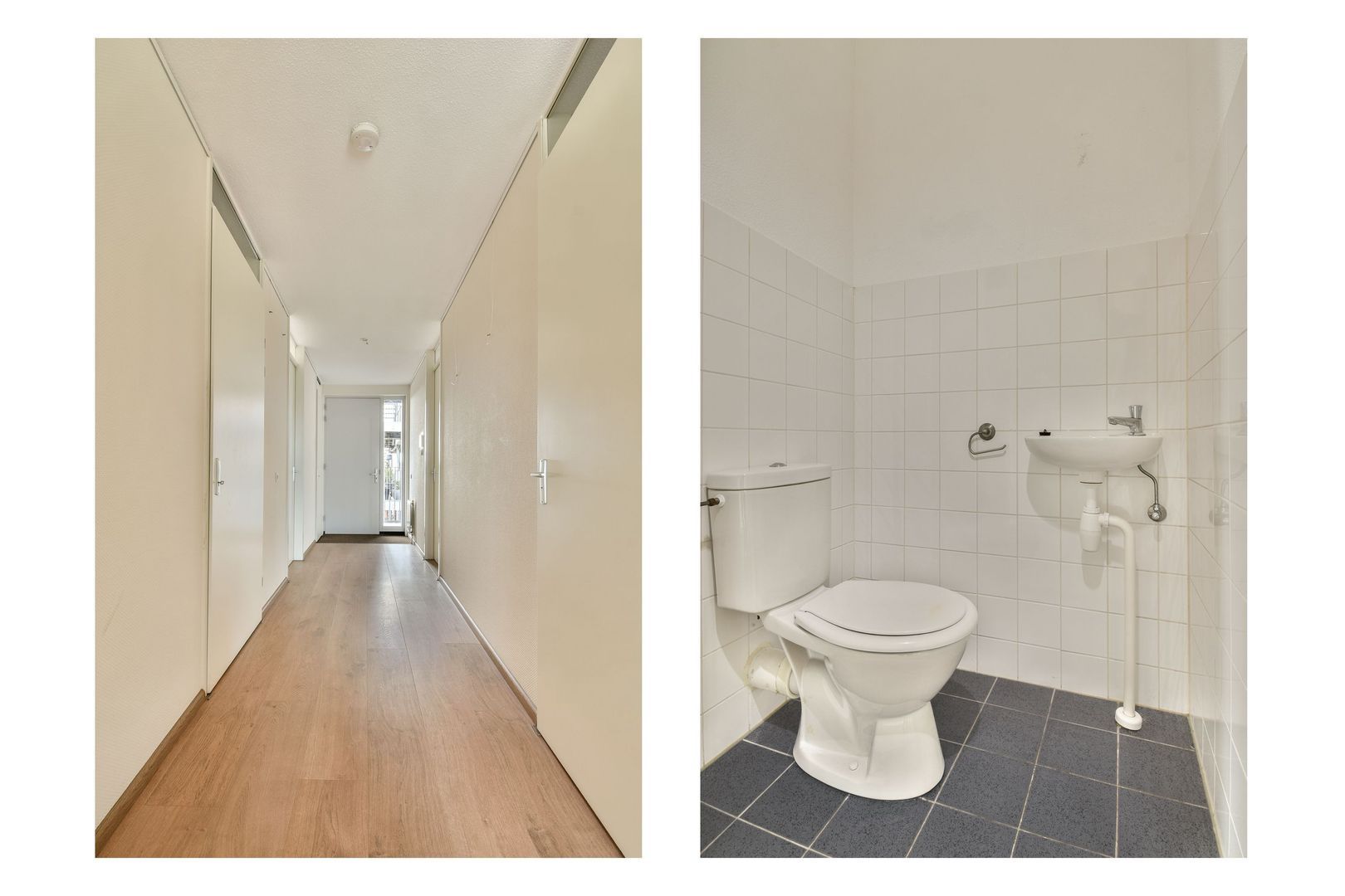 Brede entreehal met videofoon, meterkast en kast met CV-combiketel en unit mechanische ventilatie. Er is een diepe garderobe-nis met schuifkasten. Het toilet is gedeeltelijk betegeld en voorzien van een fontein.