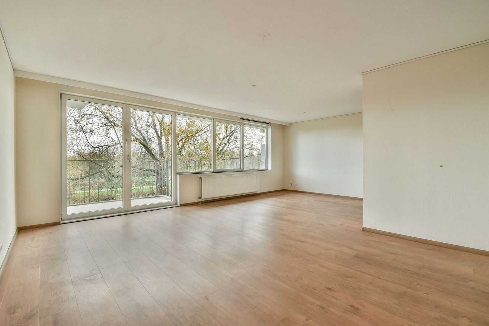 Vanuit de woonkamer geven openslaande deuren toegang tot het balkon op het Oosten van ca. 18,5 m2 met een breed zitgedeelte en een "zeemgedeelte".