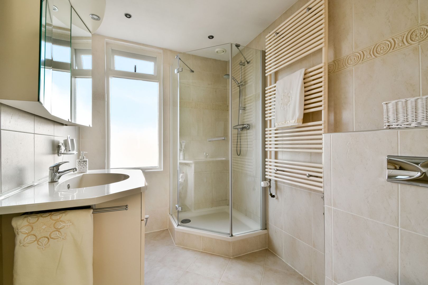 Moderne badkamer met vrijhangend tweede toilet, ruime douchecabine, wastafelmeubel met spiegelkast, handdoekenradiator, raam voor daglicht en een systeemplafond met ingebouwde verlichting.