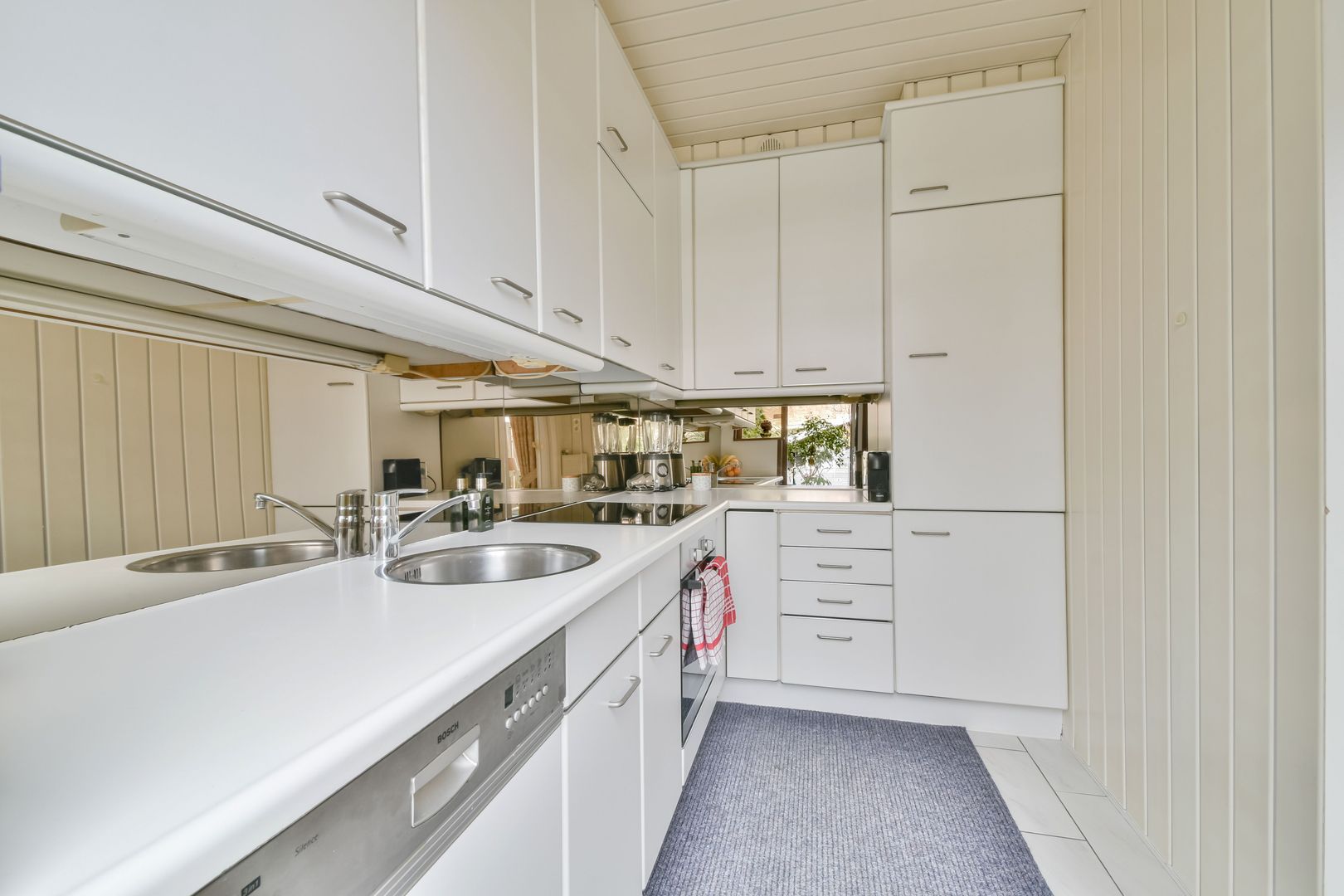 Aan de tuinzijde bevindt zich de halfopen keuken (ca. 6 m2) in hoekopstelling, uitgevoerd met witte fronten, bovenkasten, een betegelde vloer en de volgende inbouwapparatuur: vaatwasser, inductiekookplaat (2025), koel-/vriescombinatie, heteluchtoven en een 10-liter boiler. Vanuit de keuken is er toegang tot de tuin.