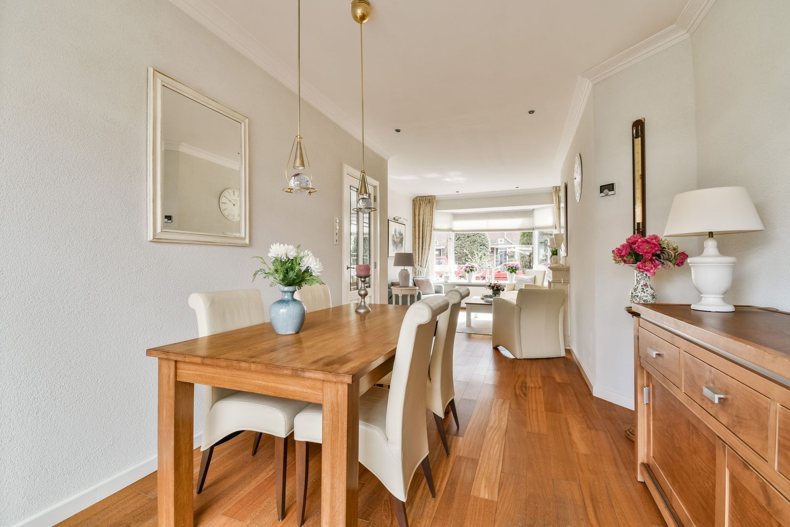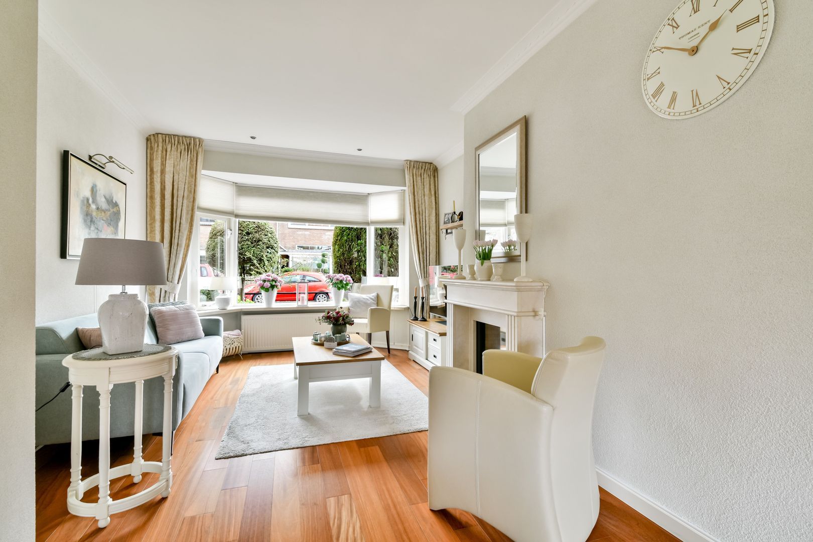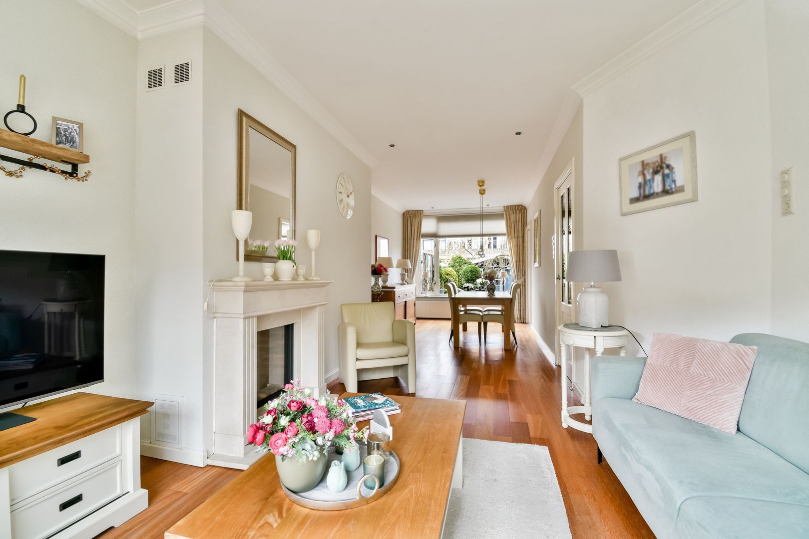 De woonkamer (ca. 28 m2) beschikt over een erker, spachtelputz wanden, een strak gestukt plafond, een gesloten gashaard met stijlvolle kalkzandstenen schouw en een hardhouten parketvloer.
