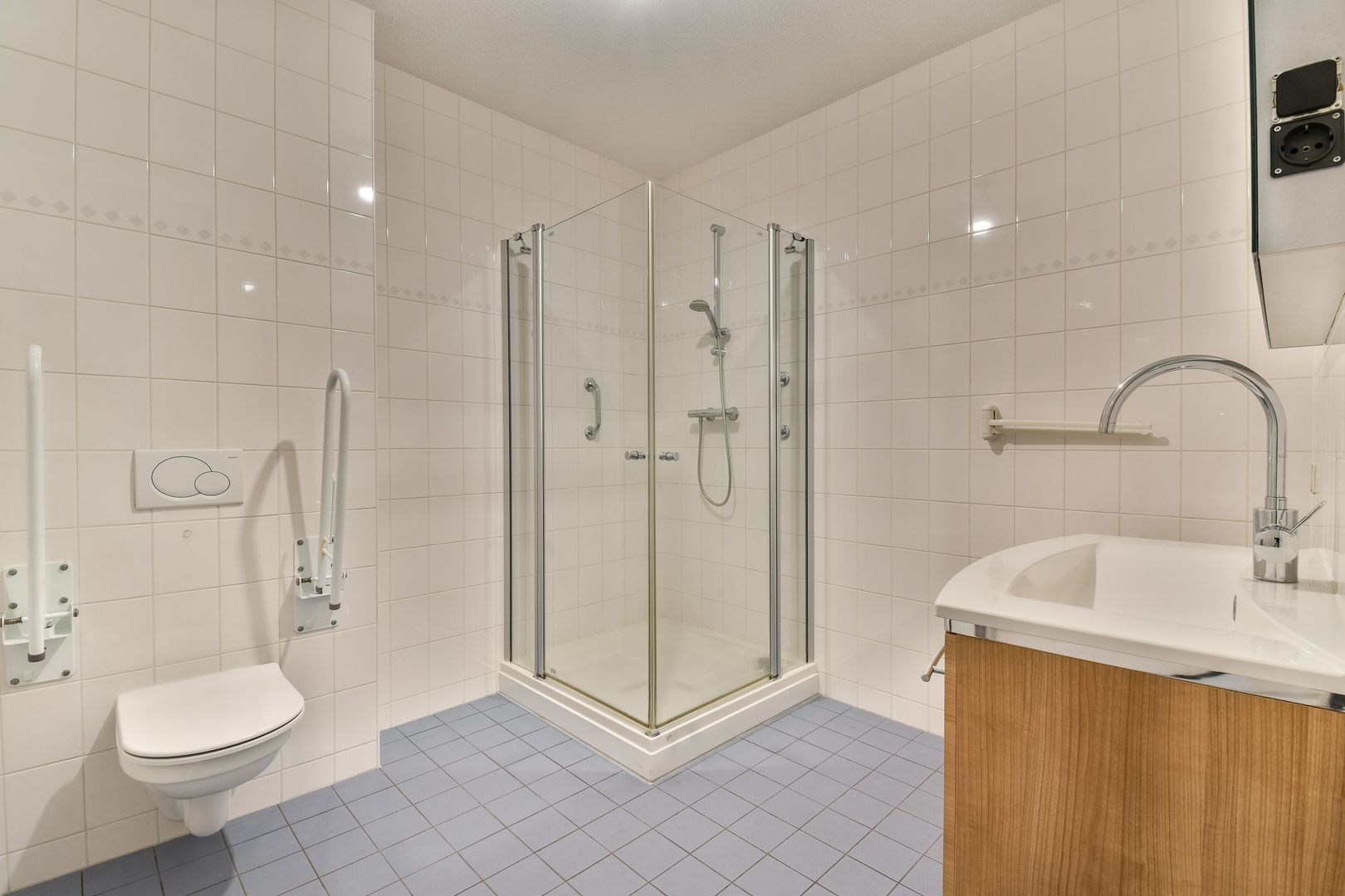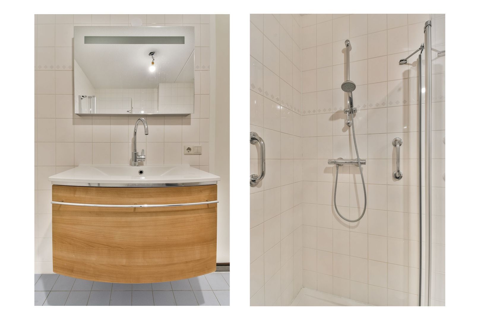 De badkamer van ruim 6,5 m2 is geheel betegeld en voorzien van een douchecabine, 2e toilet en wastafelmeubel.
