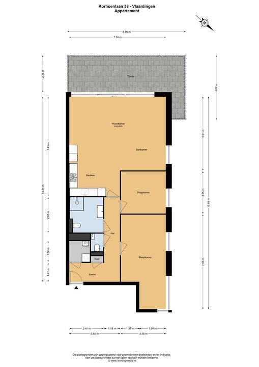 Entreehal met garderobemogelijkheden en meterkast. Gedeeltelijk betegeld toilet met fontein. Ruime woonkamer met open keuken van totaal ca. 44 m2. De woonkamer is uitgevoerd met ramen die tot aan de grond lopen en een extra hoekraam. Een schuifpui geeft toegang tot het riante terras van maar liefst ca. 27 m2 dat op het zuid-westen ligt en is voorzien van een elektrisch zonnescherm van ongeveer 2 jaar oud.