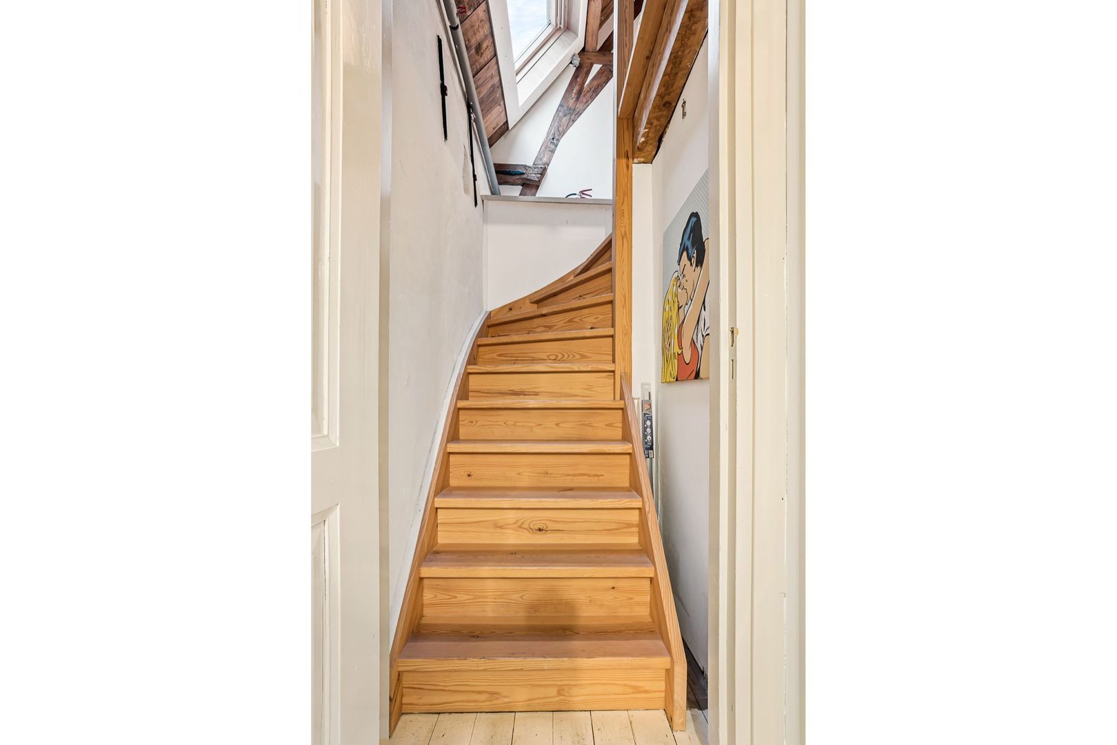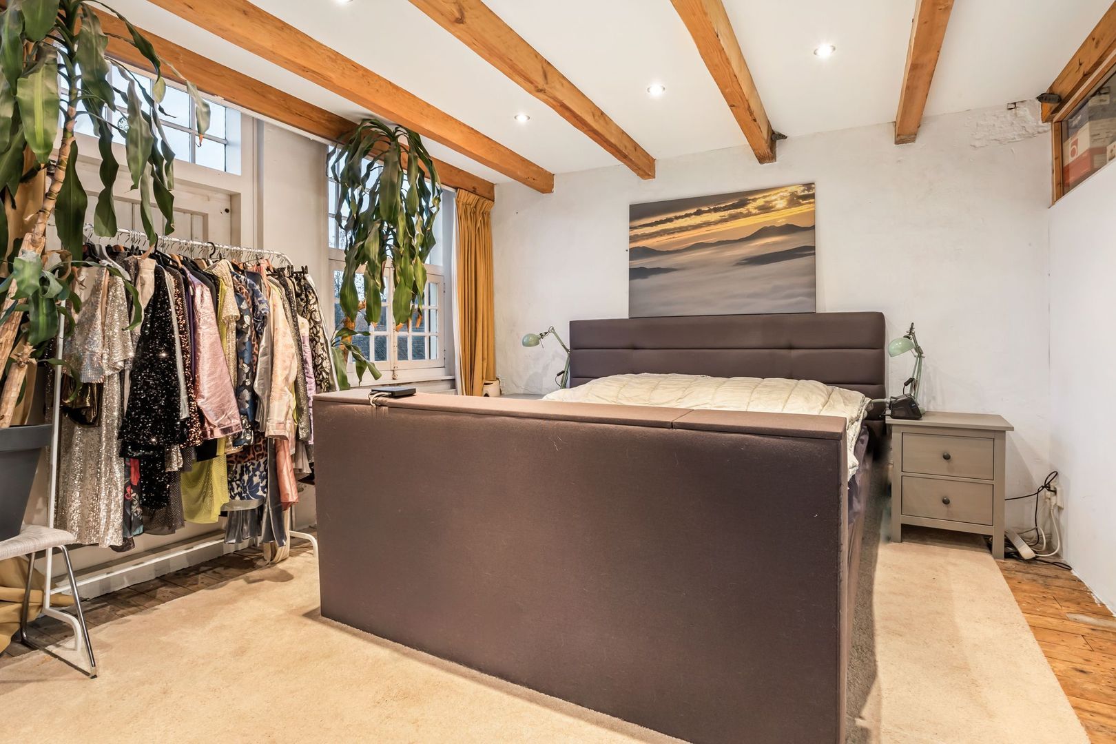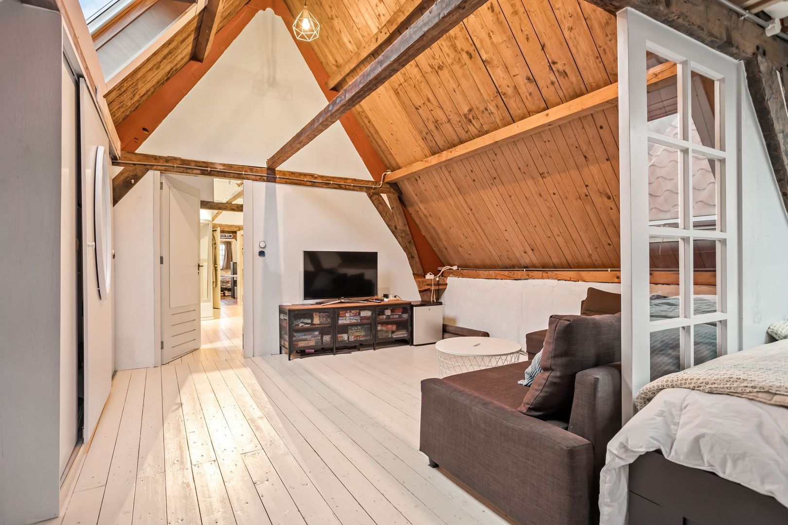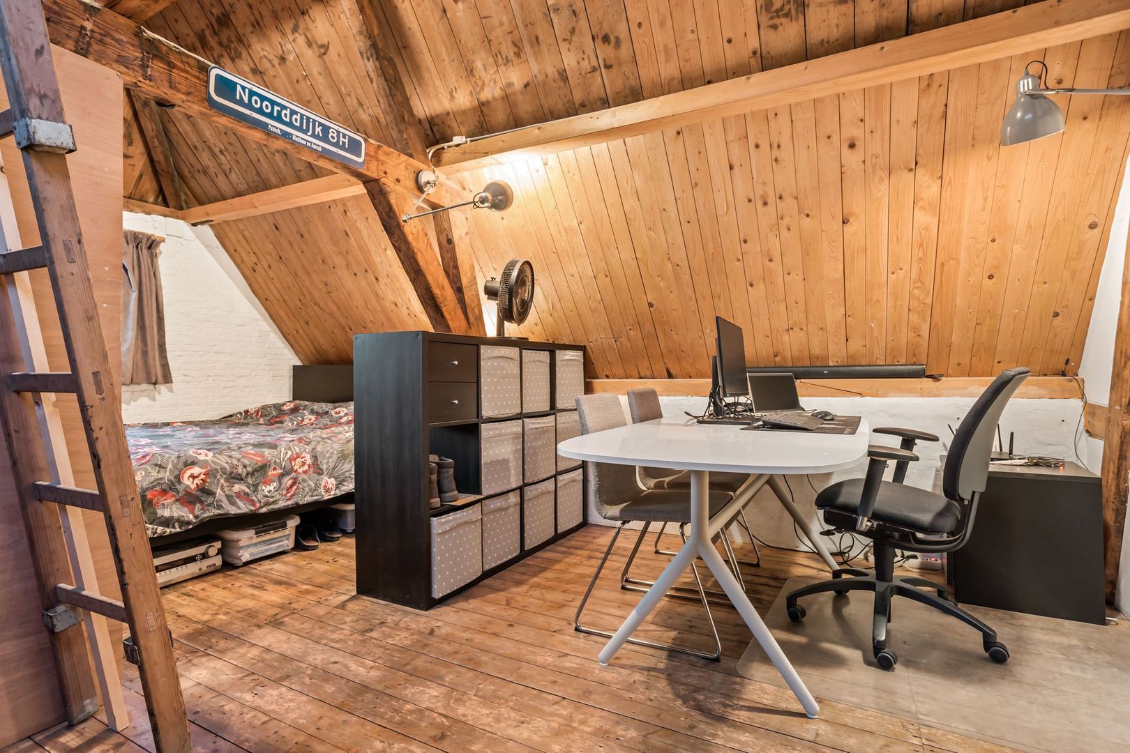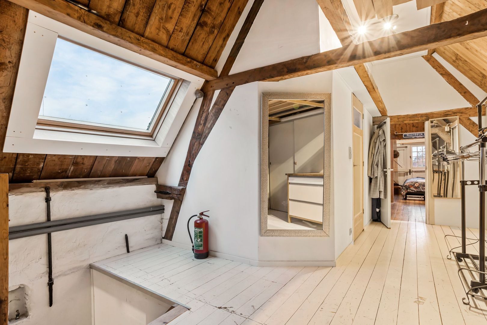 Royale overloop met grote kastenwand met veel bergruimte, door de diverse dakramen is er veel licht inval. Er is een 2e badkamer ook met dakraam met douchecabine, toilet, wastafel en handdoekenradiator. Aan de voorzijde is een slaapkamer van 28m² met dakraam en ramen aan de voorgevel. Daarnaast heeft het een vliering waar op geslapen kan worden. Er is een nokhoogte van ca. 4 m waardoor een behoorlijk ruimte werking ontstaat. Alle vloeren voorzien van wit uitgevoerde vloerplanken. Aan de achterzijde is een kamer van 23m² met dakraam, keuken opstelling met oven, koelkast en kookplaat. Deze kamer heeft originele vloerplanken die recent opgeschuurd en gelakt zijn.
