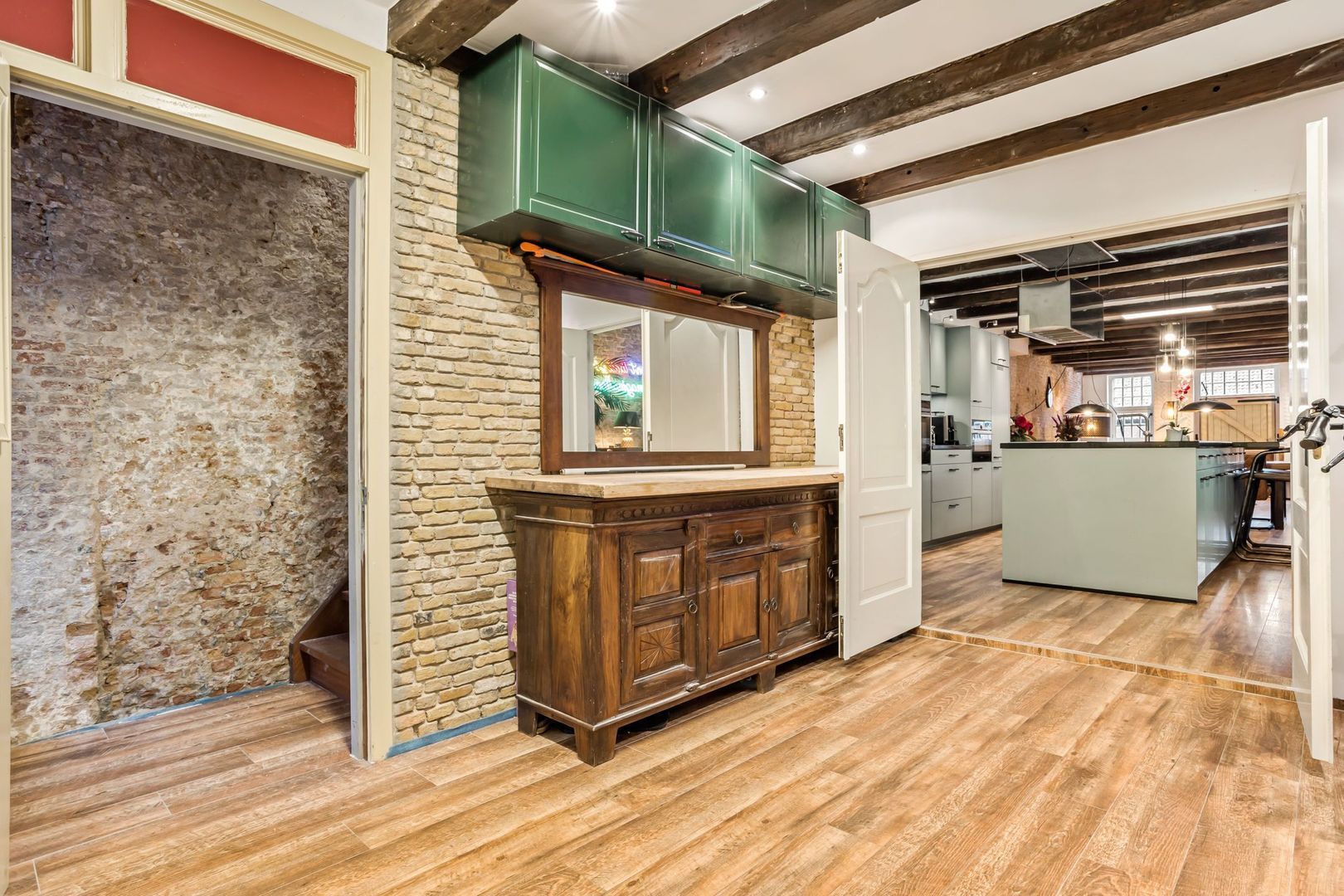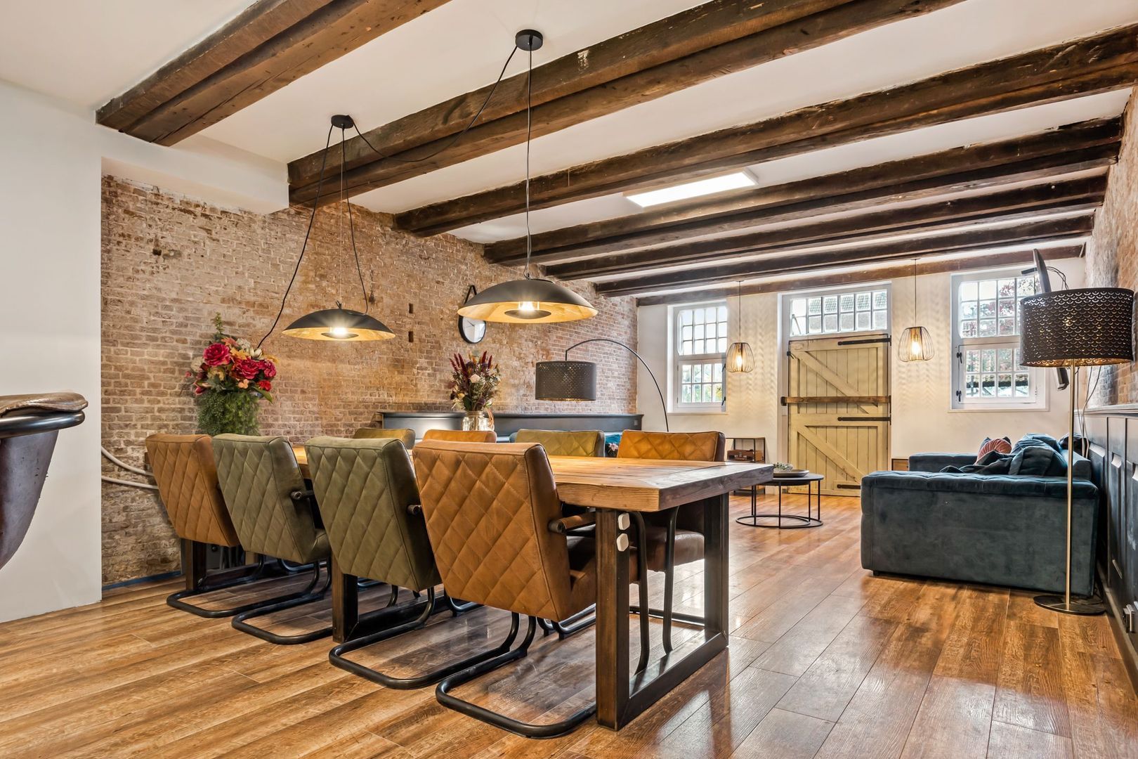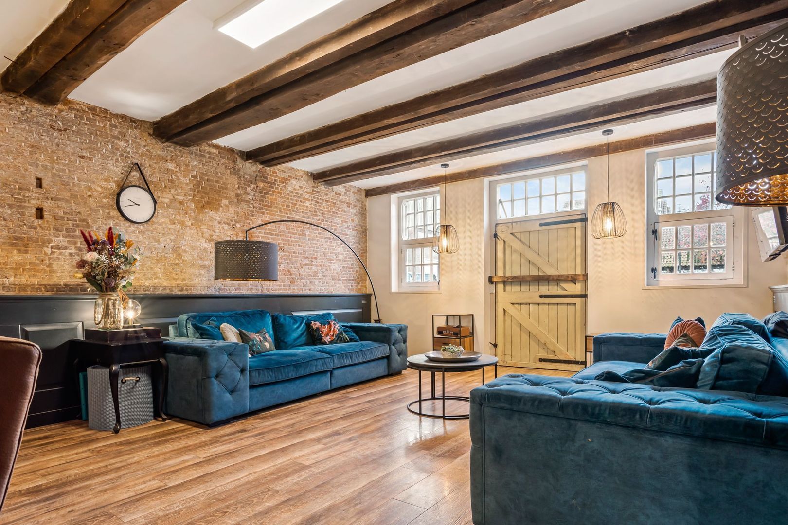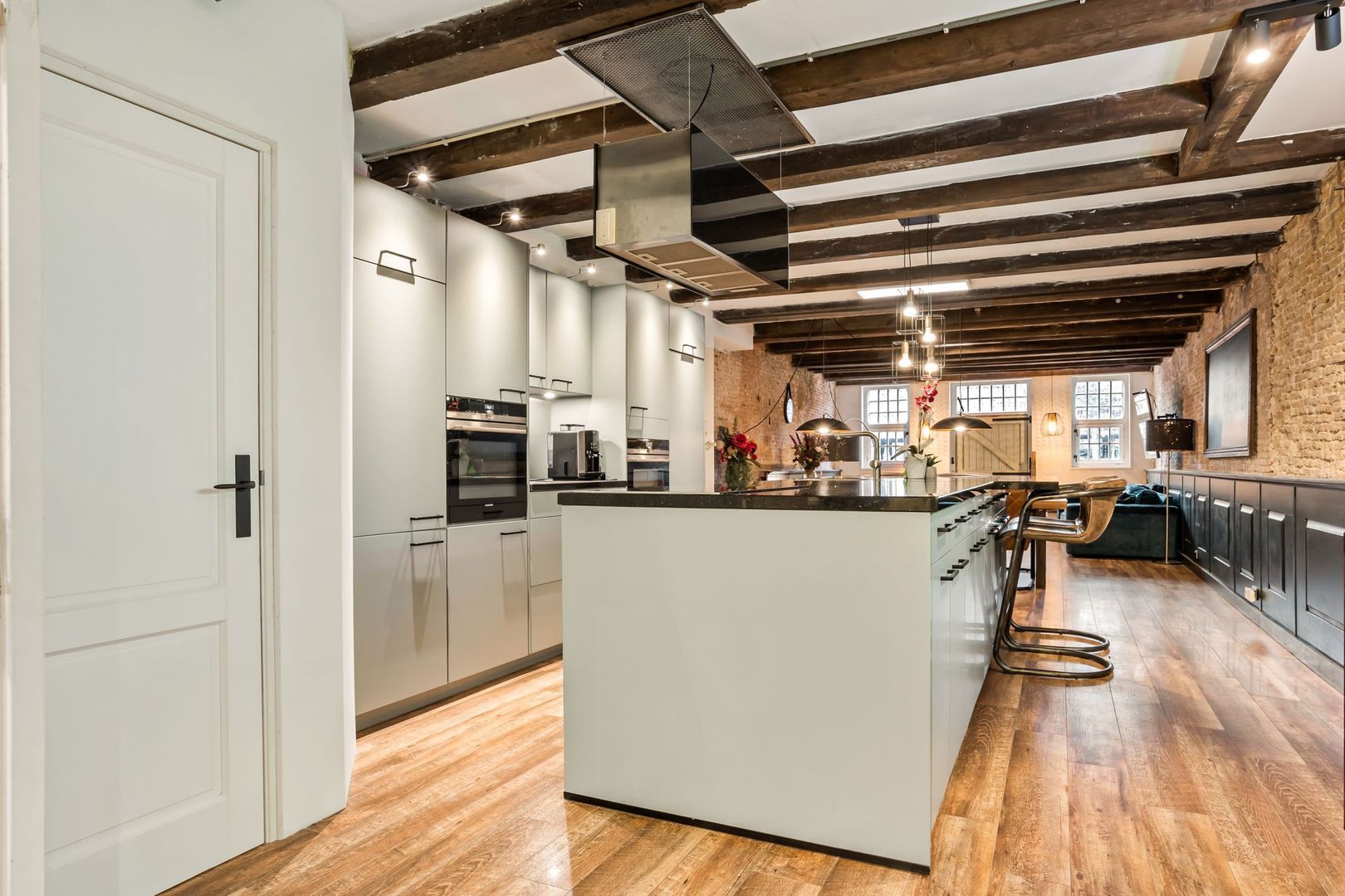 De woonkamer is voorzien van een fraaie houtlook plavuizen vloer met vloerverwarming. De wanden zijn deels bedekt met fraaie, op maat gemaakte lambrisering met daarboven de originele bakstenen wanden. De zichtbare draagbalken maken de authentieke sfeer compleet.