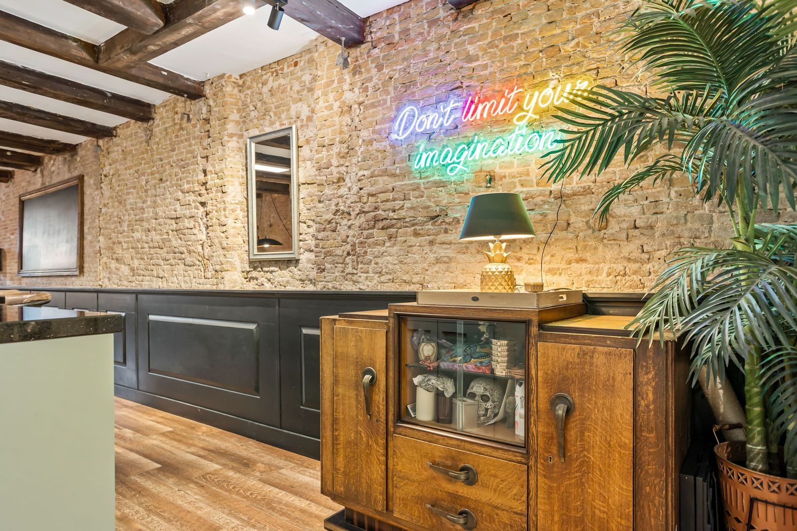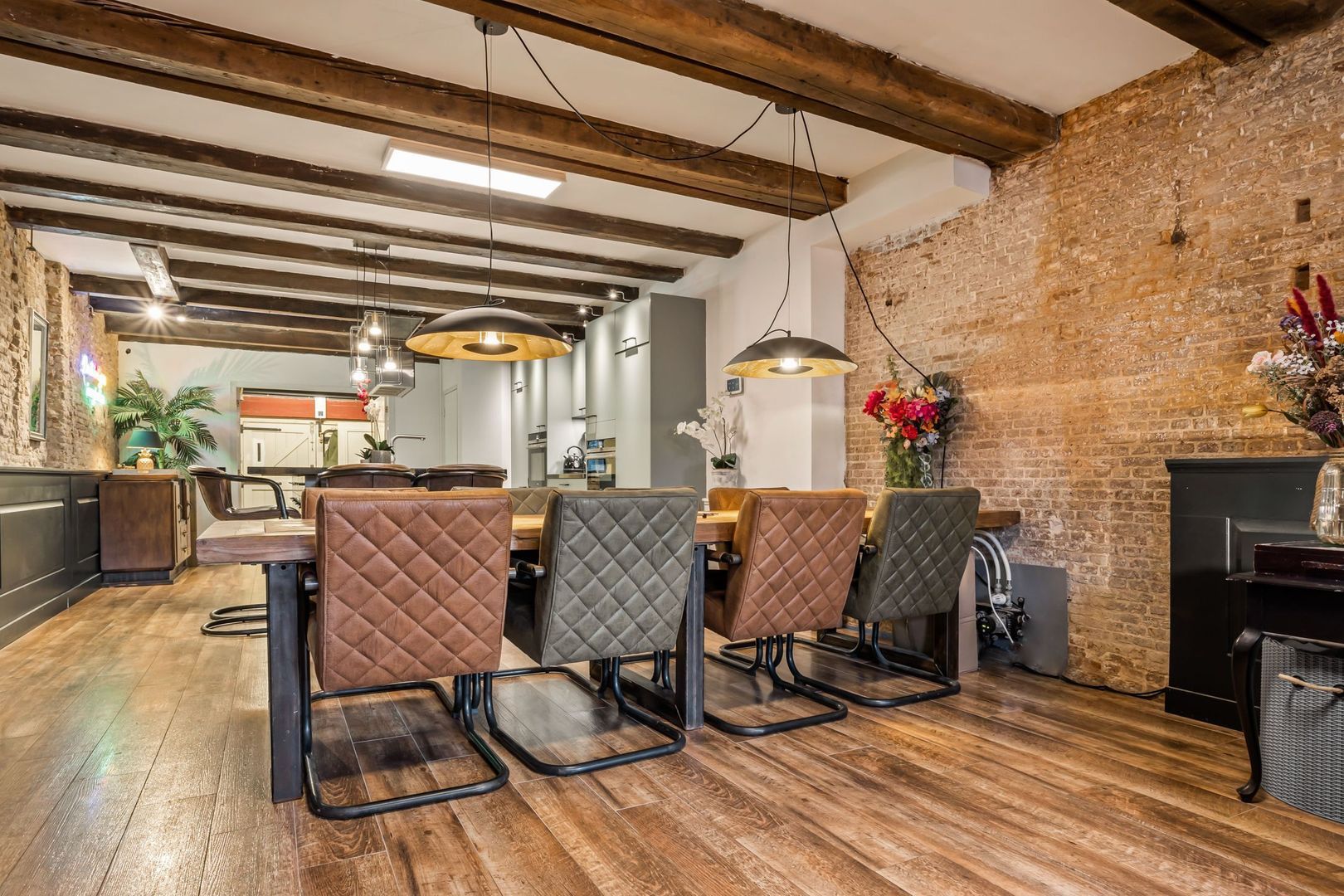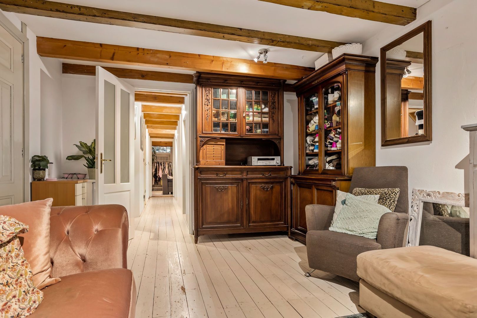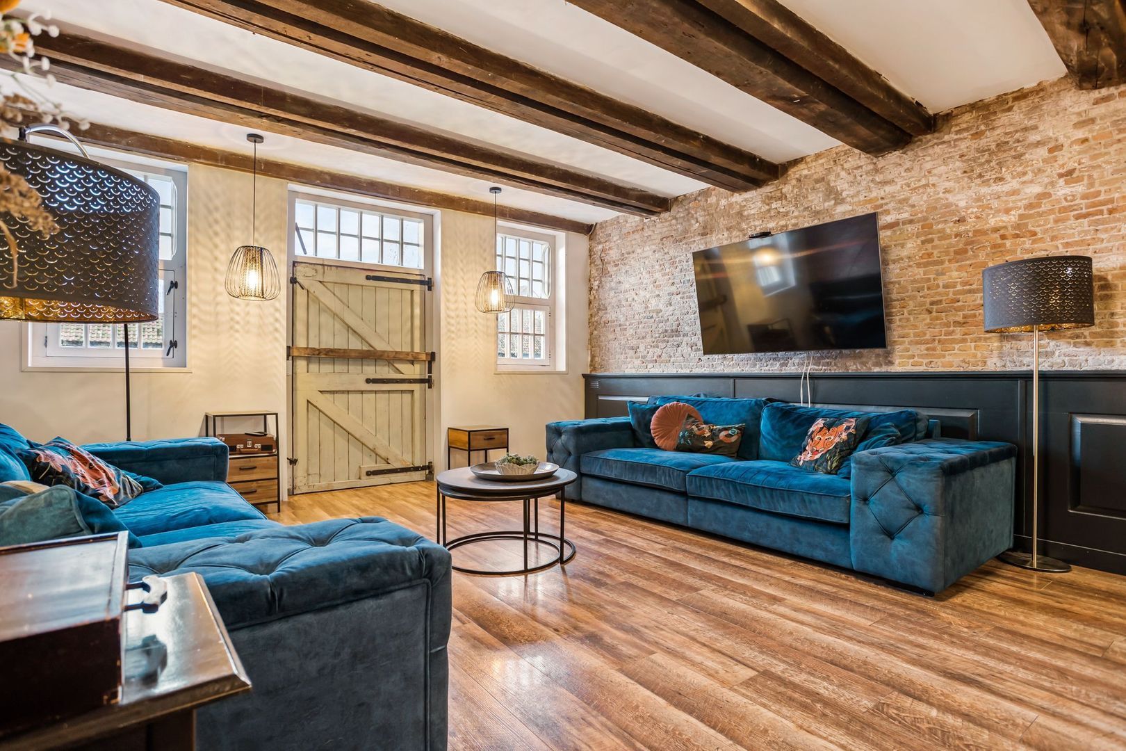De woonkamer is voorzien van een fraaie houtlook plavuizen vloer met vloerverwarming. De wanden zijn deels bedekt met fraaie, op maat gemaakte lambrisering met daarboven de originele bakstenen wanden. De zichtbare draagbalken maken de authentieke sfeer compleet.