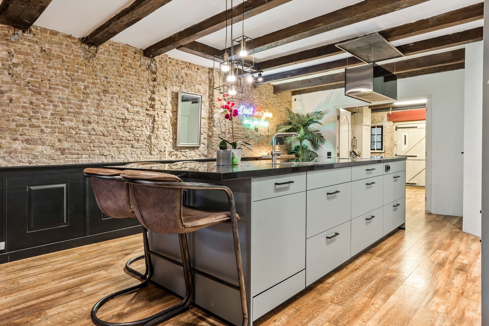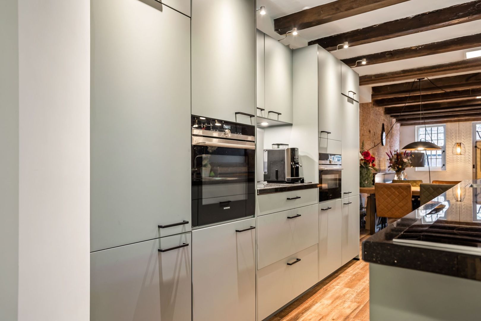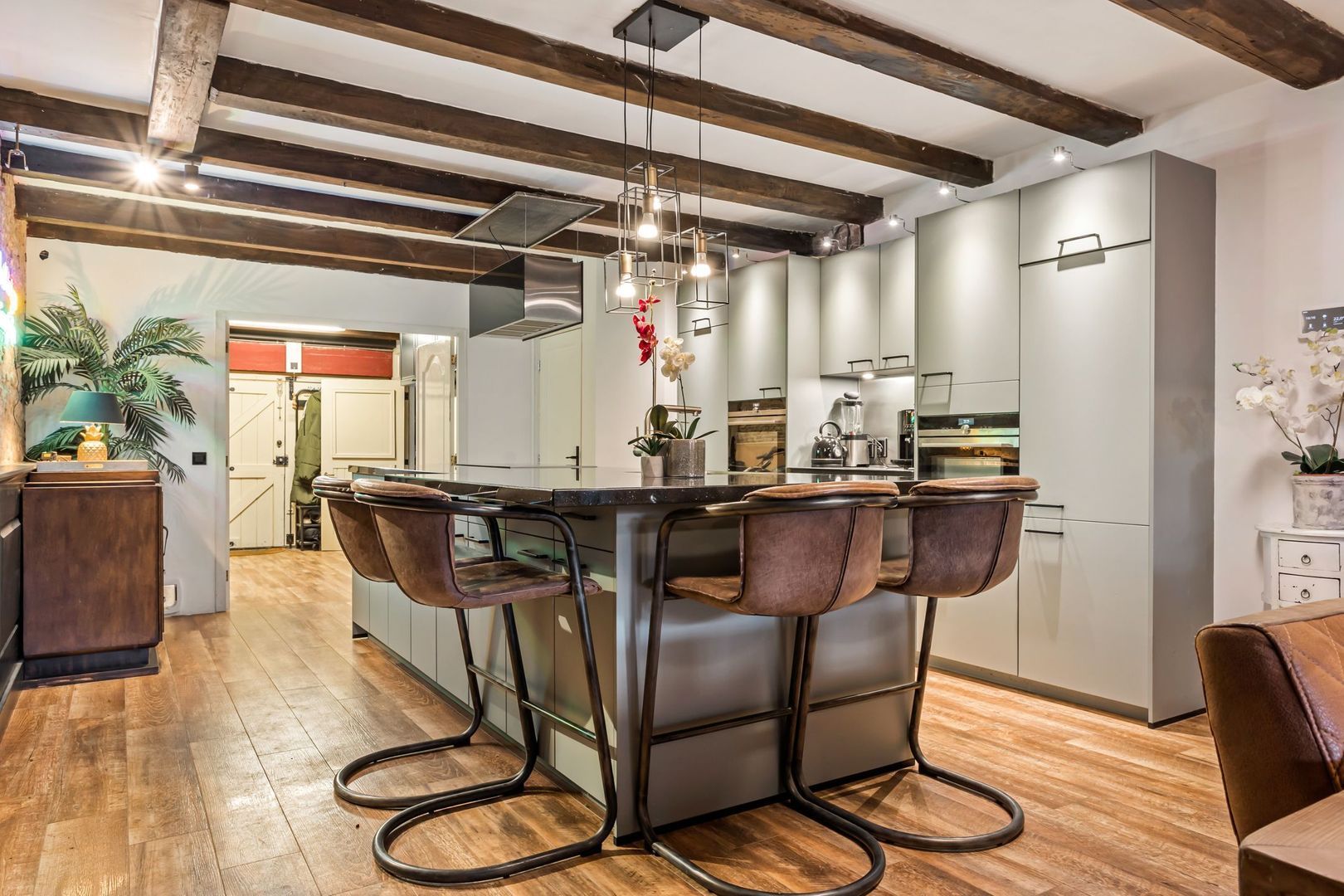 Er is gekozen voor een open keuken met een groot keukenblok en een ruim kookeiland met een granieten werkblad en een bar. De keuken is voorzien van ingebouwde oven, combi-oven, vaatwasser, inductie kookplaat, afzuigkap, grote koelkast en grote vriezer.