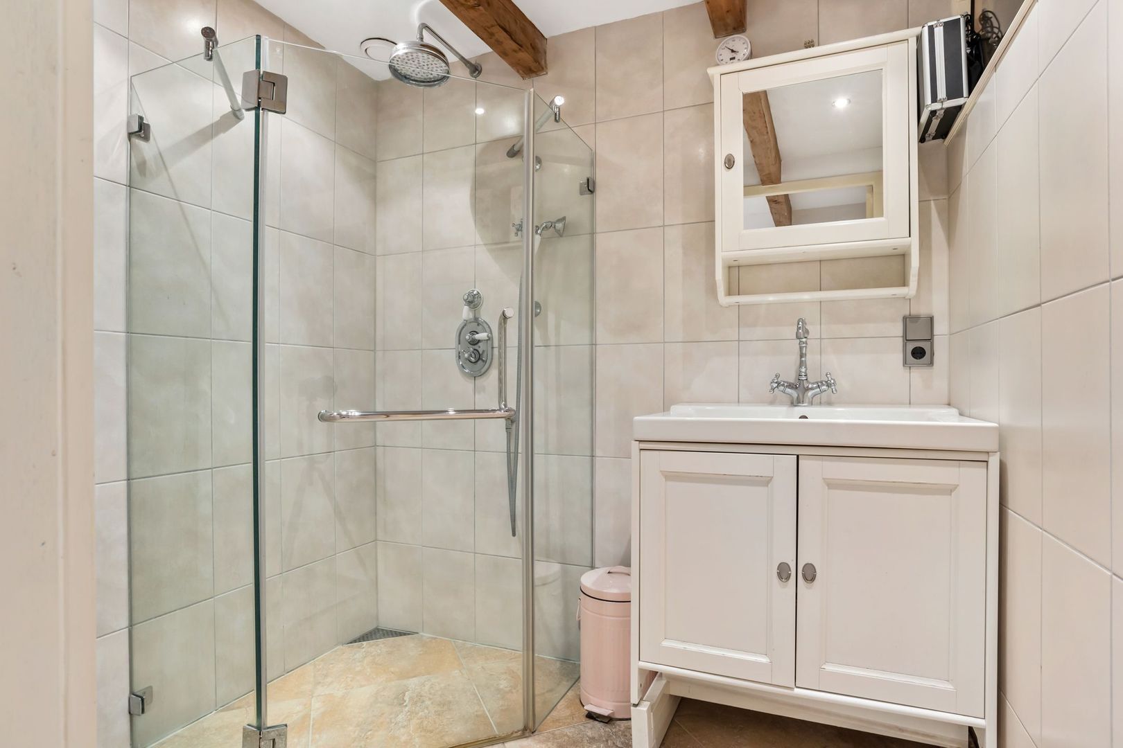 Tussen de kamers in vindt u een ruime overloop welke toegang geeft aan 2 ruime inloopkasten, een toiletruimte, de technische ruimte en de badkamer. De badkamer is geheel betegeld en voorzien van een inloopdouche met glazen spatscherm en een wastafel in fraai meubel.