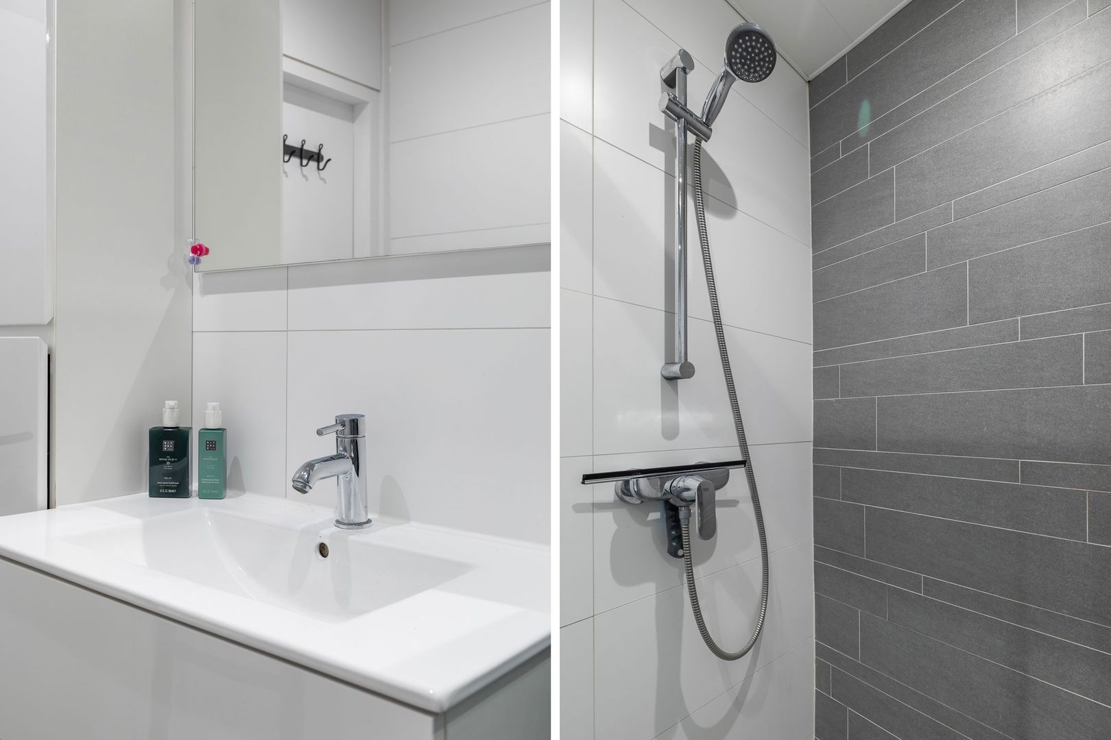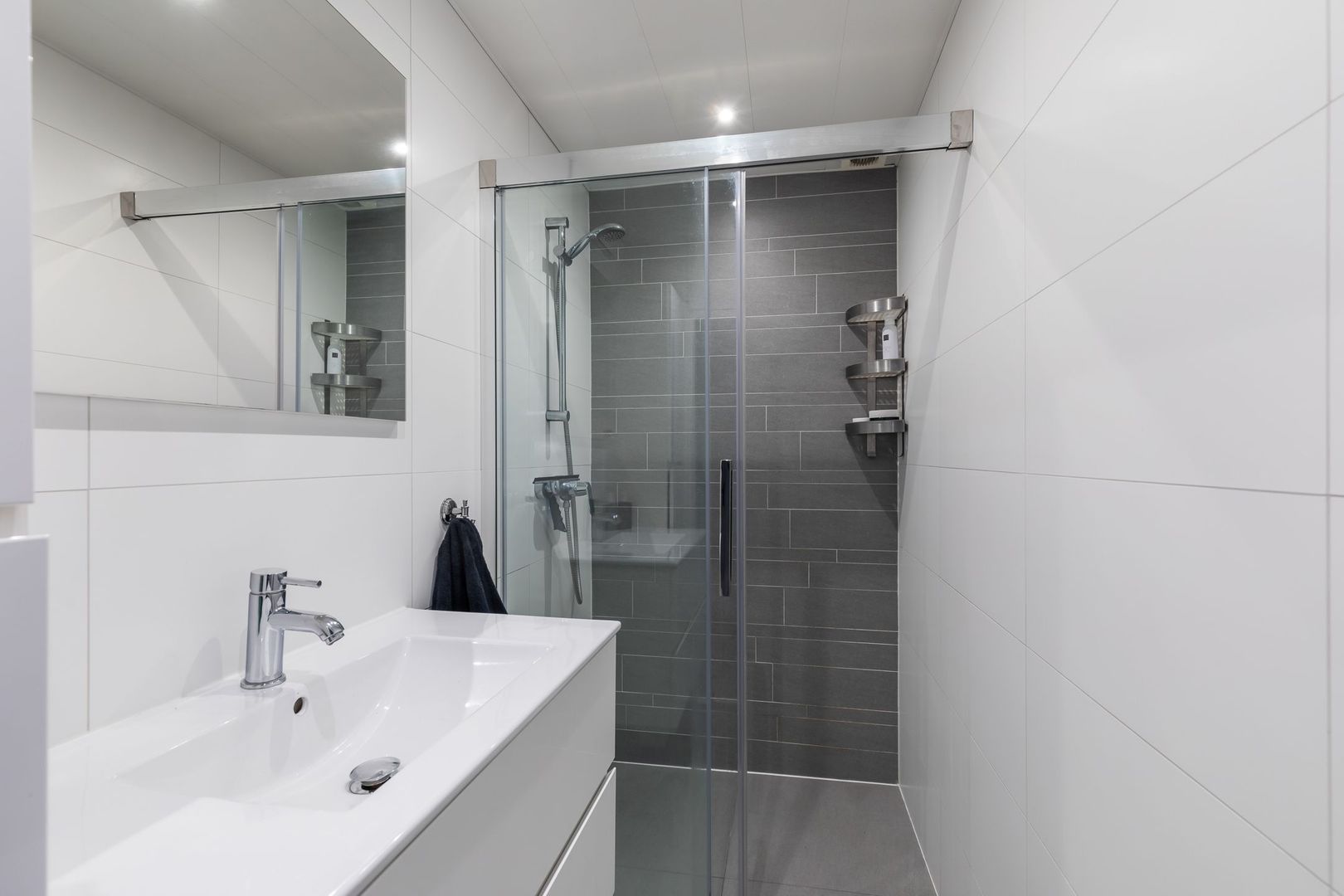 Moderne, verzorgde volledig betegelde badkamer met inloopdouche met scherm, thermostaatkraan, wastafelmeubel, moderne grijze vloertegel en grote strakke witte wandtegel tot het verlaagde plafond, dat is voorzien van inbouwspots.