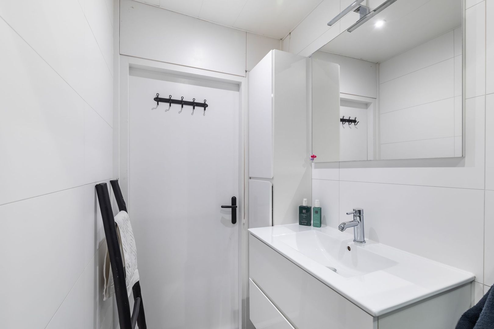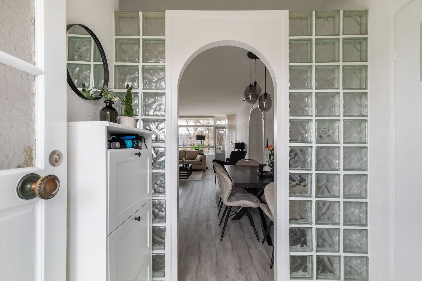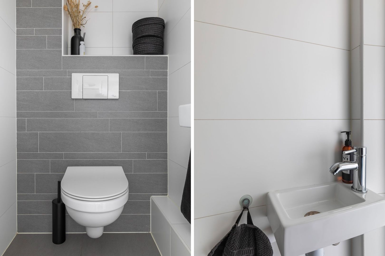 Entree woning met ruime hal met meterkast, garderobe en in 2017 vernieuwd, geheel betegelde toiletruimte met zwevend toilet, fonteintje met meubel en verlaagd plafond met inbouwspots.