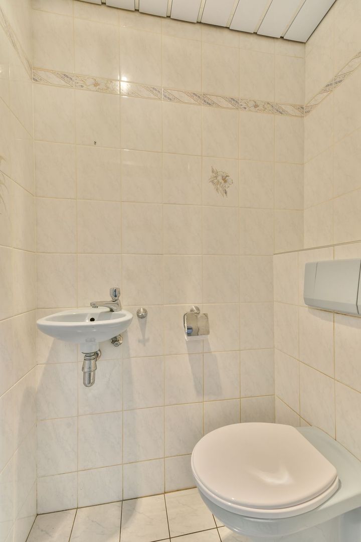 Entree, hal met entresol, meterkast, toiletruimte met zwevend toilet, fonteintje en volledig tot het plafond betegeld.