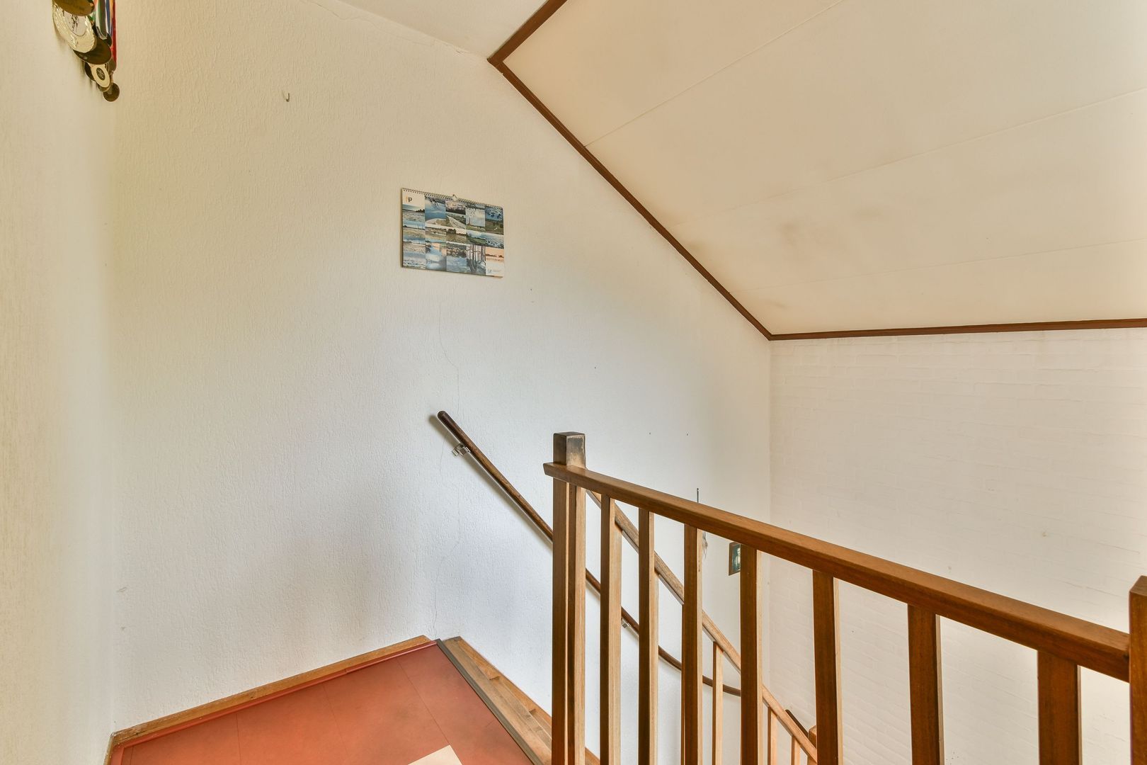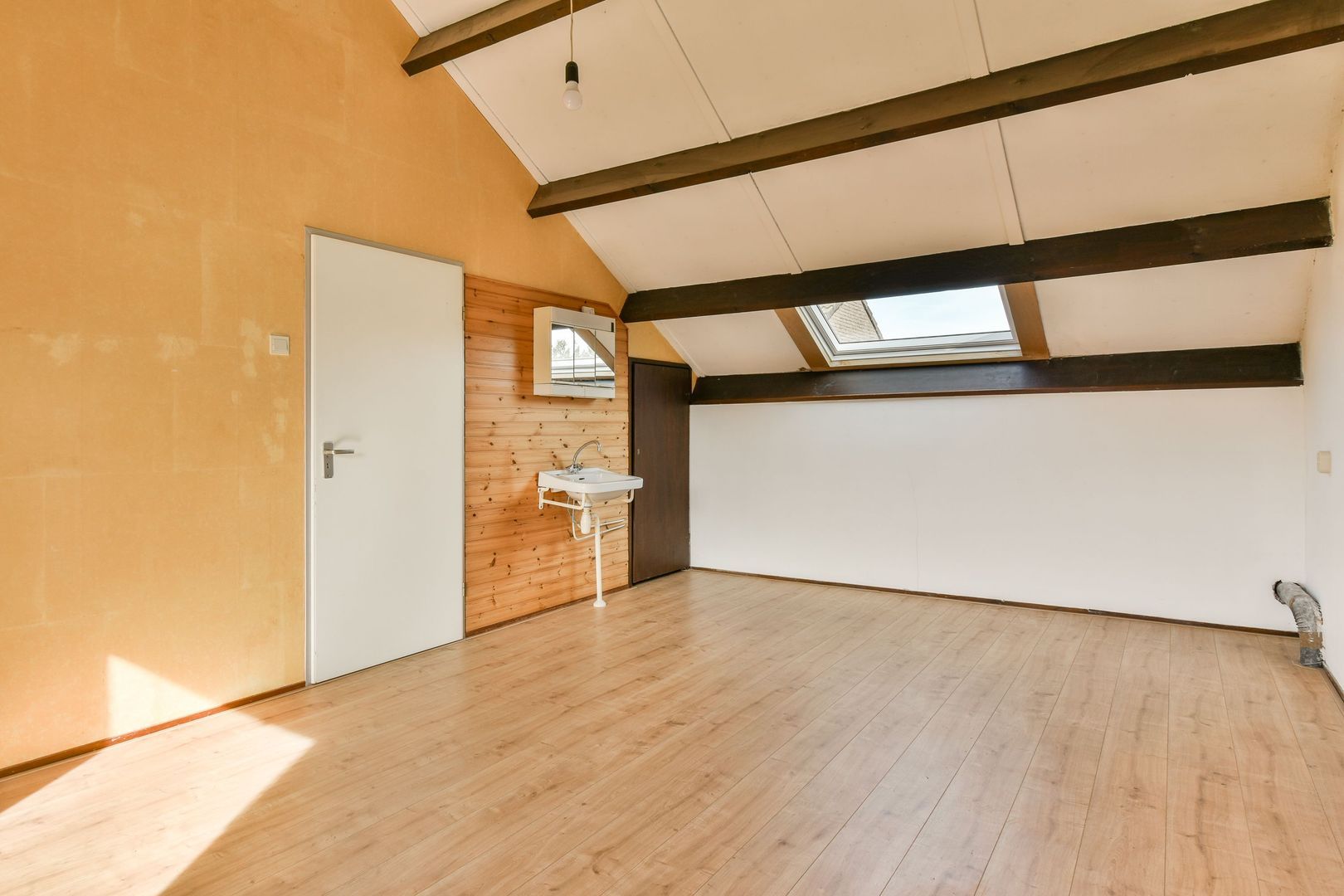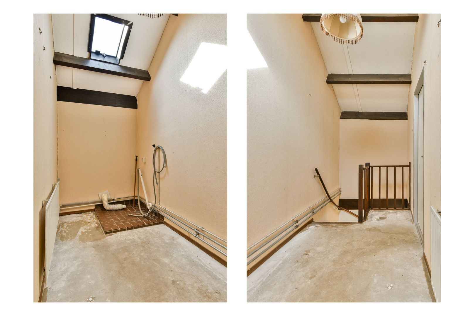 Overloop met veel bergruimte, aansluiting wasmachine, grote zolderkamer van ca. 18 m2 met nieuw dakraam (2020), wastafel, bergruimte in de schuine schotten en opstelling CV-ketel.