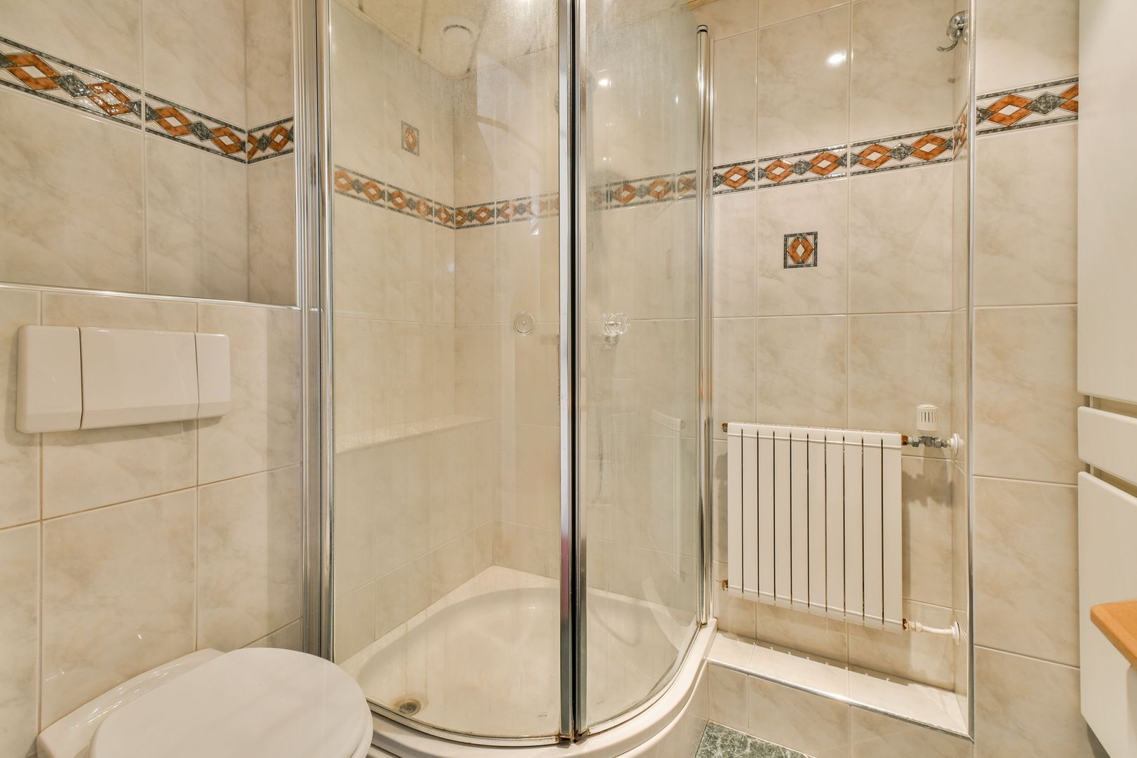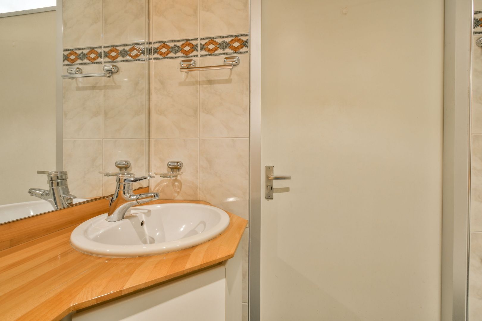 Bereikbaar via de hardhouten trap met entresol, overloop, eenvoudige badkamer met zwevend toilet, douchecabine, badkamermeubel en systeemplafond.