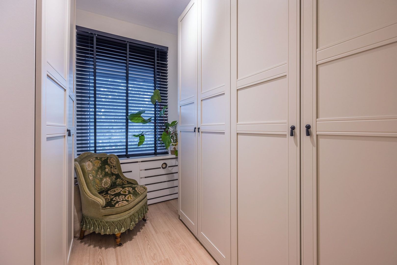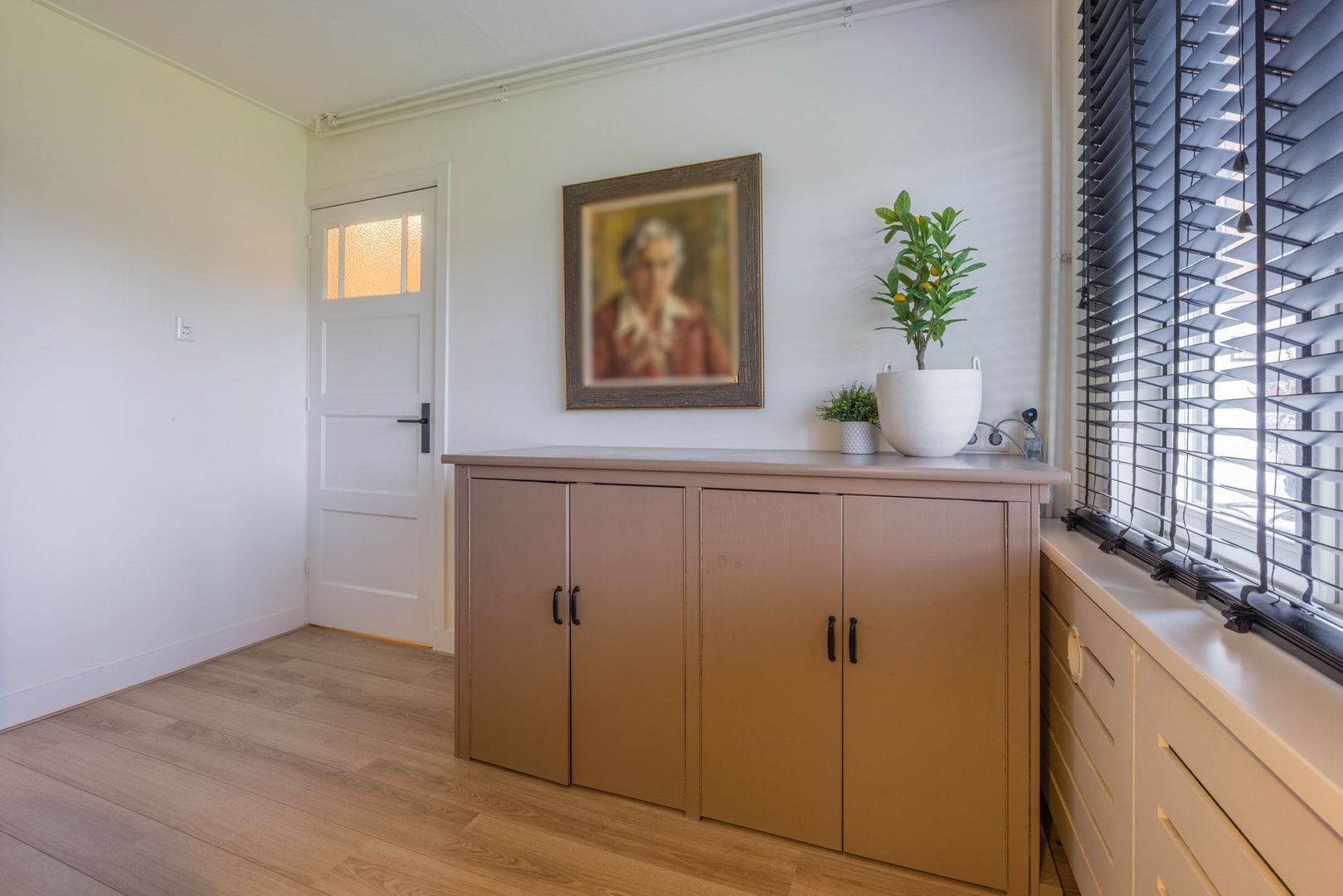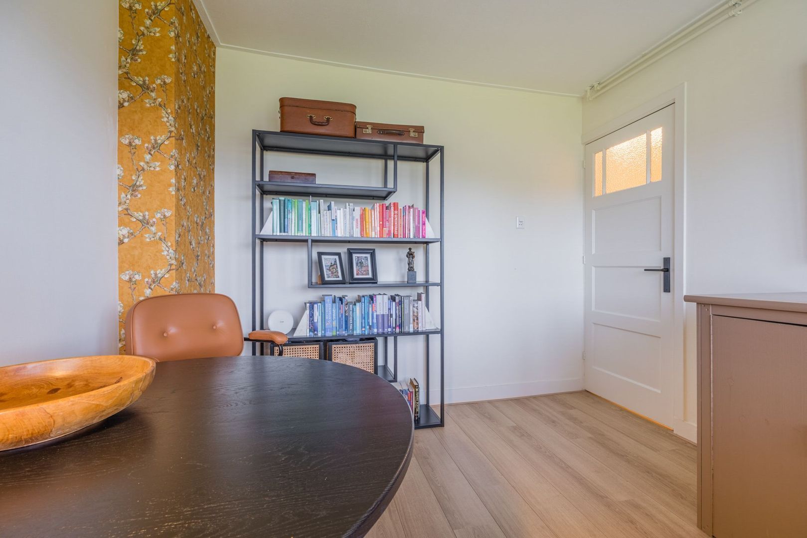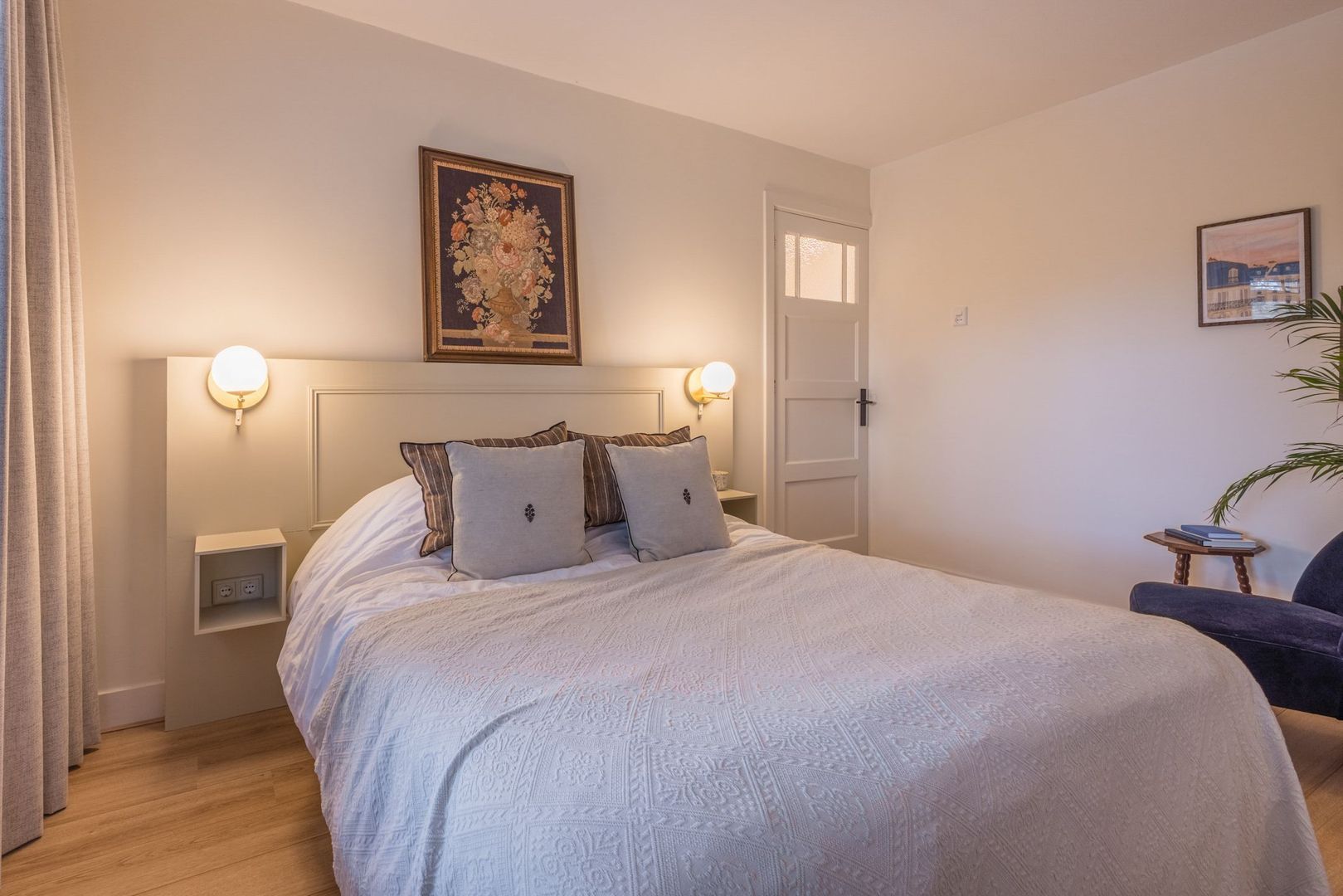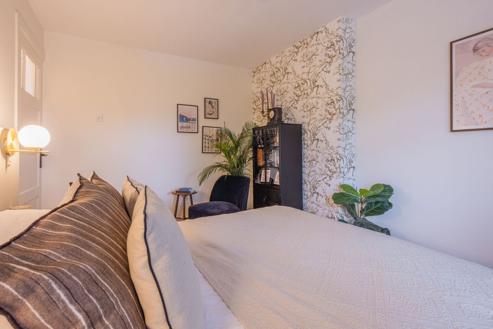 Aan de achterzijde ligt de 3e slaapkamer van ca. 10 m2 met een handige kast met opstelling voor de wasmachine en de droger. De wanden en plafonds zijn glad gestuukt en de vloer is voorzien van moderne laminaatvloer. De mooie paneeldeuren zijn authentiek.