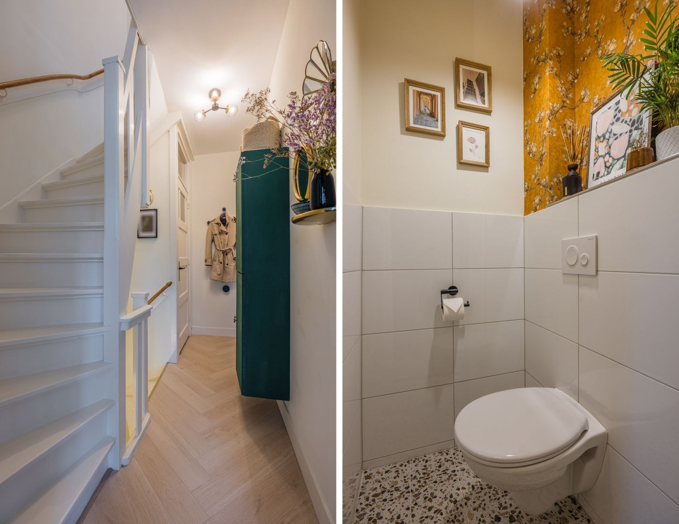 Overloop met visgraat vloer, moderne toiletruimte met zwevend toilet en witte wandbetegeling, mooie stalen glasdeur naar de woonkamer.