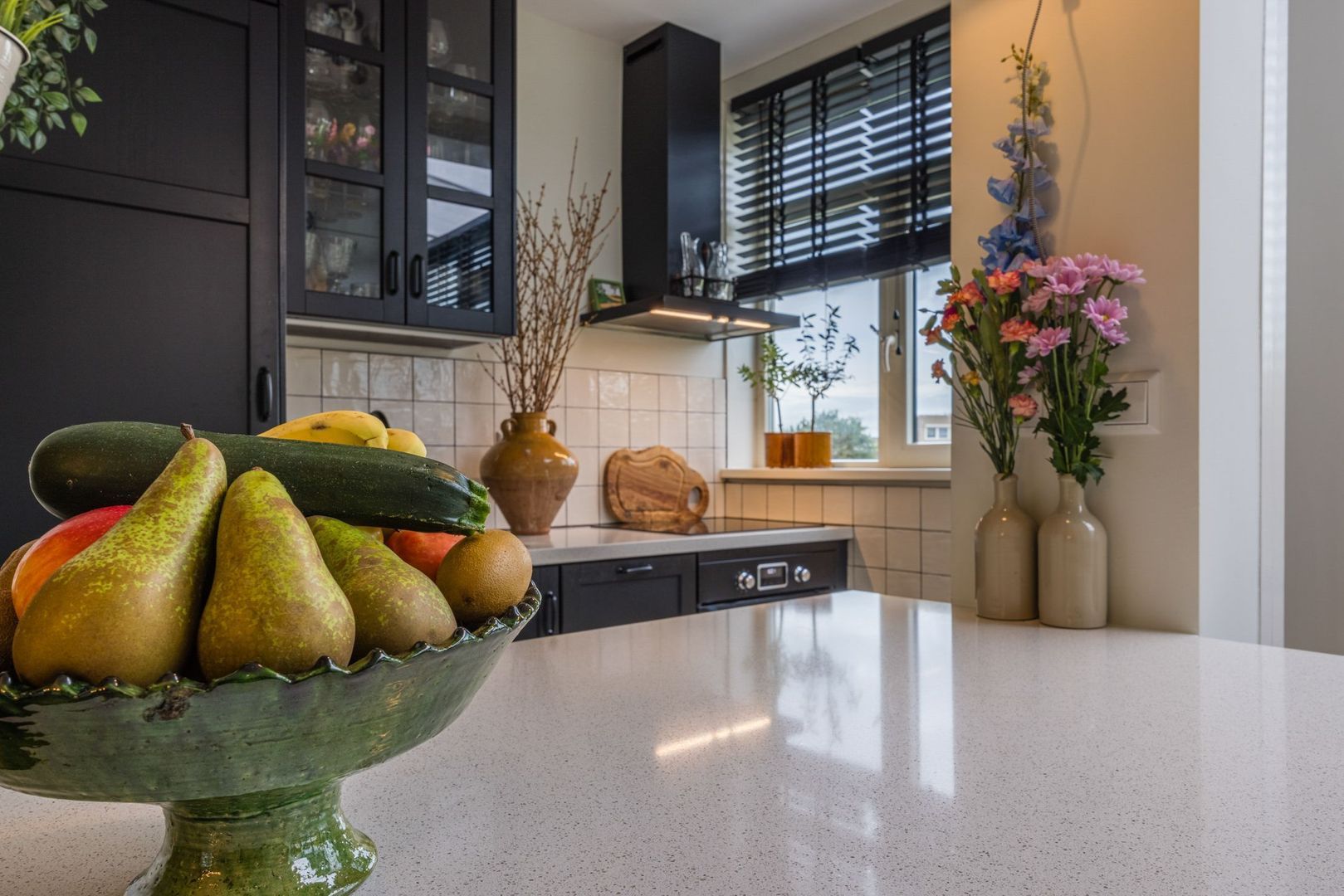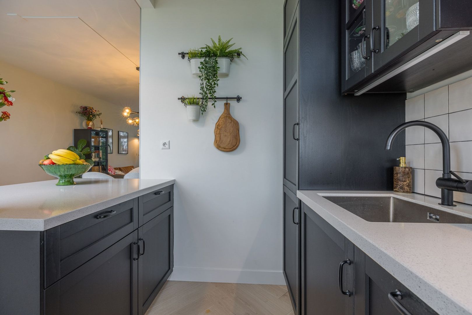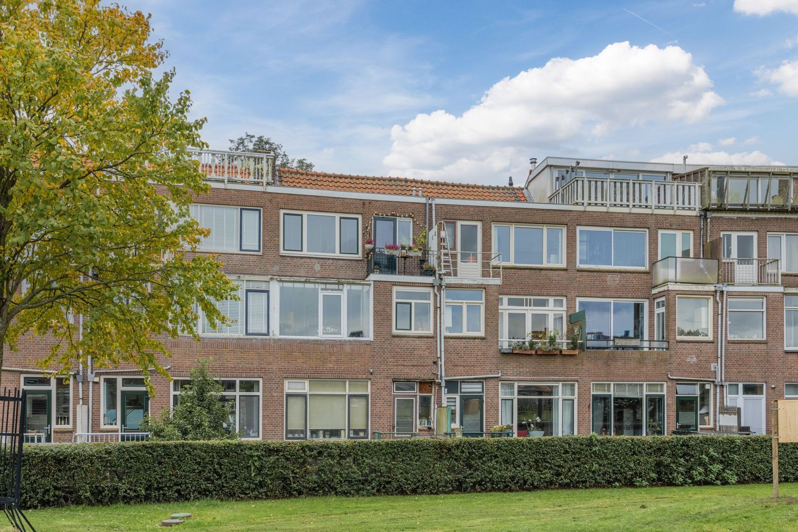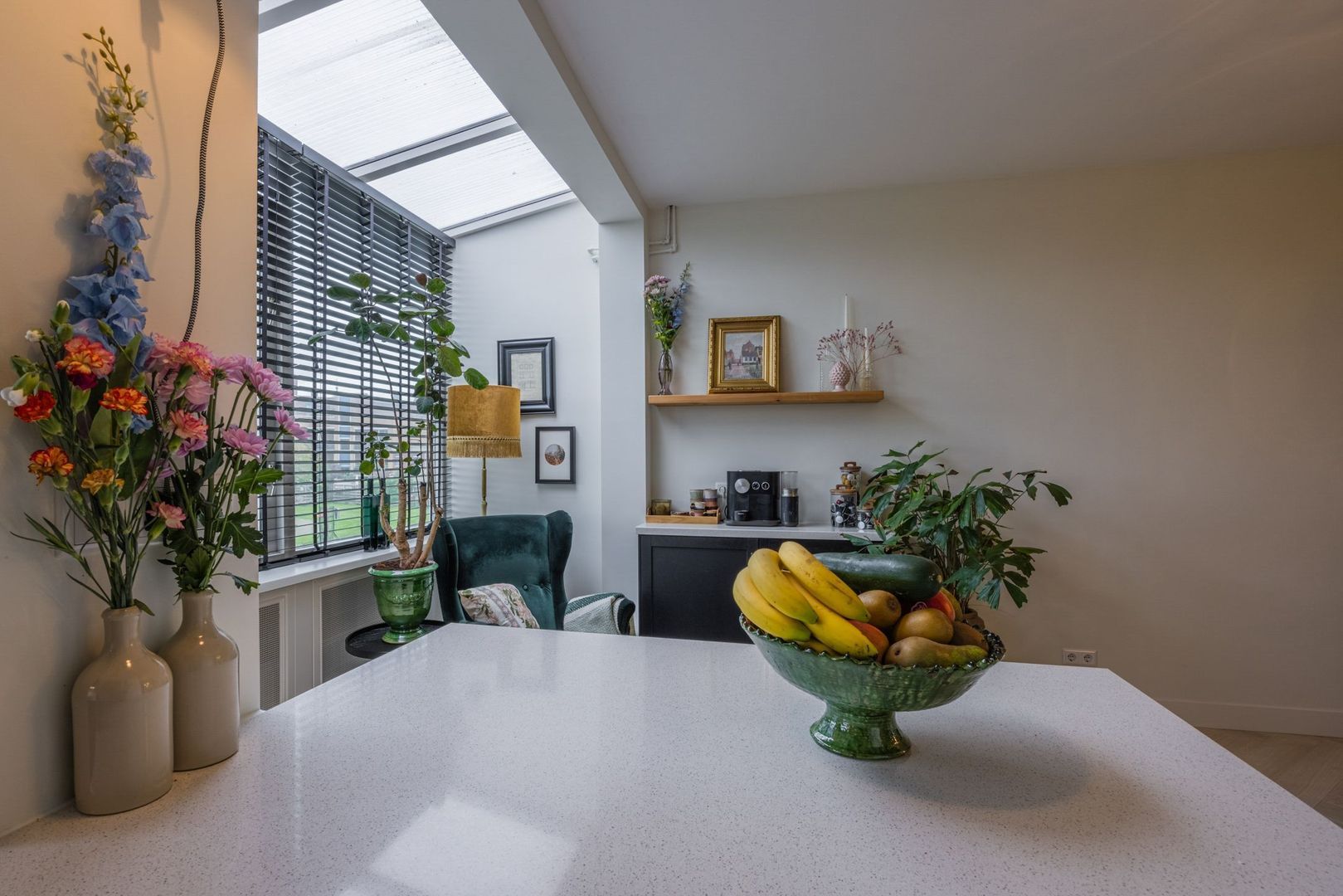 Royale woonkamer met open keuken van totaal ca. 39 m2 met laminaatvloer met geïsoleerde ondervloer, sfeervolle lambrisering, grote kunststofkozijnen met breed uitzicht op de boomrijke Maassluissedijk, gestucte wanden en strak plafond.