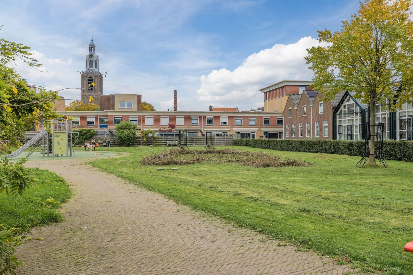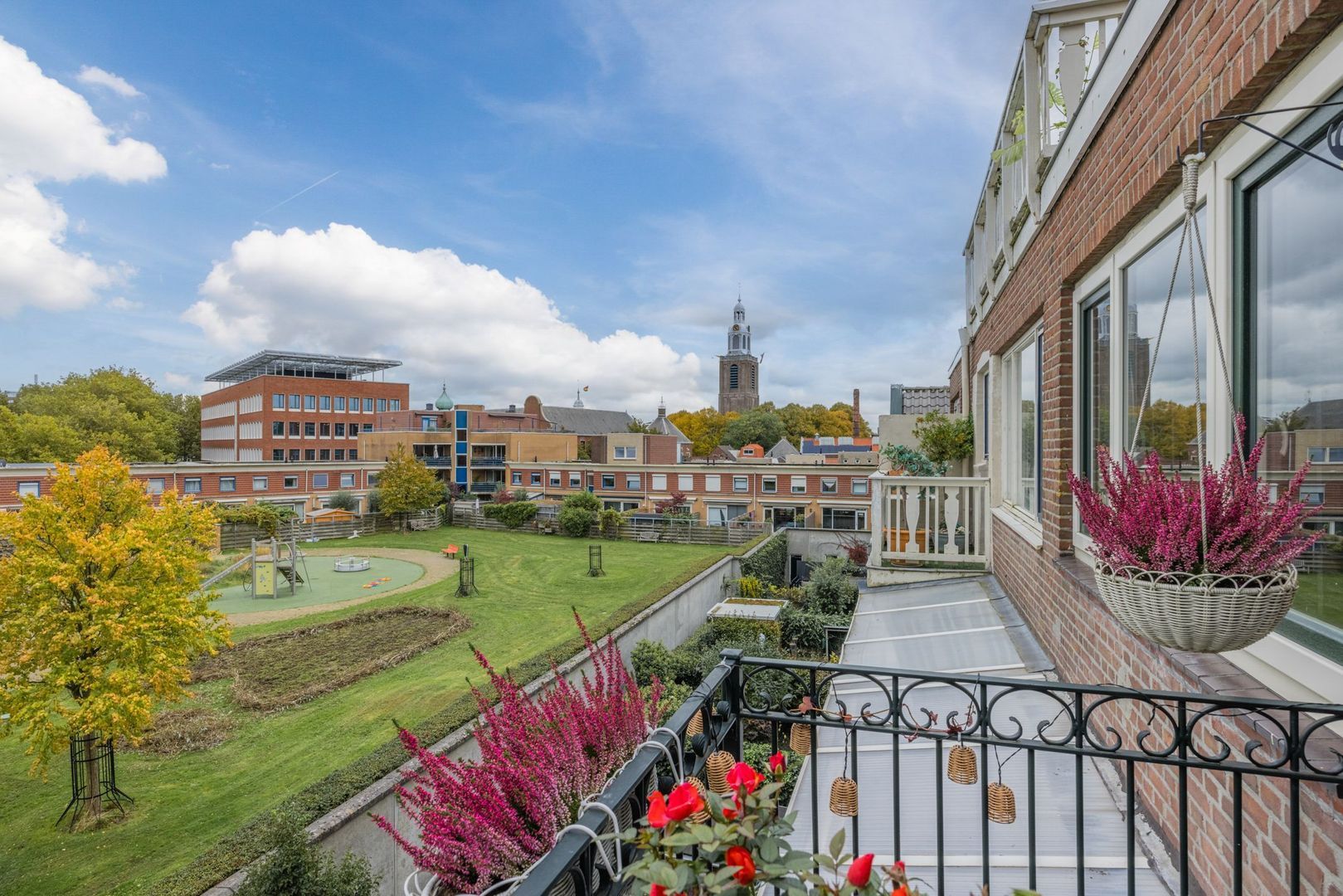 Balkon van ca 2,5 m2 met houten vlonders en vrij uitzicht, onder andere naar de Grote Kerk en het stadhuis.