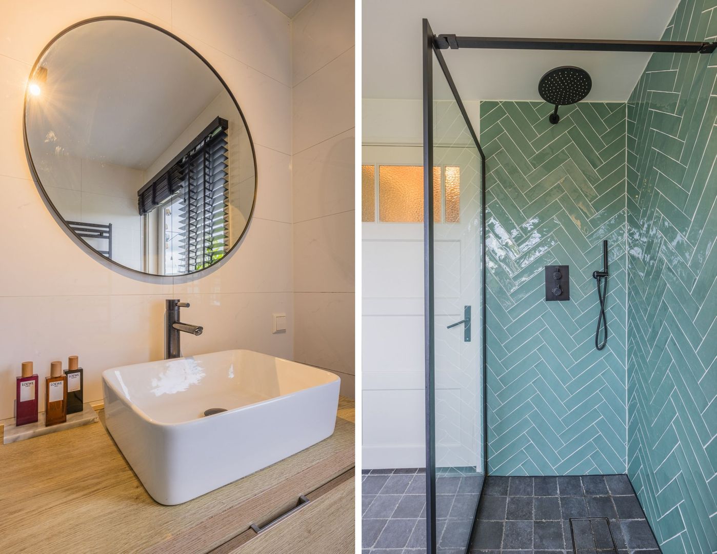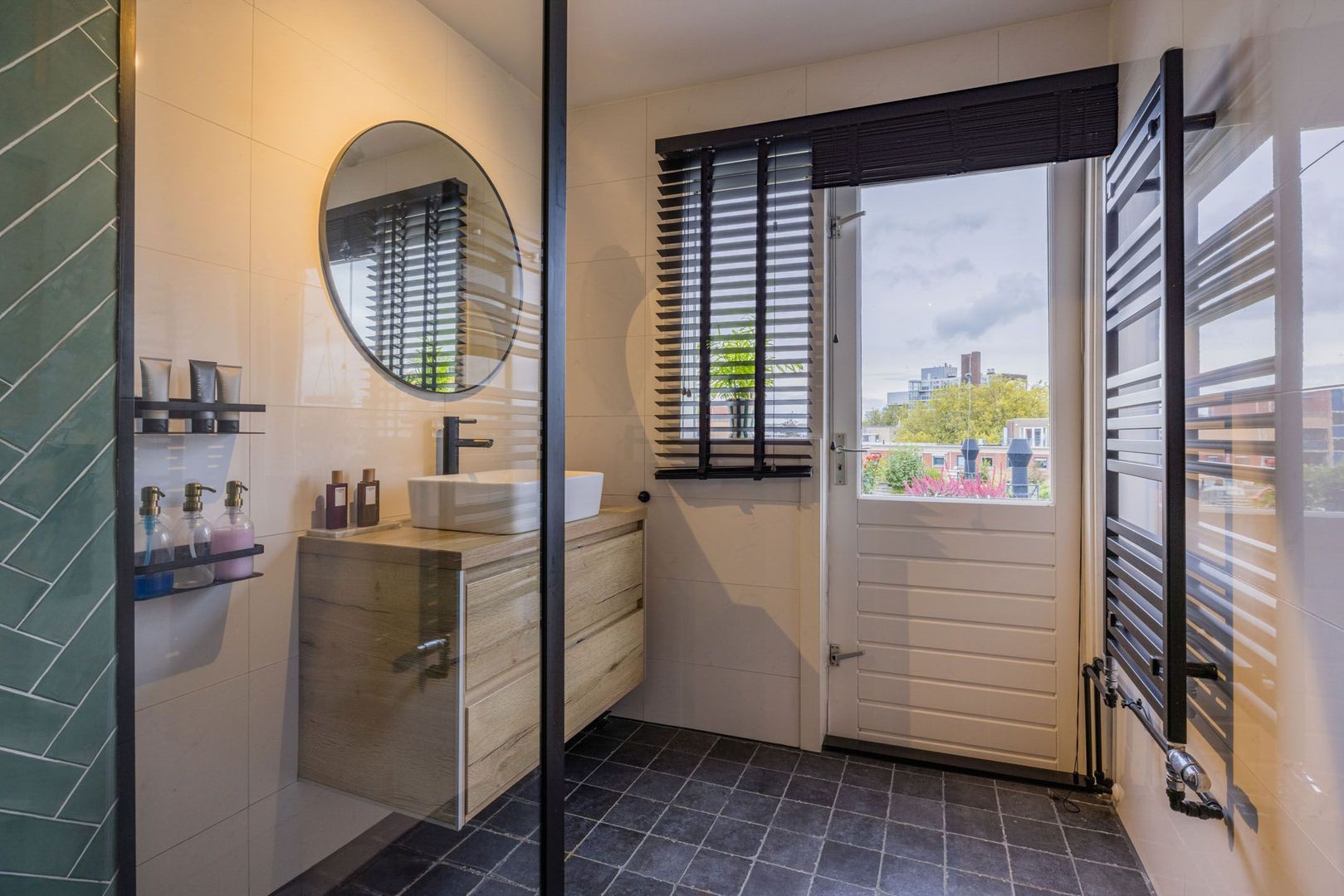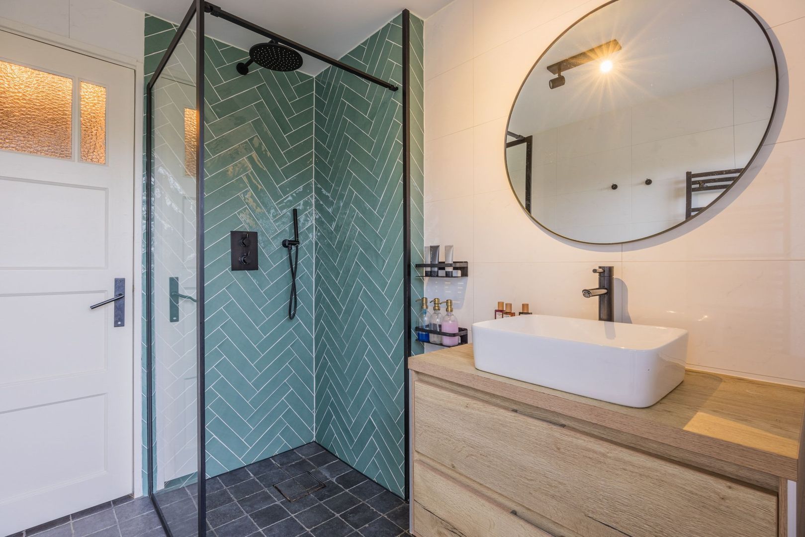 Aan de achterzijde is de mooie sfeervolle badkamer met moderne betegeling, lekkere inloopregendouche, wastafelmeubel, handdoekradiator, hardstenen vloertegel en deur naar balkon.