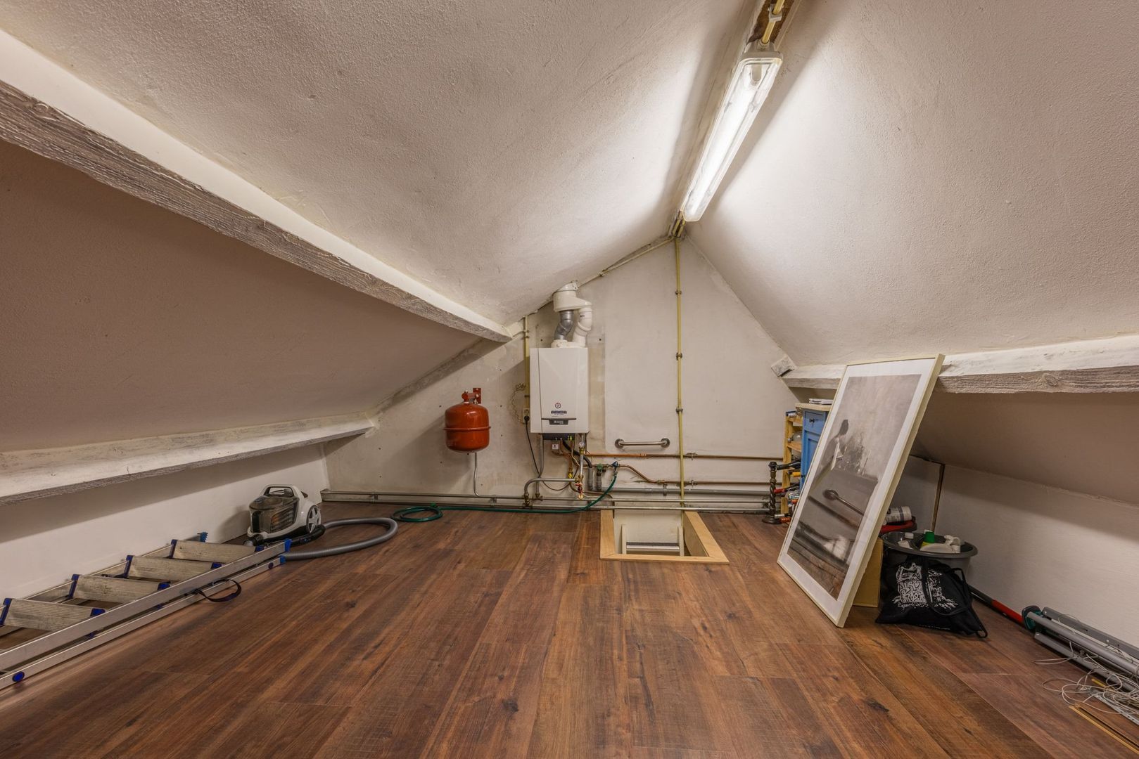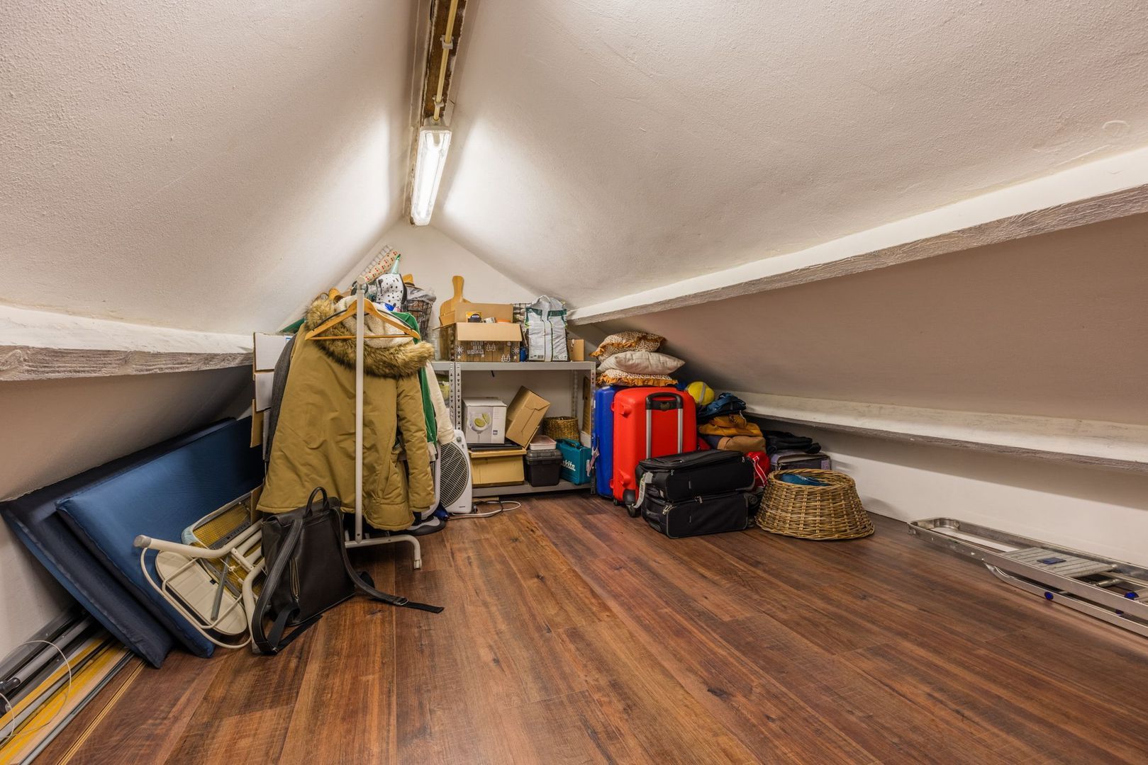 Vanaf de overloop is - via een kast - de vliering bereikbaar. De vliering heeft een nokhoogte van ca. 180 cm, ca. 17 m2 vloeroppervlakte. De ruimte is netjes afgewerkt met een laminaatvloer, geïsoleerd en de CV ketel opstelling is hier.