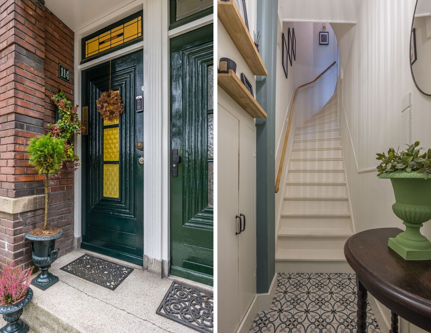 Entreehal met meterkast, leuke Portugese vloertegel en strak witgelakte trapopgang.