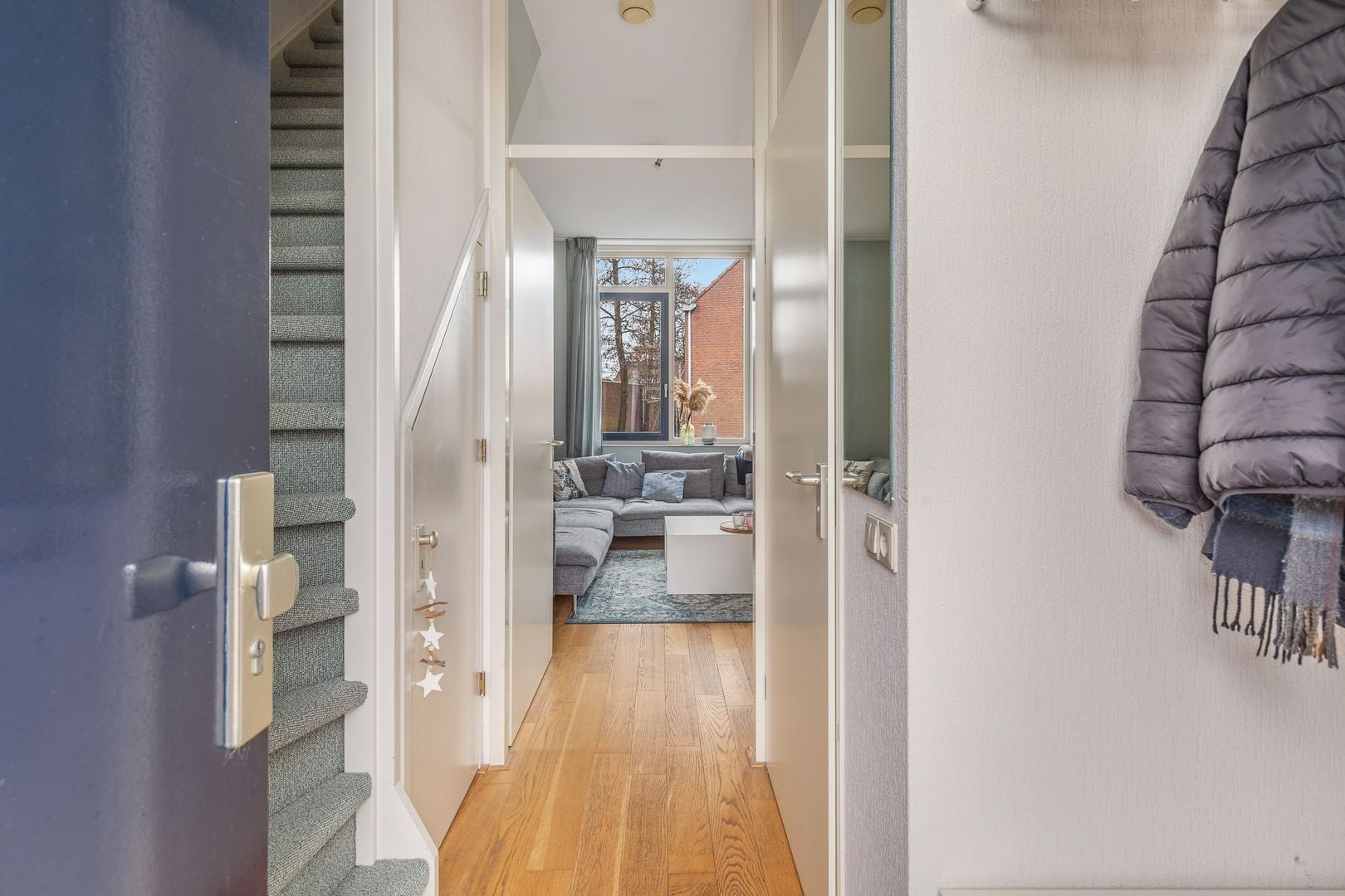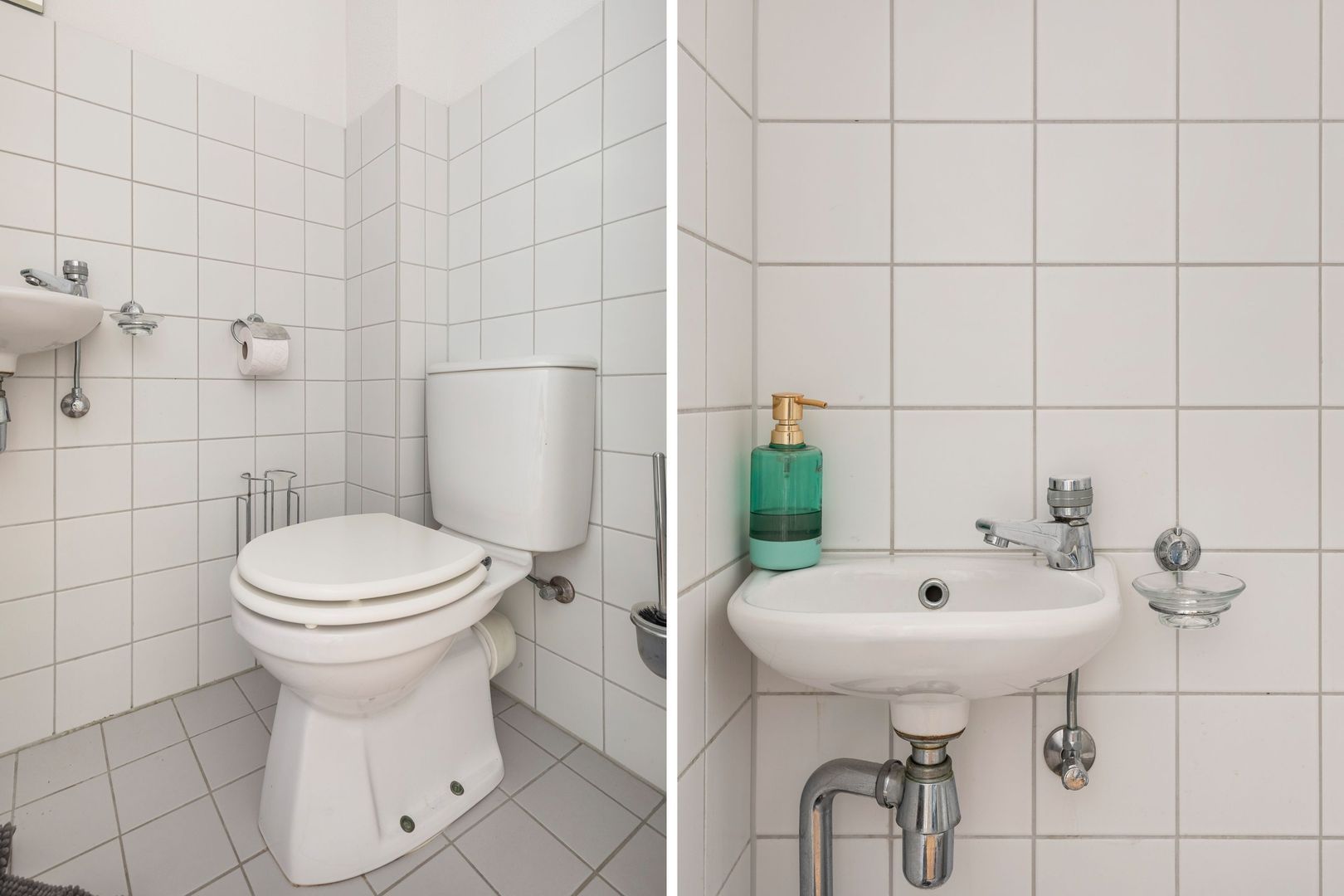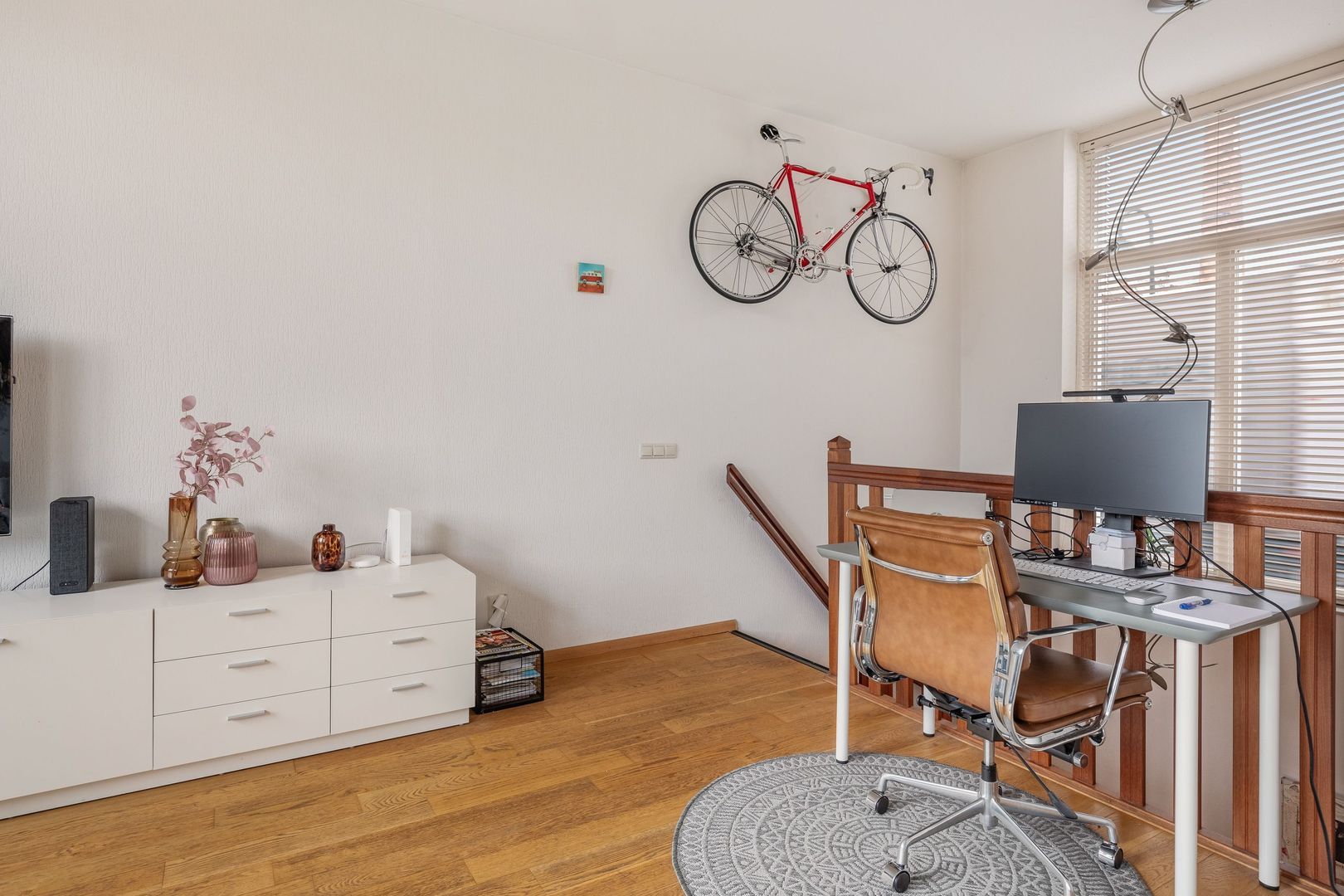 Entree met meterkast, trapkast en toilet met fontein. Ruime, lichte woonkamer met ramen aan beide zijden. De vide biedt uitzicht op de lager gelegen eetkeuken.