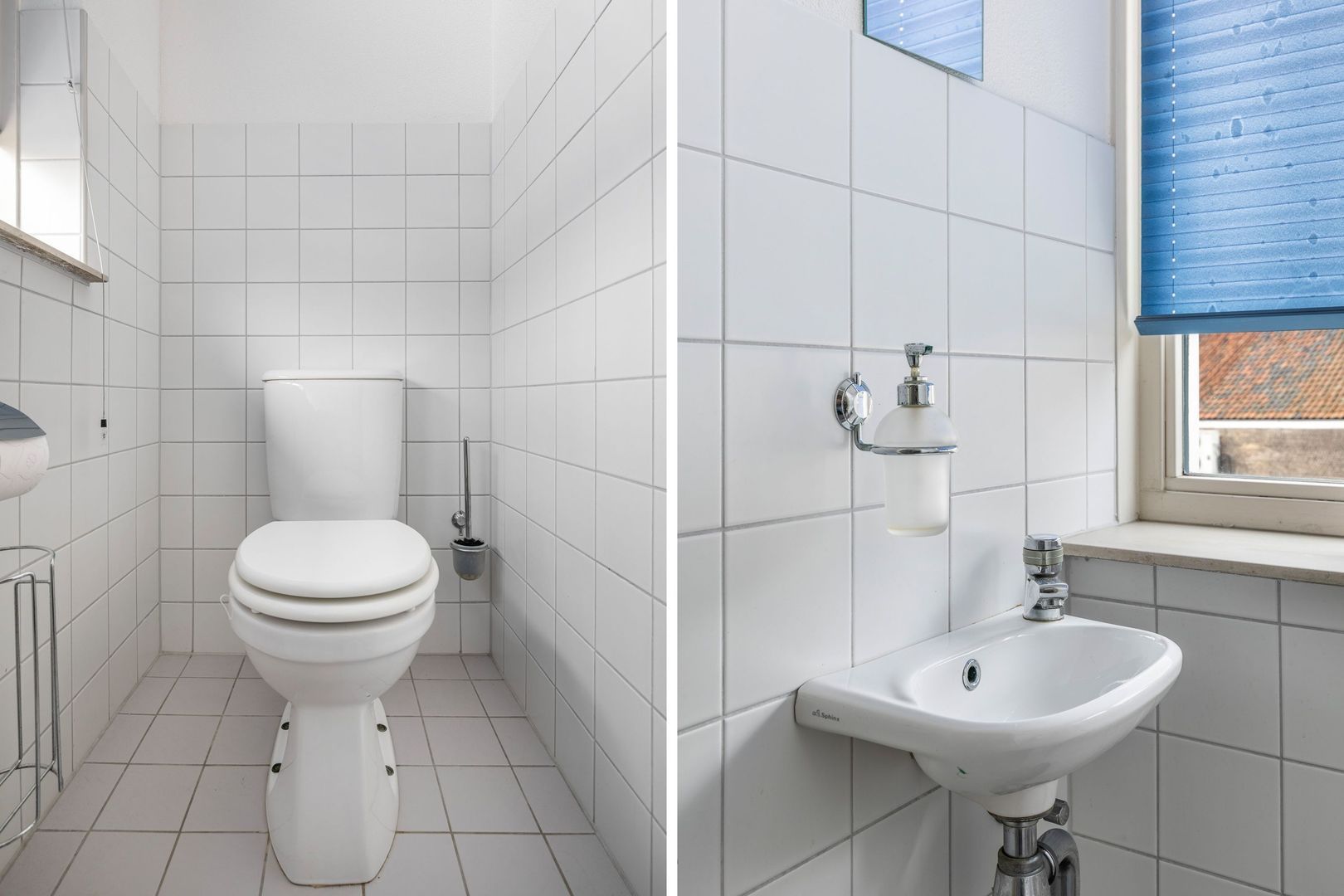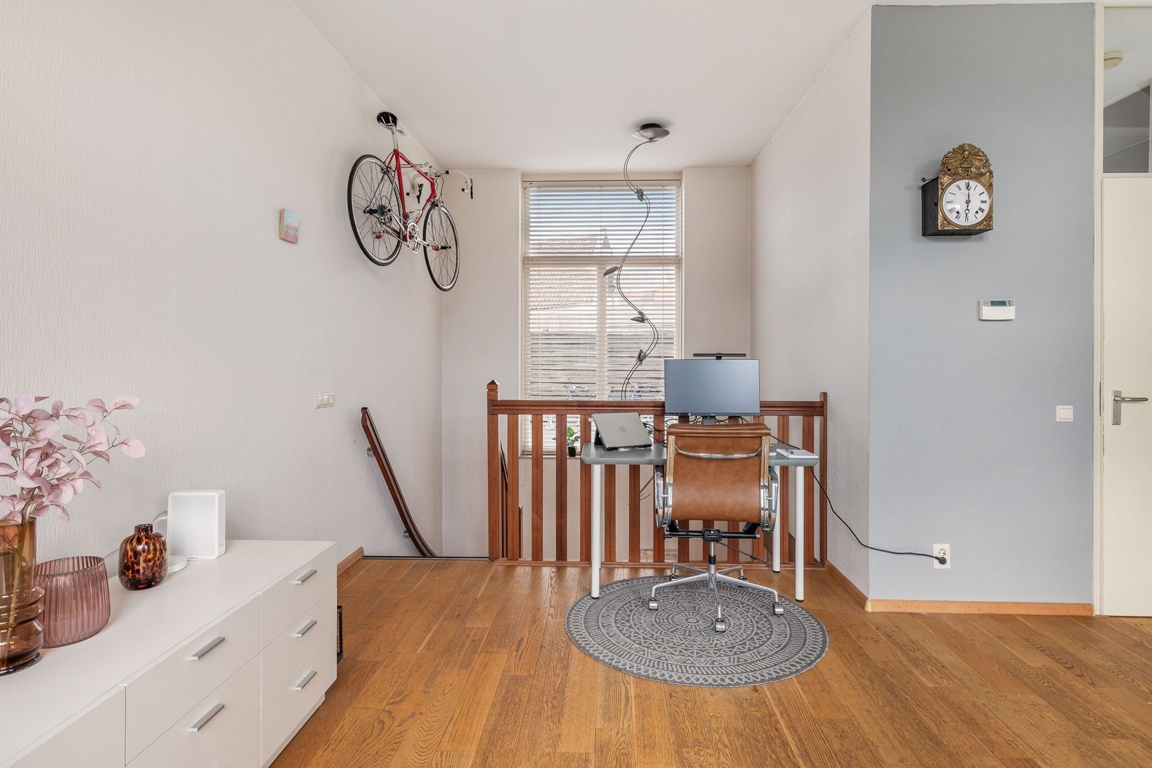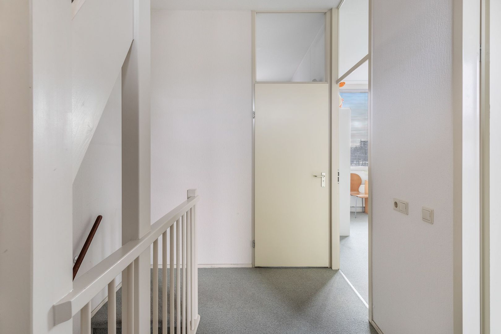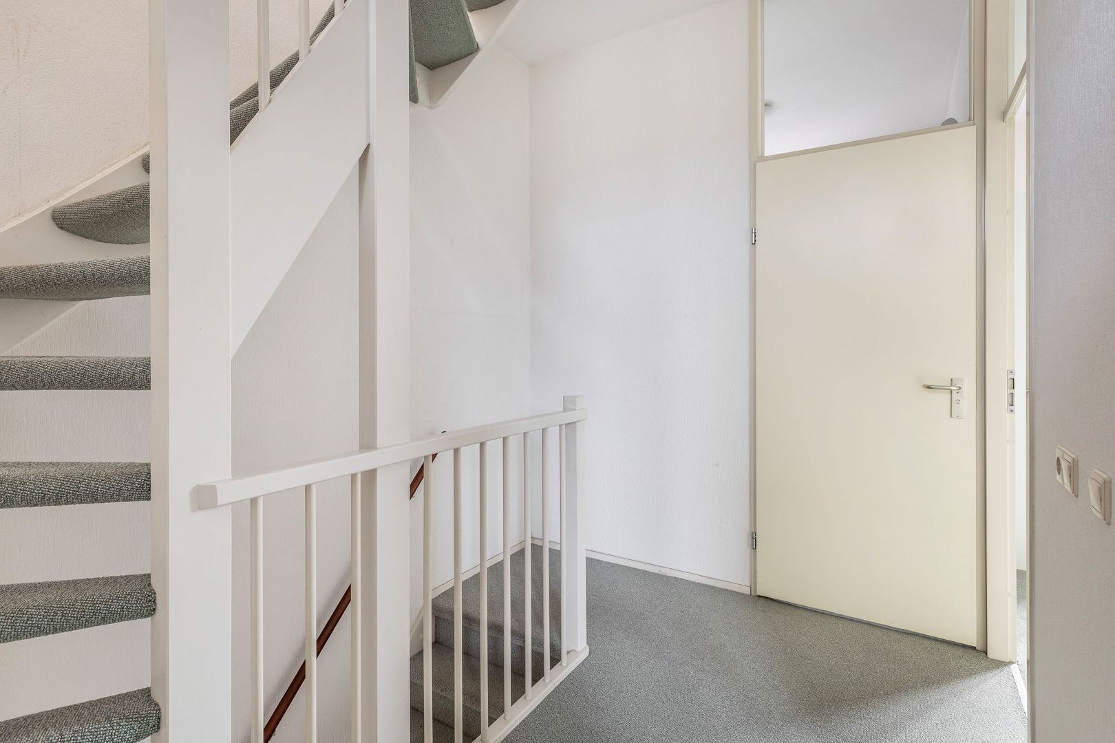 Entree met meterkast, trapkast en toilet met fontein. Ruime, lichte woonkamer met ramen aan beide zijden. De vide biedt uitzicht op de lager gelegen eetkeuken.