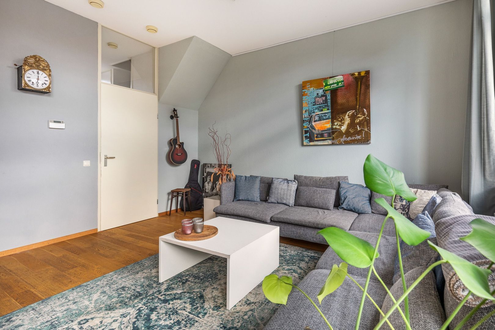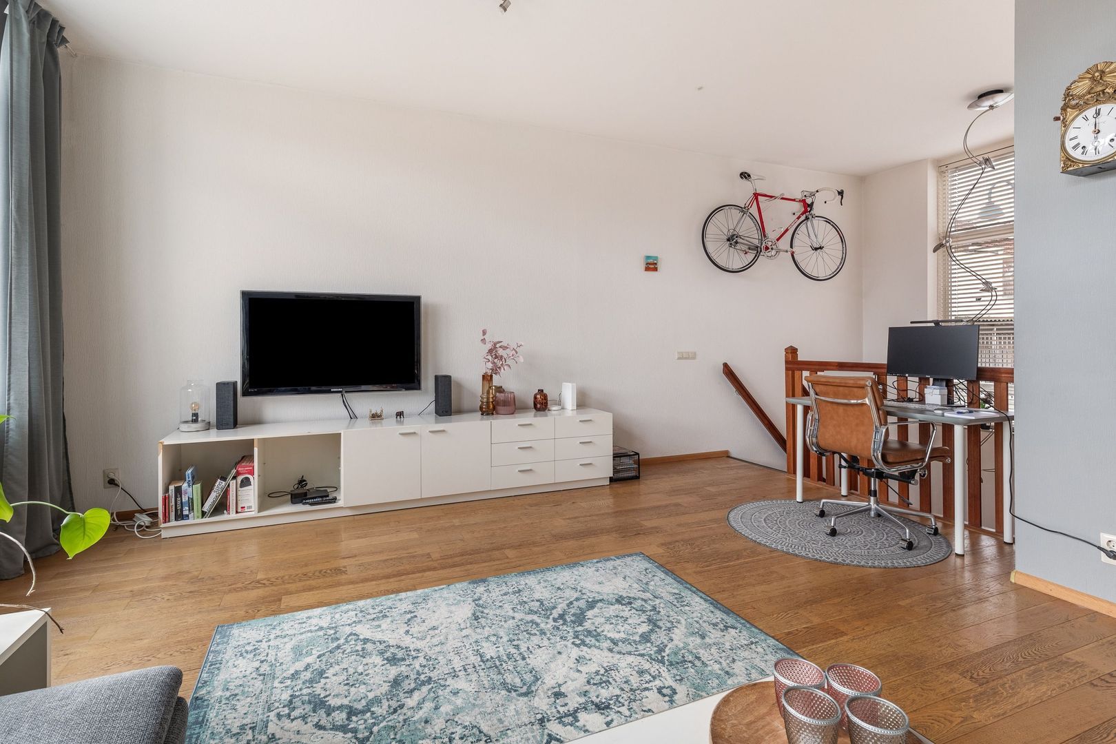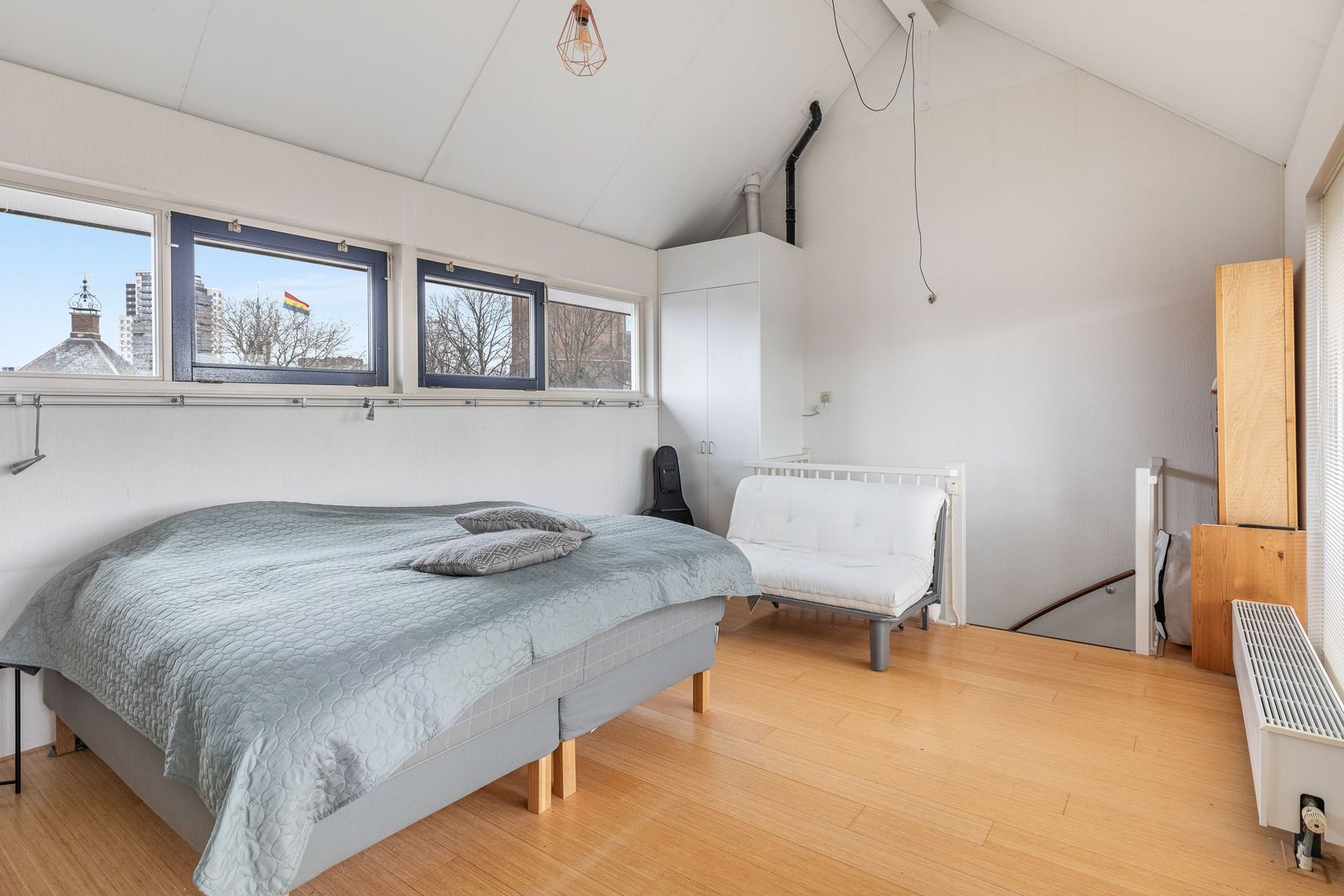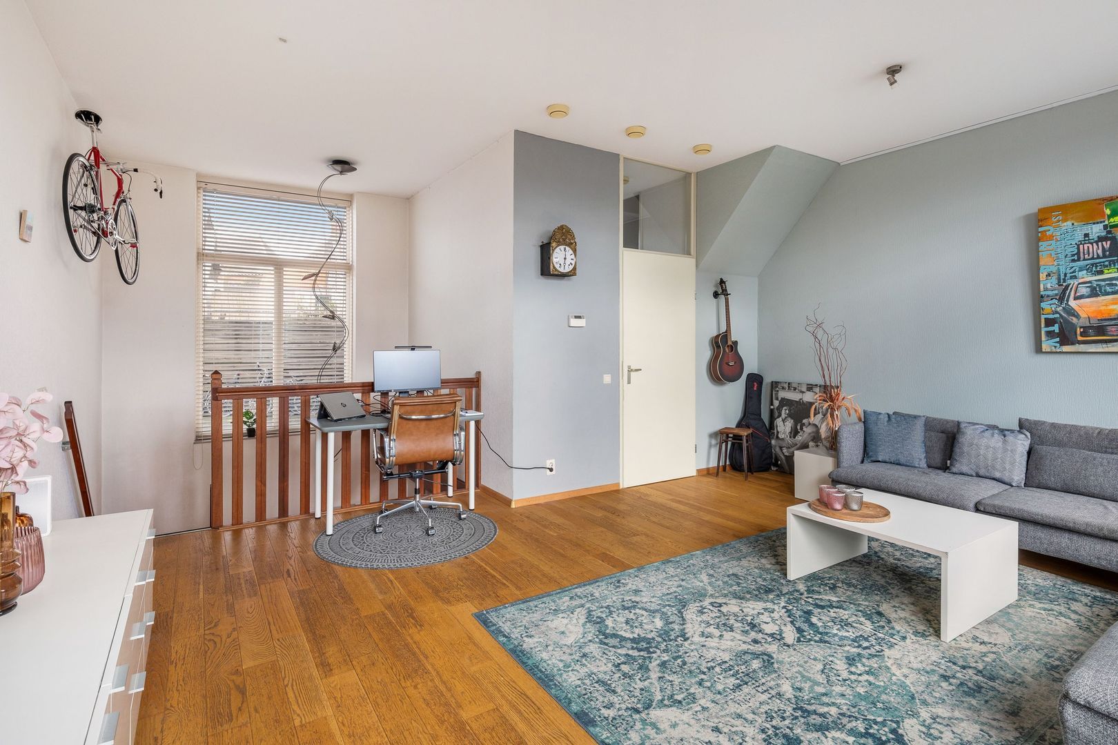 Ruime, 4,5 meter hoge, kamer voorzien van bamboe-parketvloer en toegang tot het ruime, zonnige dakterras. De CV-installatie bevindt zich in de hoek met een ombouwkast.