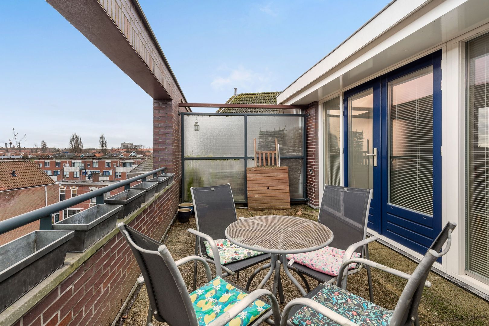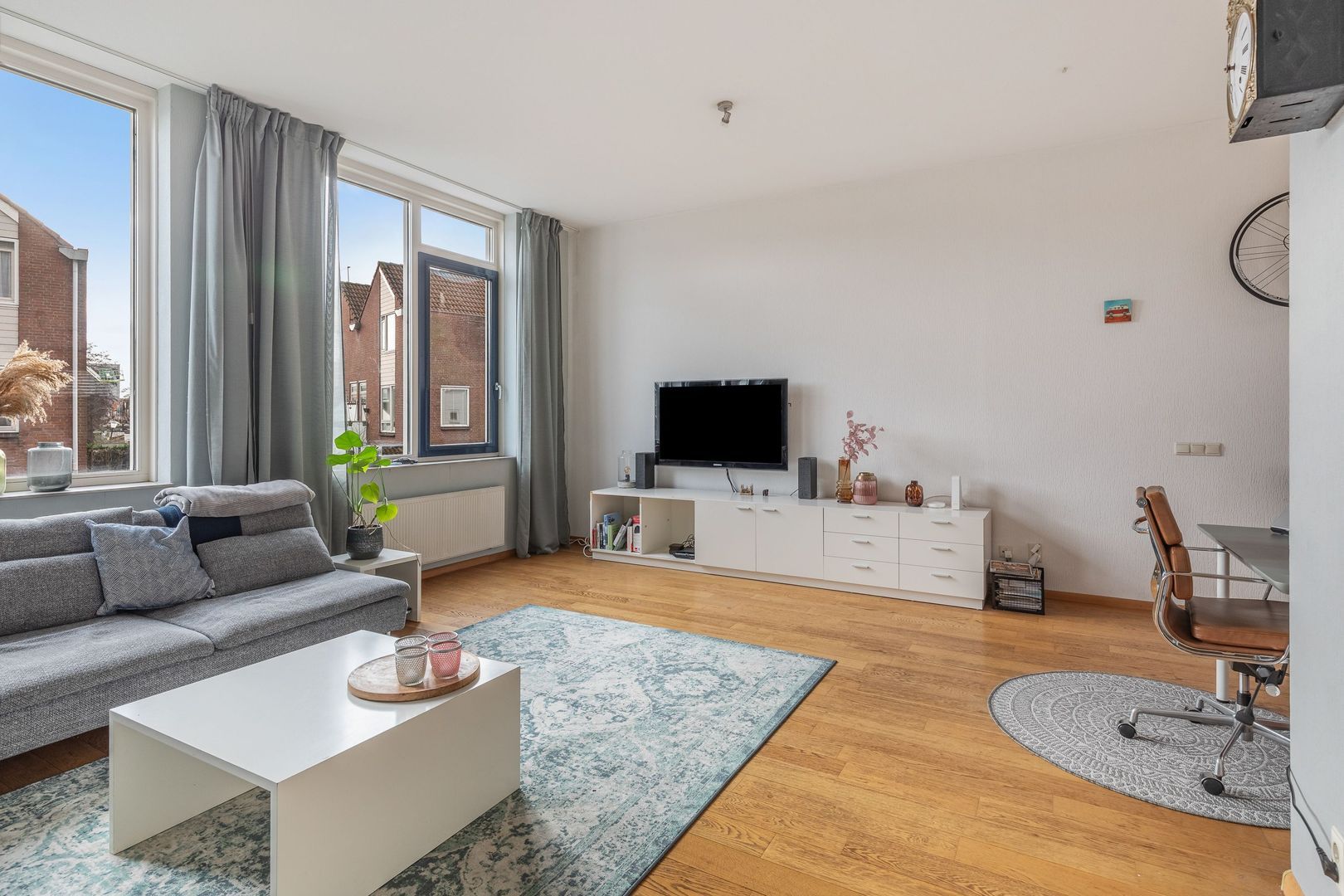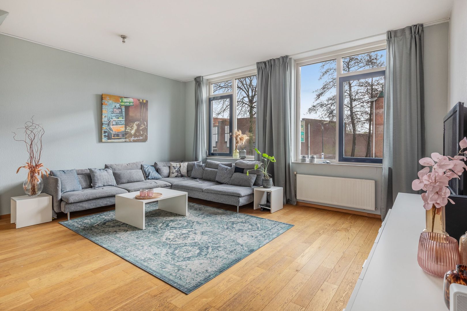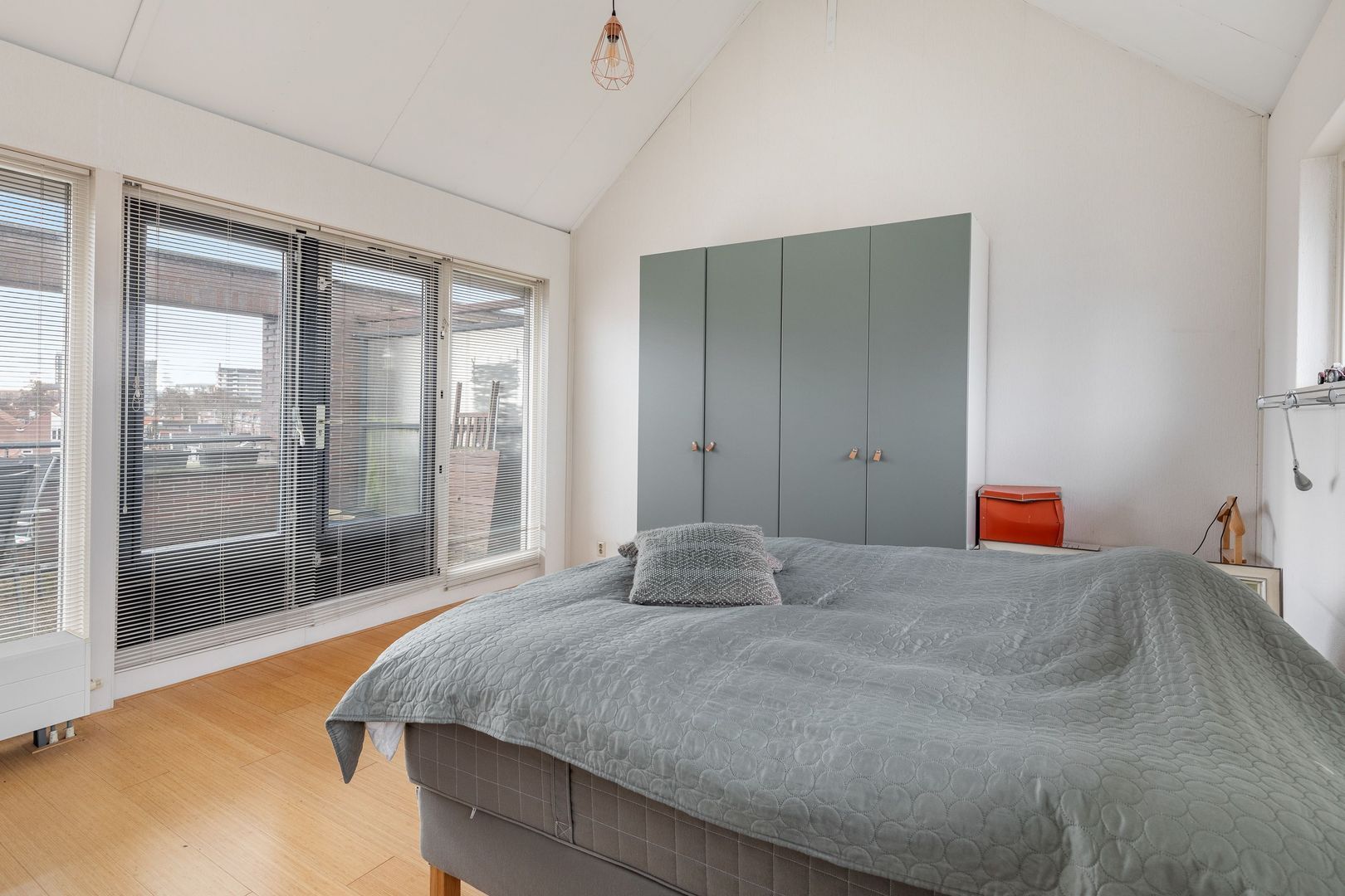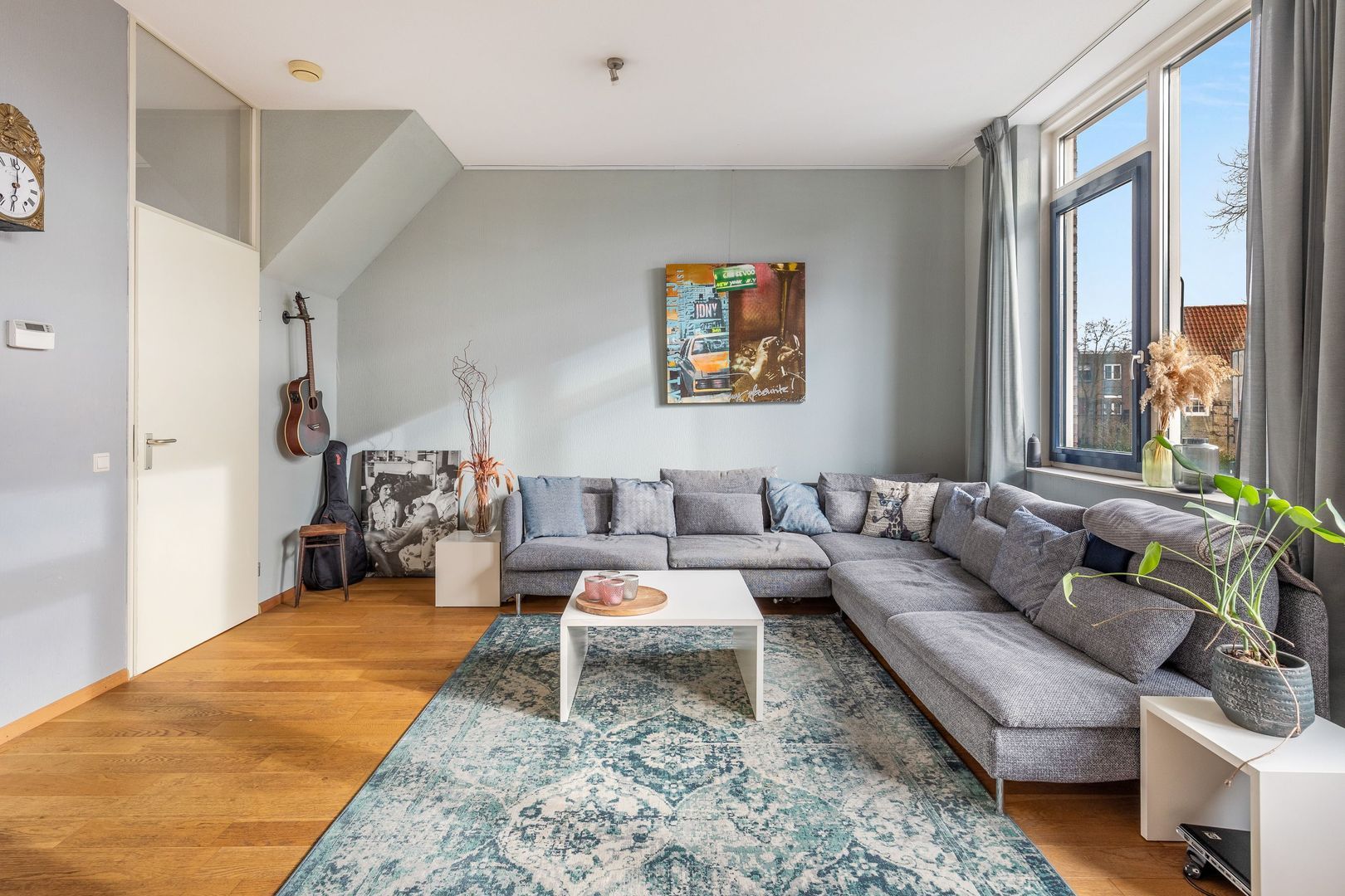 Ruime, 4,5 meter hoge, kamer voorzien van bamboe-parketvloer en toegang tot het ruime, zonnige dakterras. De CV-installatie bevindt zich in de hoek met een ombouwkast.