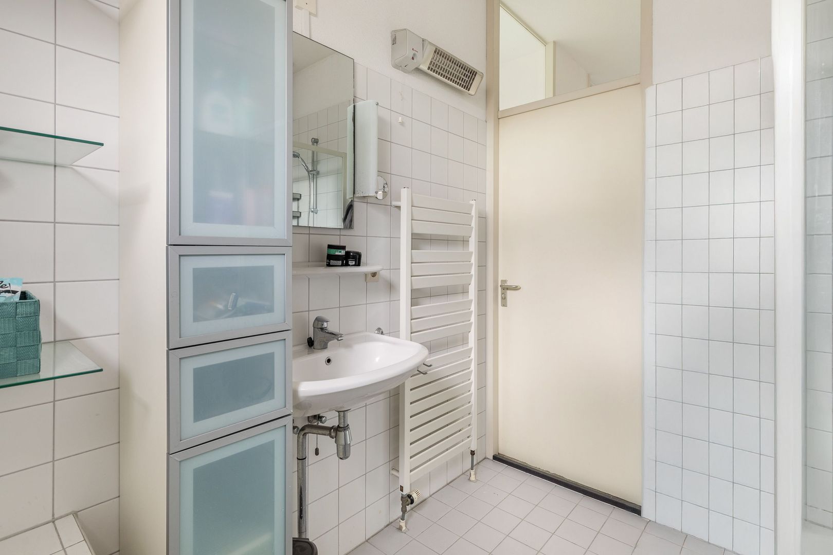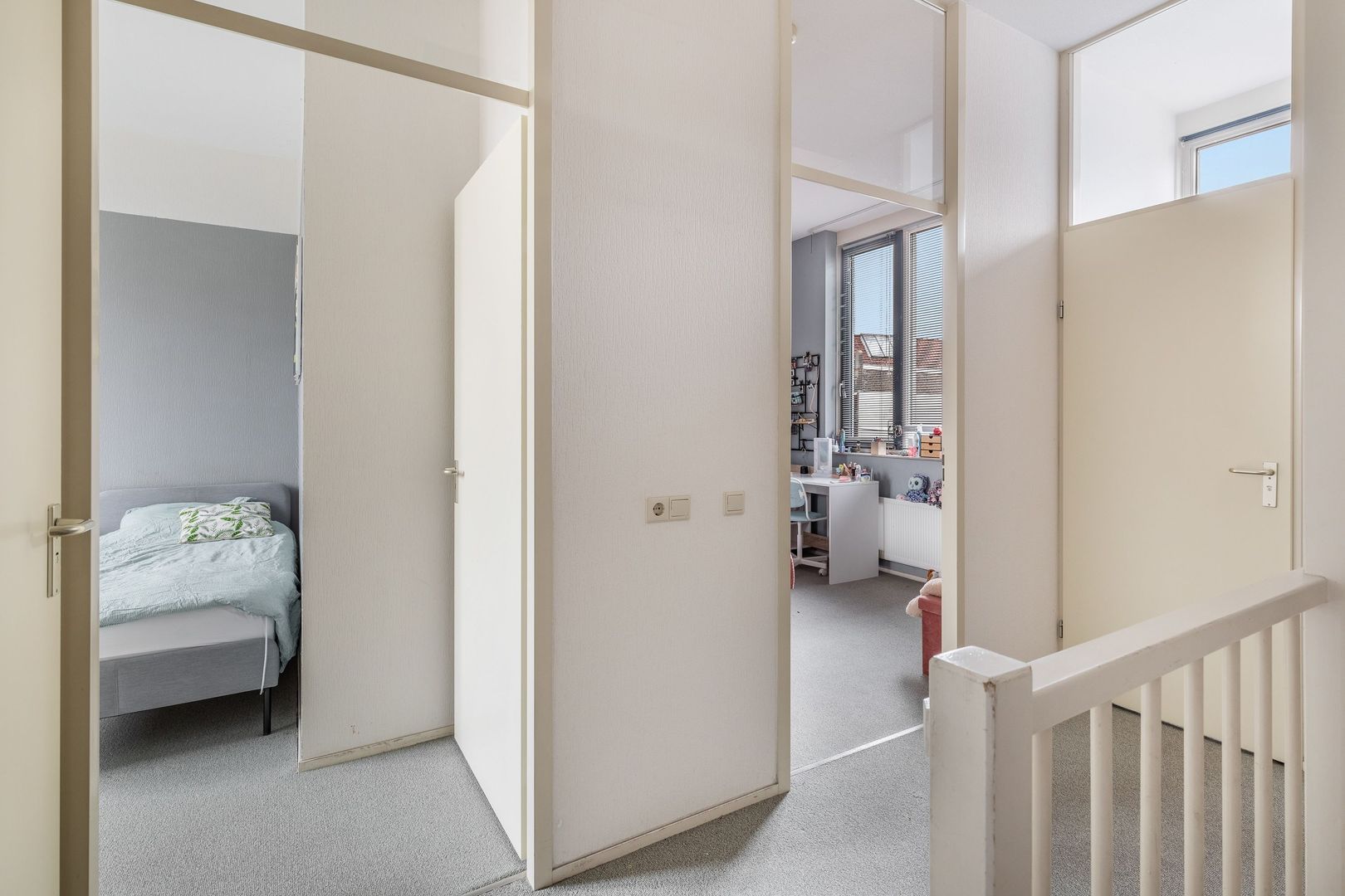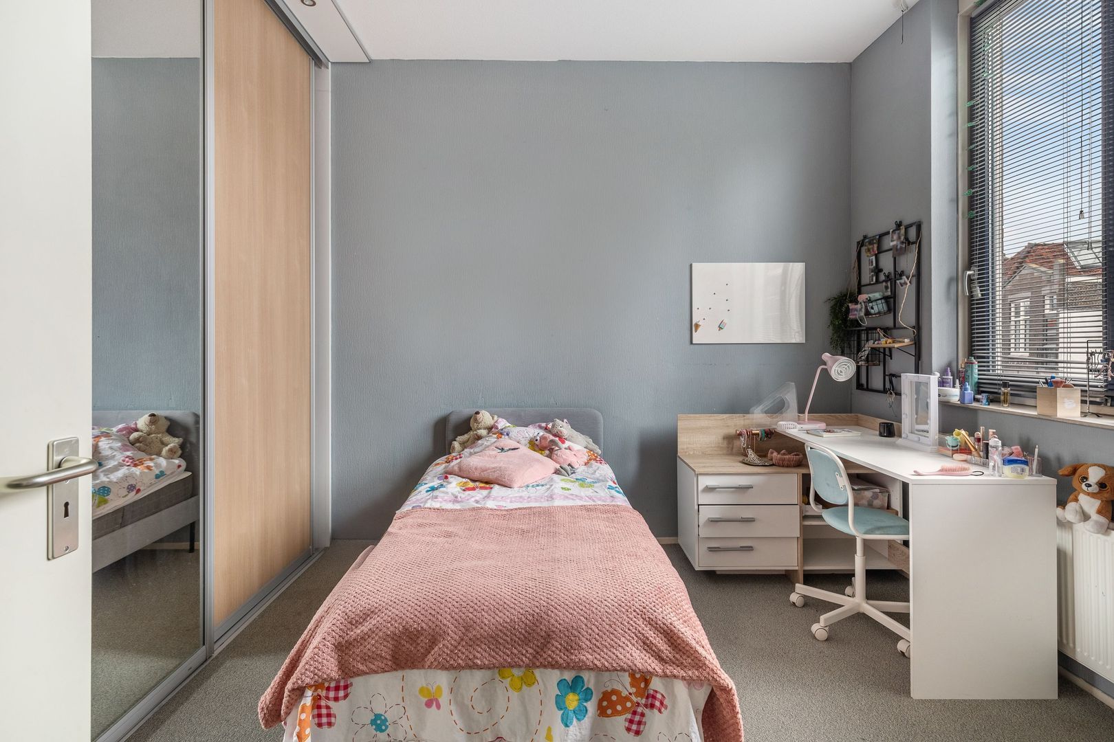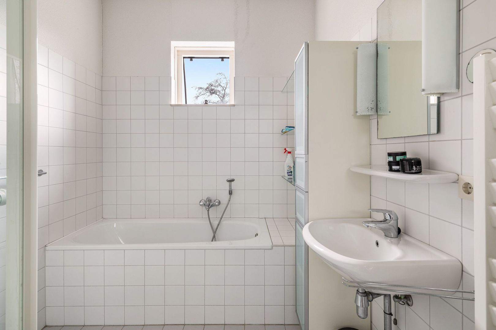 Overloop, twee ruime slaapkamers, waarvan één met grote schuifwandkast. Lichte badkamer met een douchehoek, ligbad en wastafel. Separaat toilet met fontein.