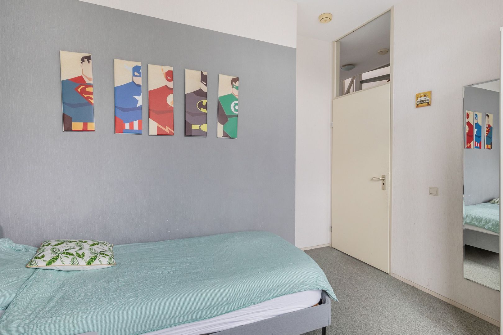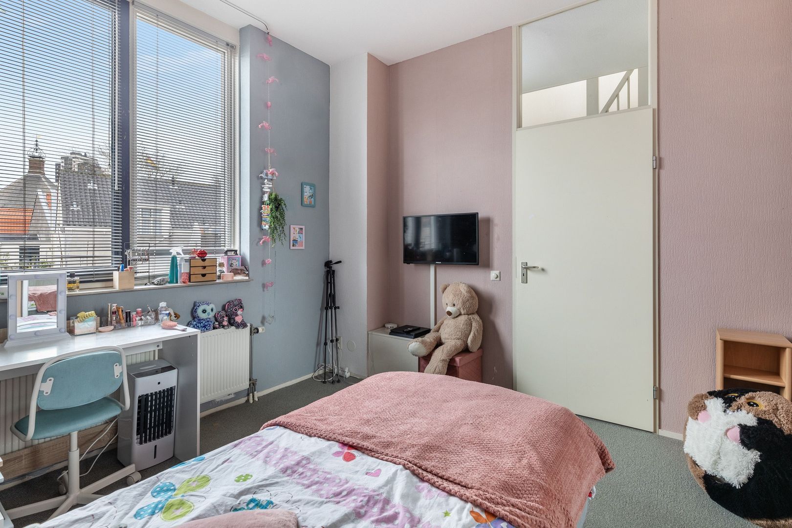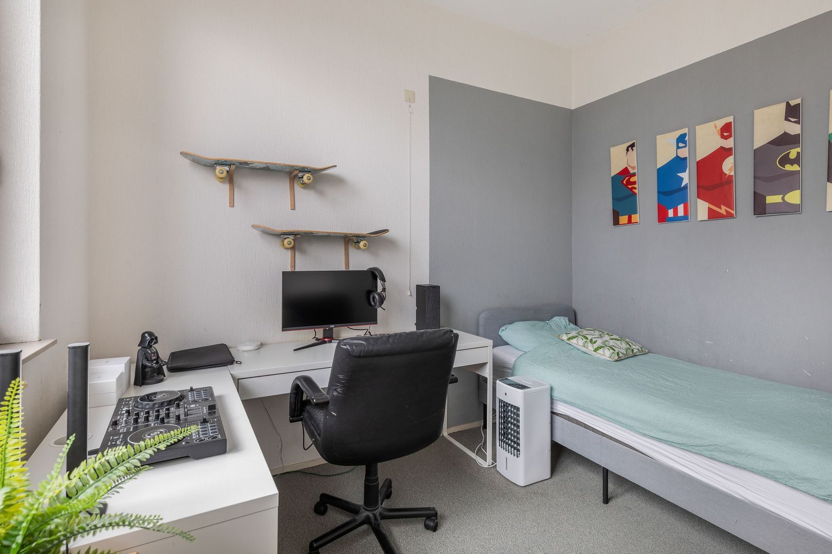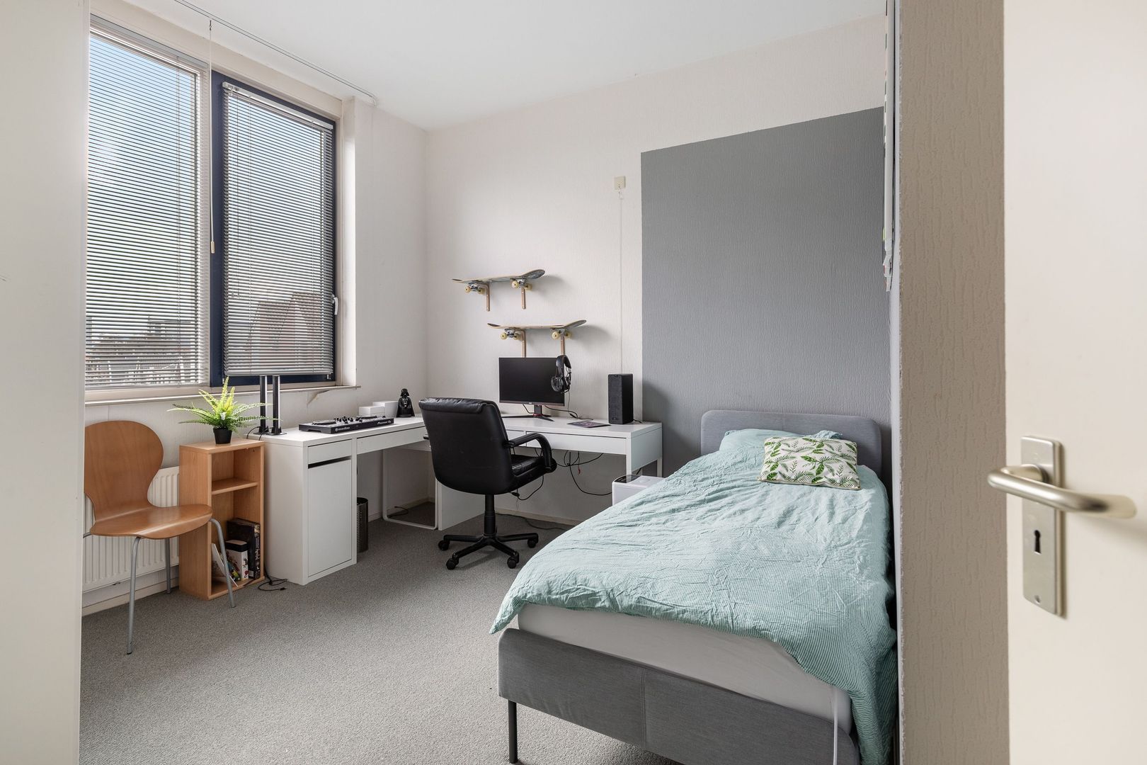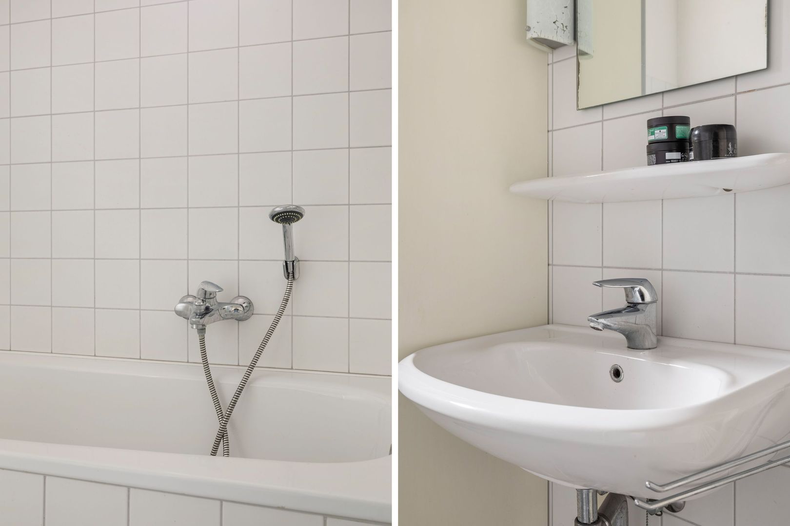 Overloop, twee ruime slaapkamers, waarvan één met grote schuifwandkast. Lichte badkamer met een douchehoek, ligbad en wastafel. Separaat toilet met fontein.