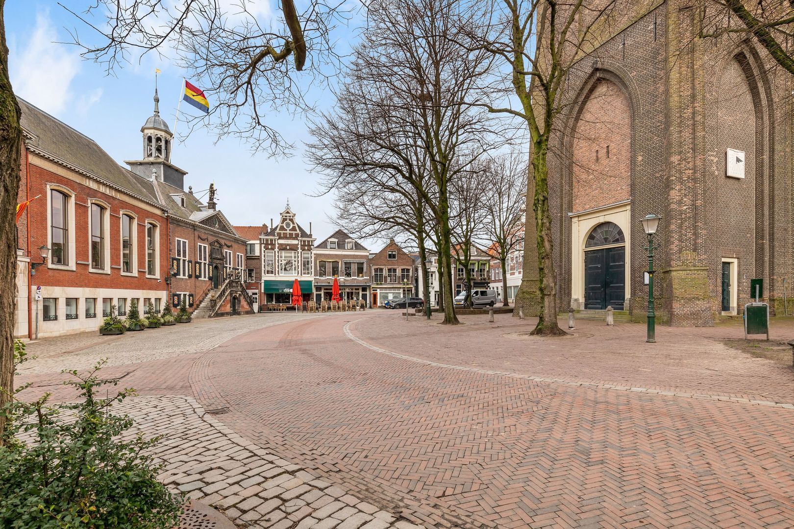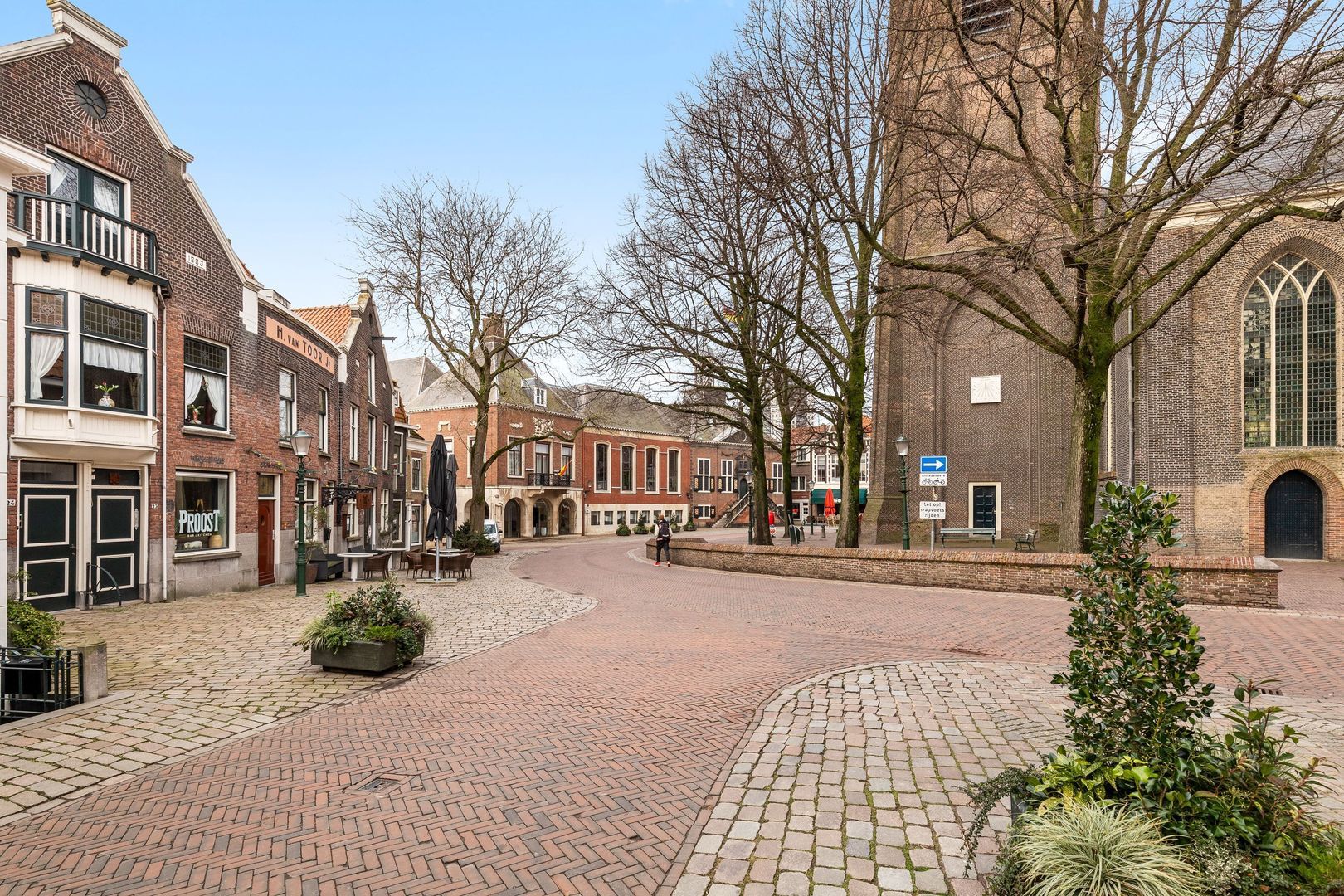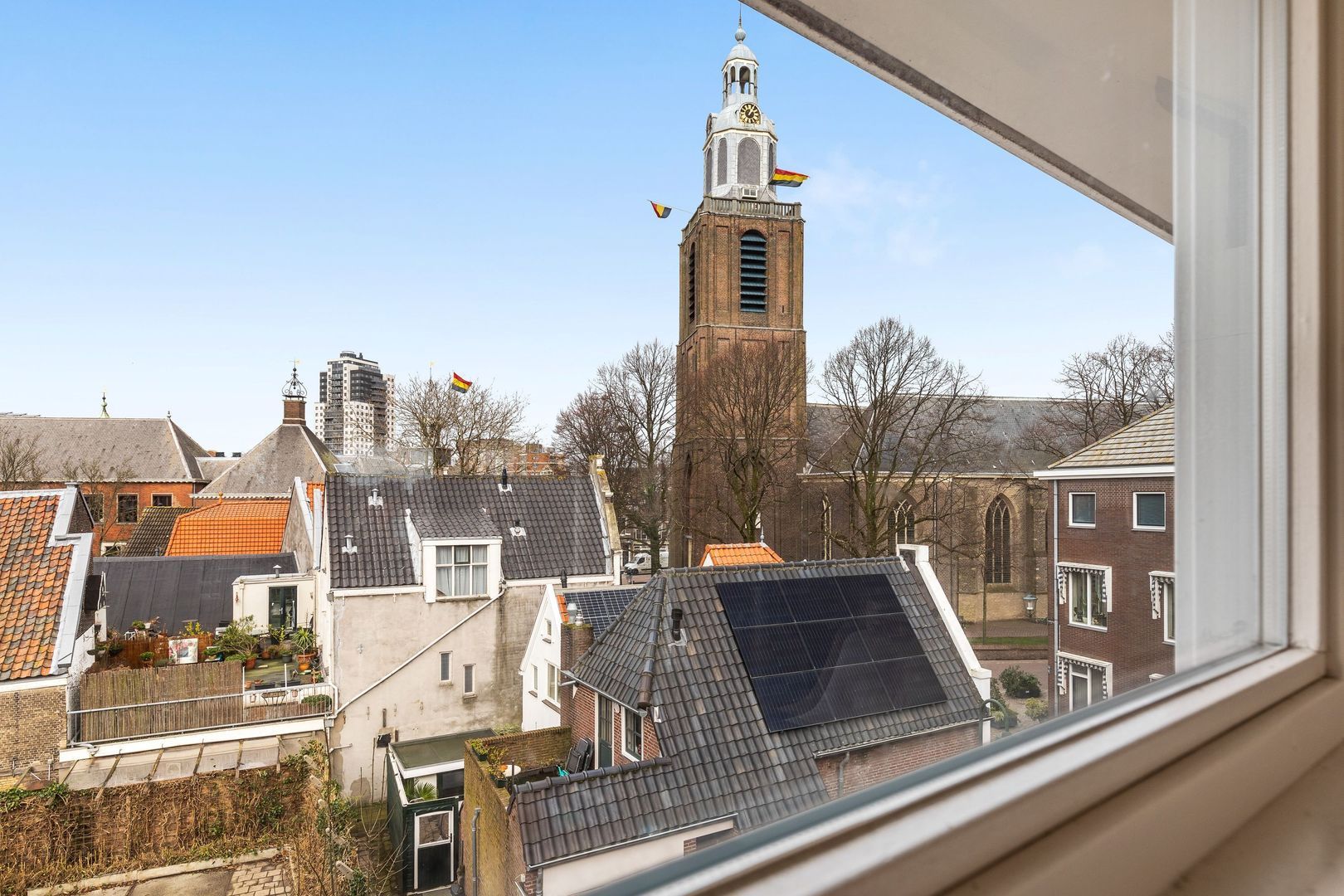 Vanaf de twee bovenste verdiepingen heeft de woning uitzicht op de middeleeuwse Grote Kerk en toren aan de historische Markt.