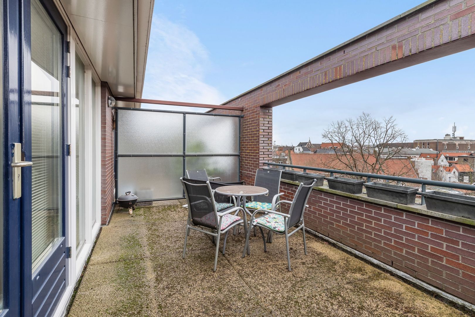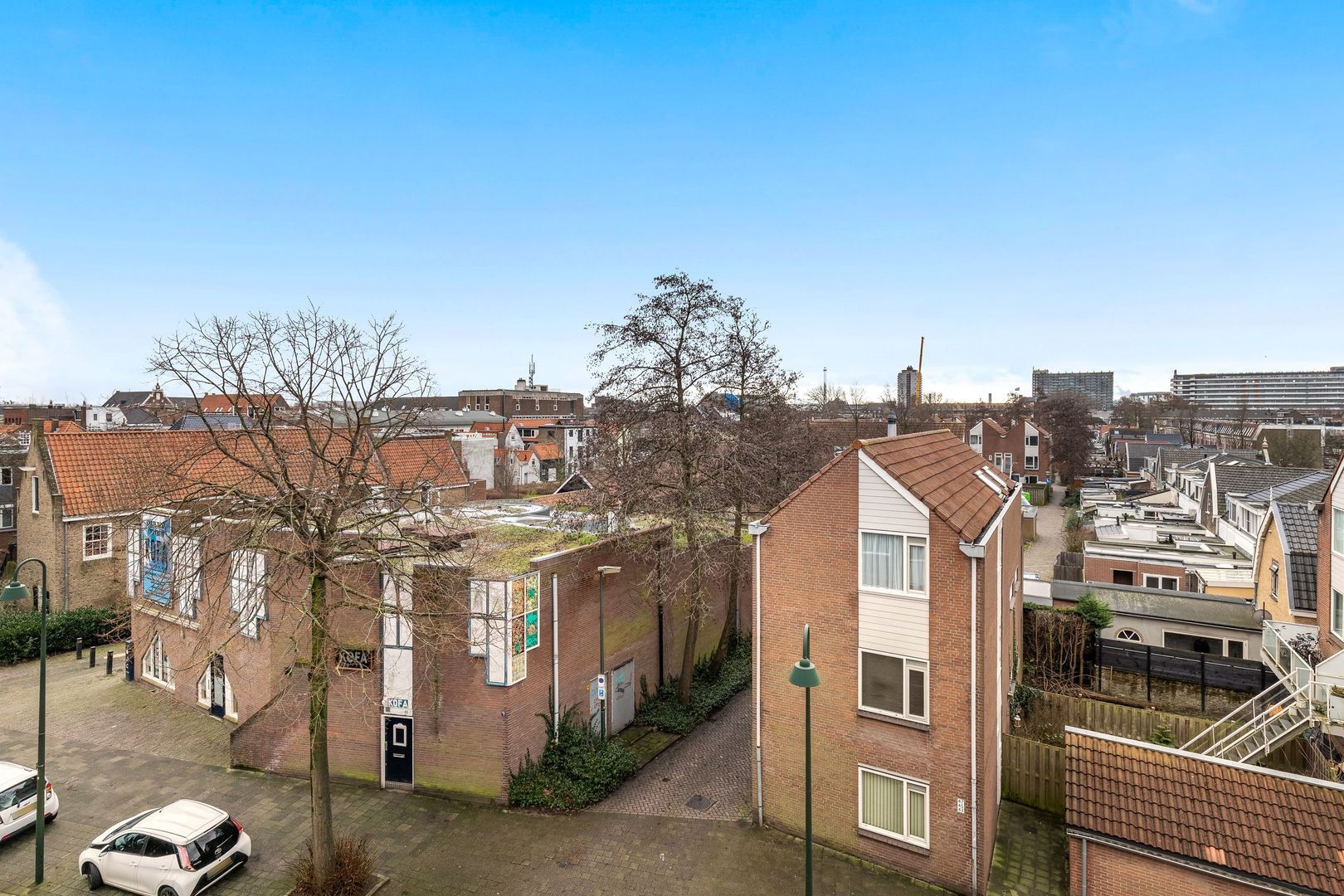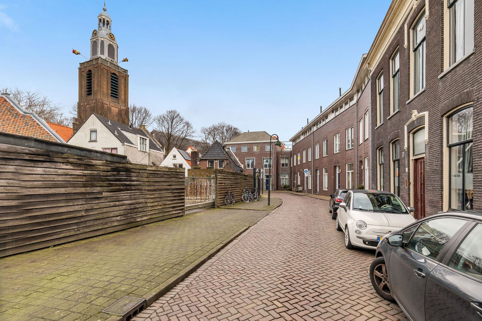 Vanaf de twee bovenste verdiepingen heeft de woning uitzicht op de middeleeuwse Grote Kerk en toren aan de historische Markt.