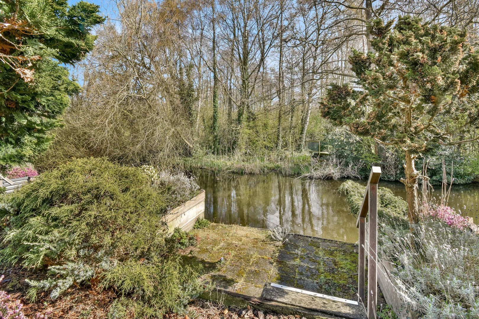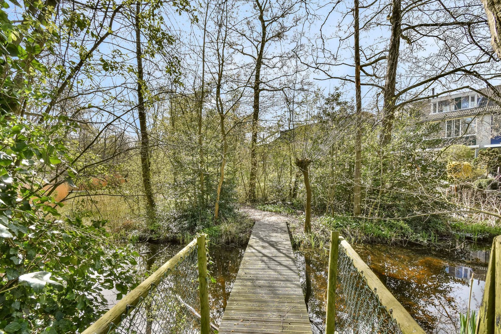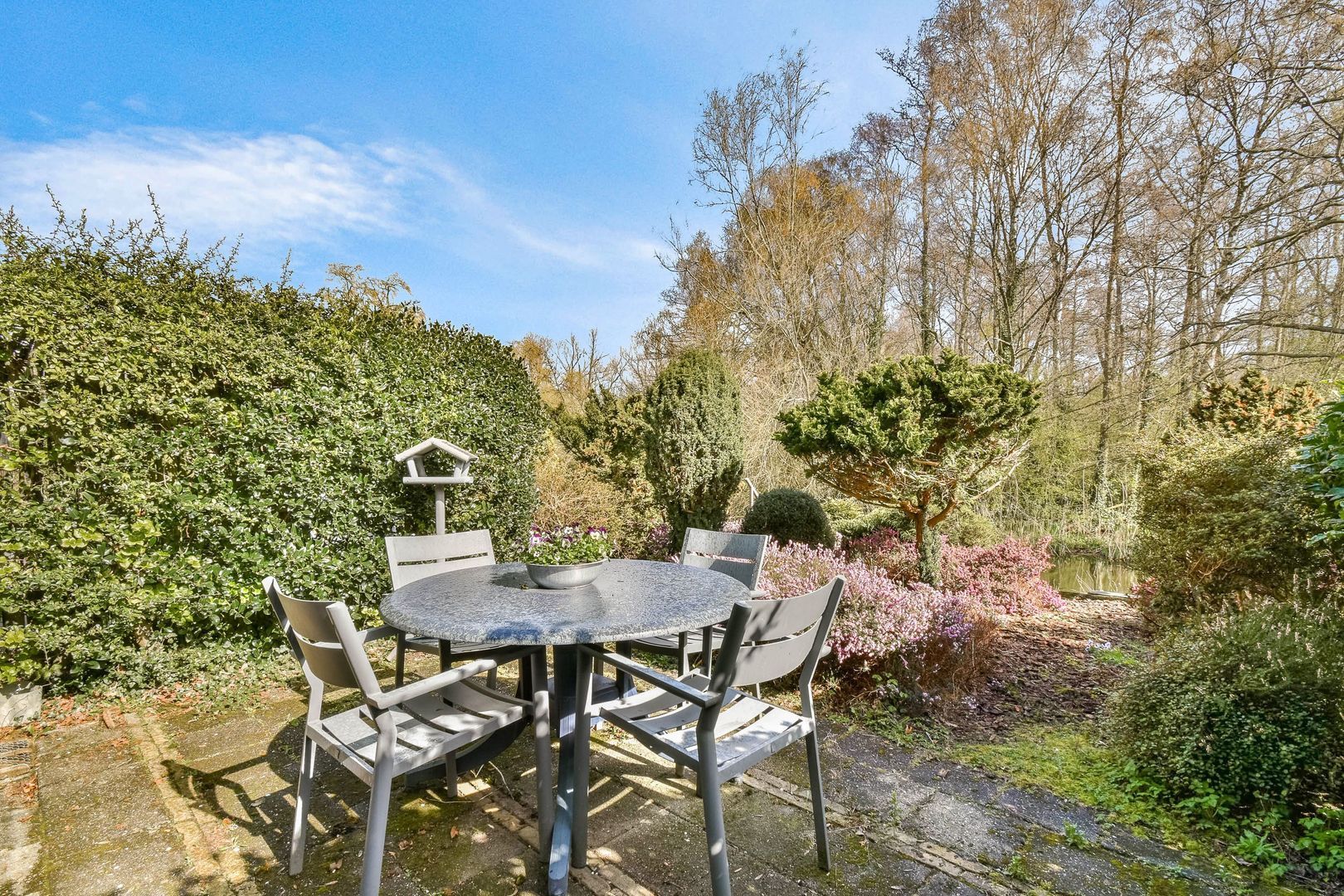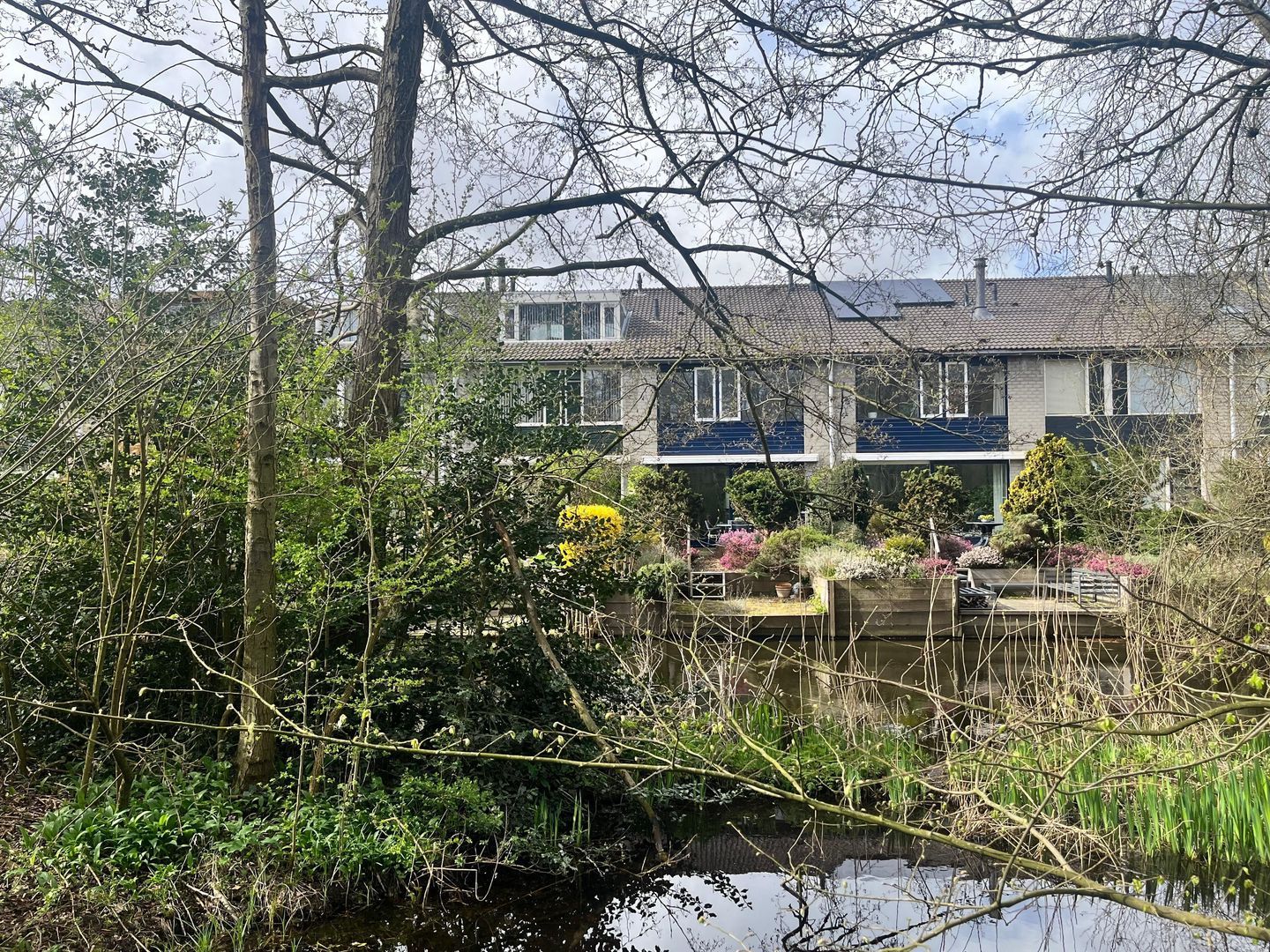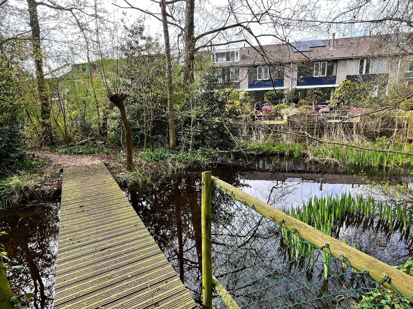 De beschutte en zonnige achtertuin (ca. 10 x 5,5 meter) is gelegen op het oosten en beschikt over twee terrassen, waarvan het achterste direct aan het water ligt. De tuin is verzorgd aangelegd met groenblijvende beplanting en zonwering.