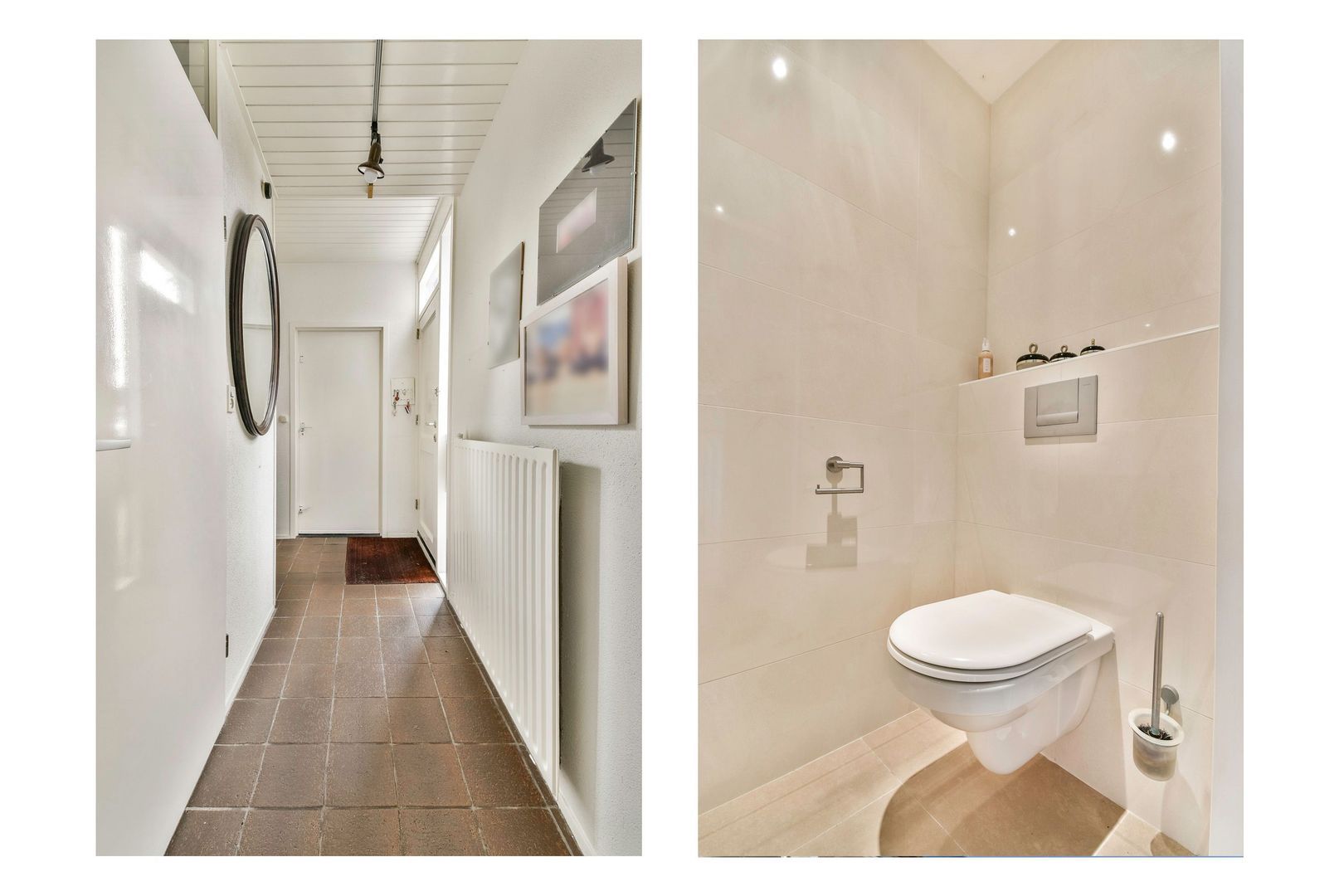 Entree, hal met meterkast en garderobekast, modern hangend toilet met fonteintje. De betegelde vloer loopt door naar de royale woonkamer met open keuken van ca. 47 m². De woonkamer beschikt over een grote hardhouten schuifpui naar de tuin, verzonken verwarming, spachtelputz wandafwerking en een open trap naar de verdieping.