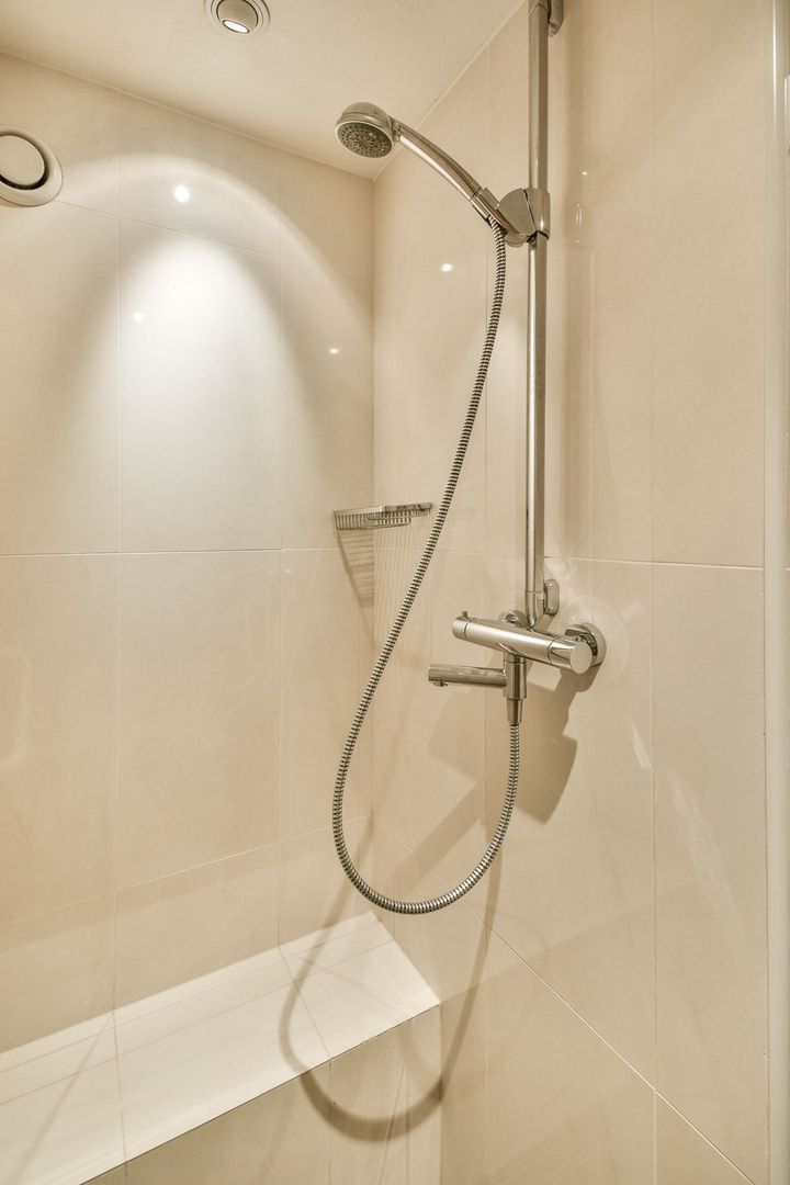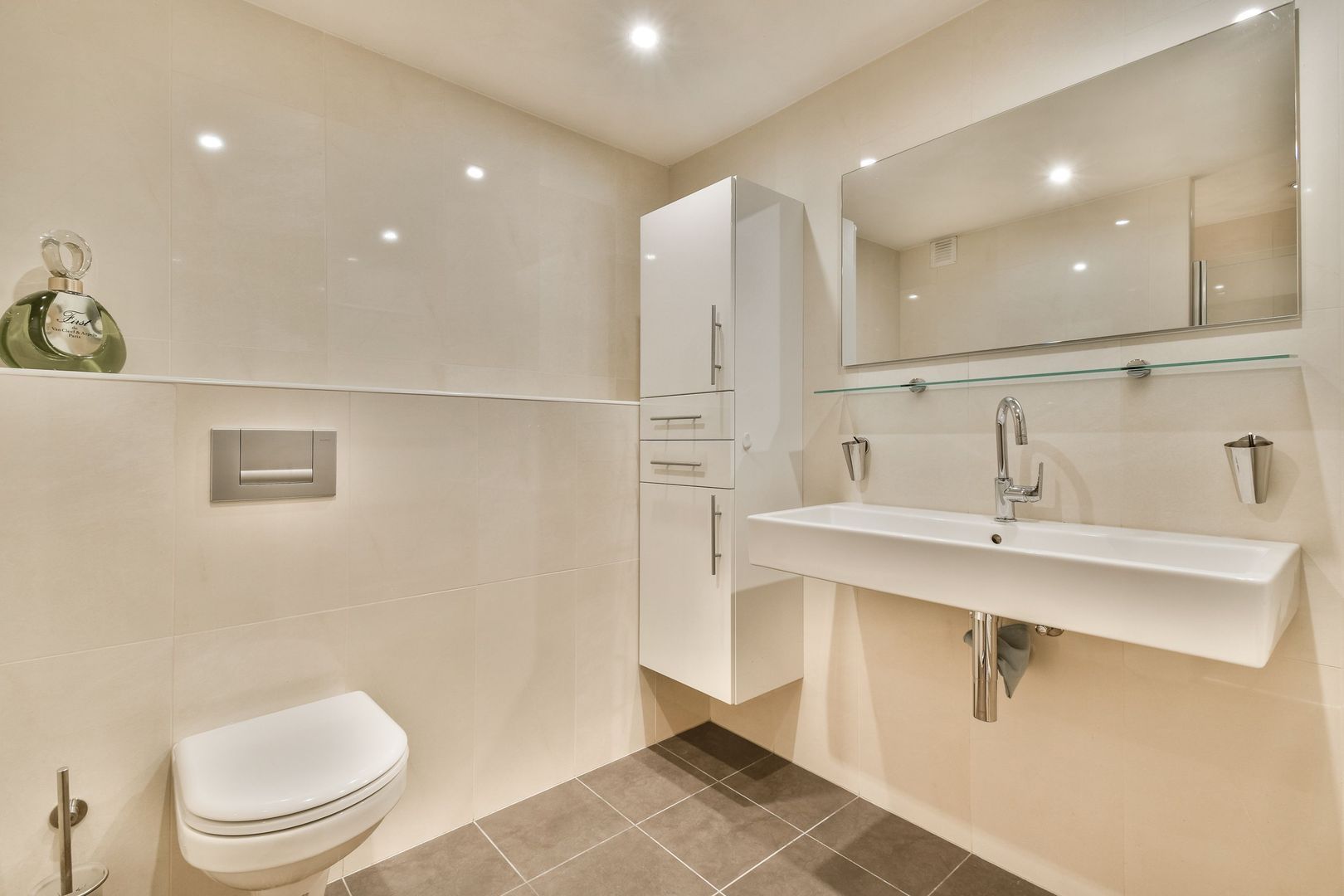 De moderne badkamer is compleet uitgerust met ligbad, zwevend toilet, breed wastafelmeubel met kast, handdoekradiator en een inloopdouche met watergoot en thermostaatkraan. Het plafond is voorzien van ingebouwde verlichting.