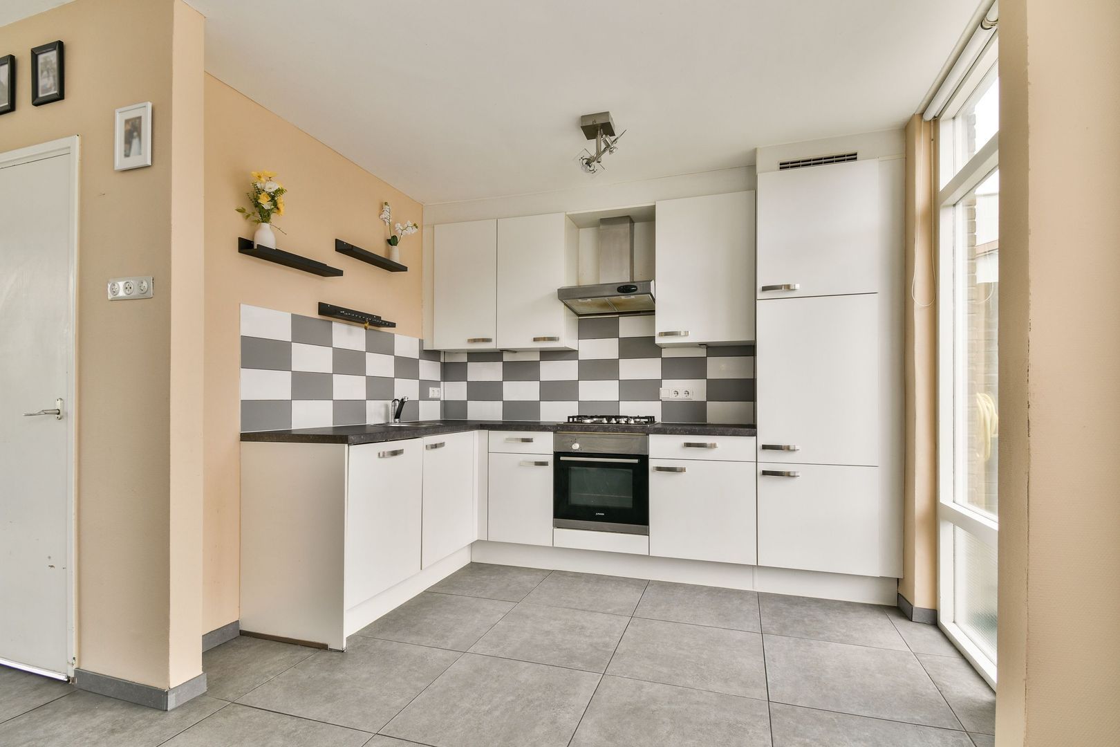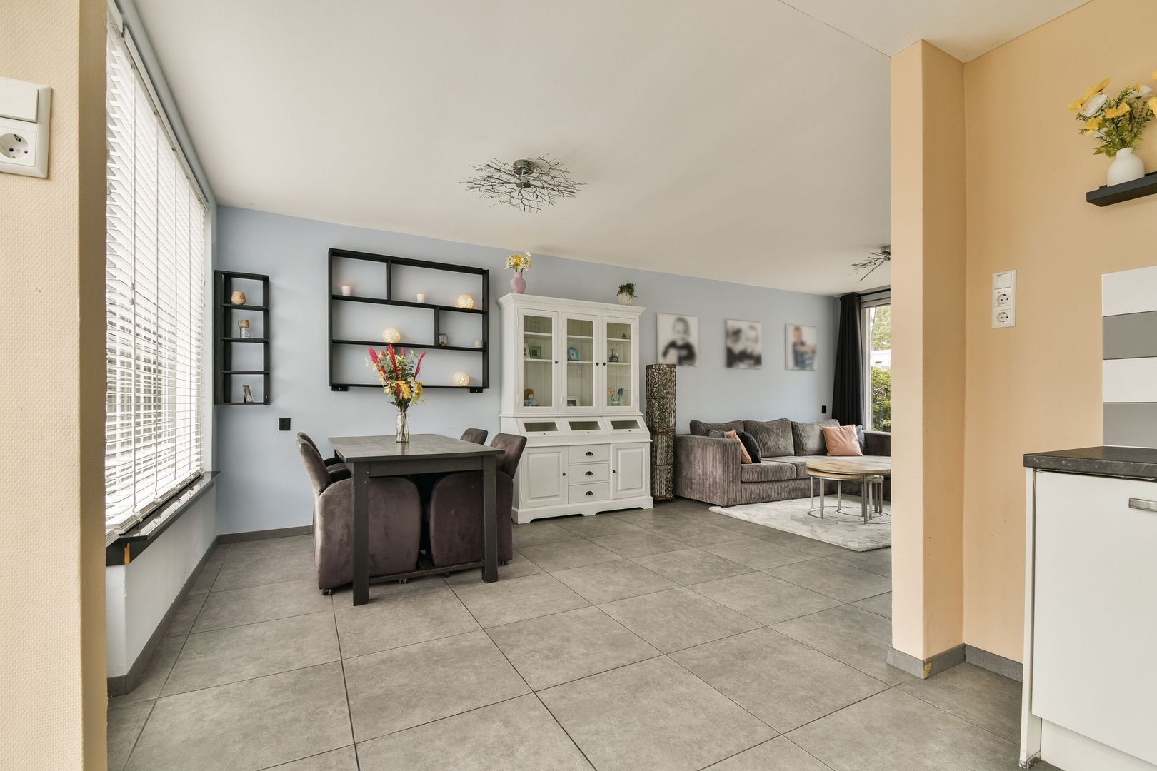 De lichte woonkamer van ca. 34 m² is sfeervol dankzij de grote panoramaramen. Het plafond is strak gestuukt en de wanden zijn afgewerkt met glasvliesbehang. De moderne witte hoekkeuken is uitgerust met een 4-pits gaskookplaat, heteluchtoven, vaatwasser, koelkast en betegelde achterwand. Zowel vanuit de keuken als vanuit de woonkamer is er toegang tot de tuin.
