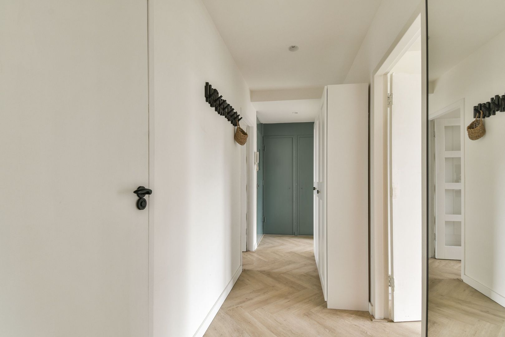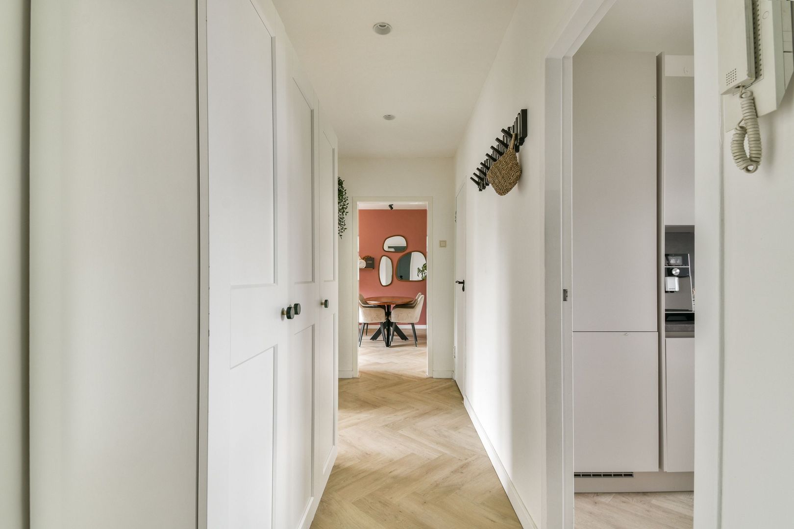 Entree, ruime hal met pvc vloer en plafond met ingebouwde verlichting, inbouwkast en toegang naar moderne, wit met antraciet betegelde toiletruimte met zwevend toilet.
