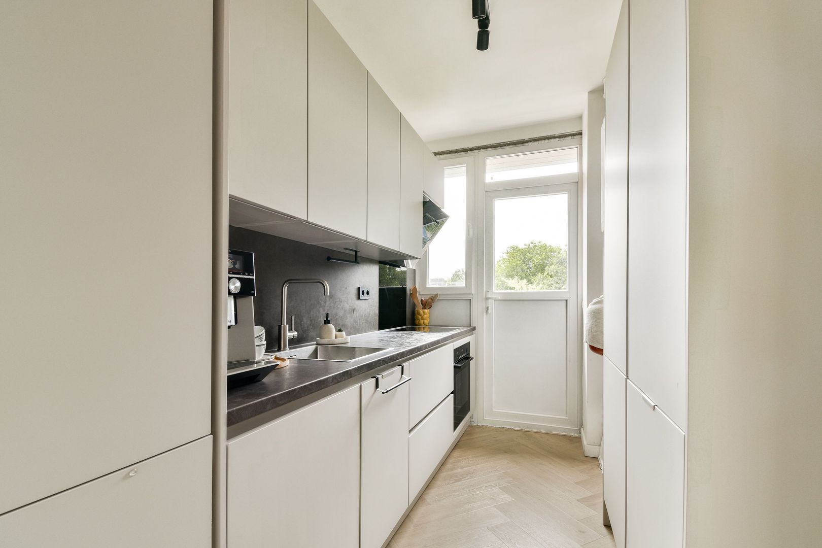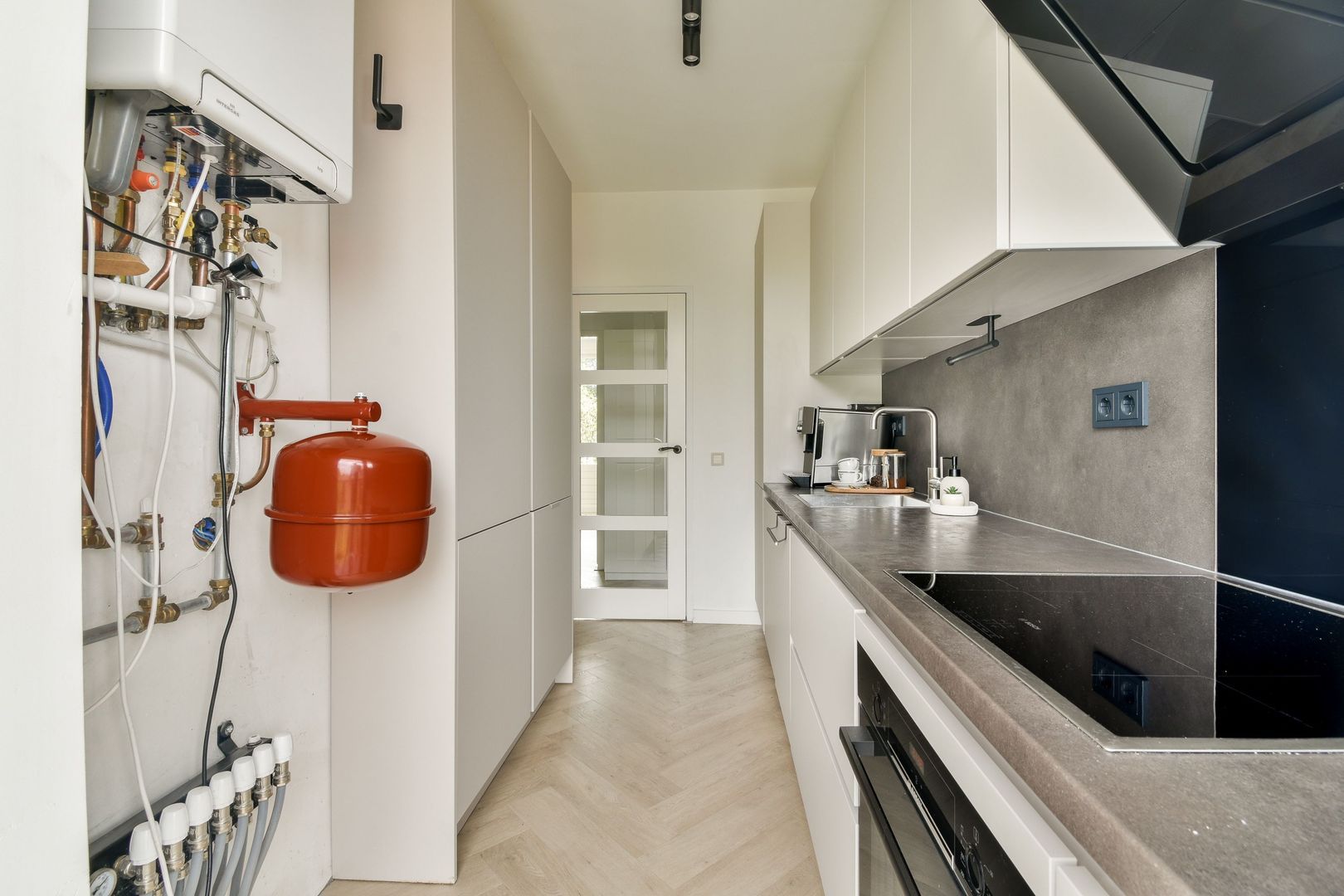 Moderne keuken met achterwandopstelling, lichte hoogglans fronts, greeploos rvs-grepen, antraciet aanrechtblad en voorzien van de volgende inbouwapparatuur: grote koelvriescombinatie, heteluchtoven, 4-pits inductiekookplaat, afzuigkap en vaatwasser, grote wandkast met veel bergruimte en opstelling combi CV-ketel. Vanuit de keuken is er toegang tot klein balkon.