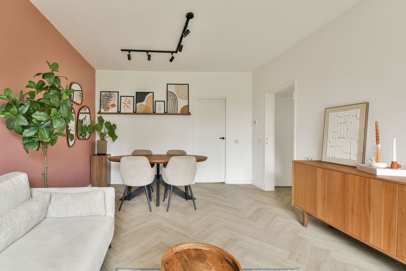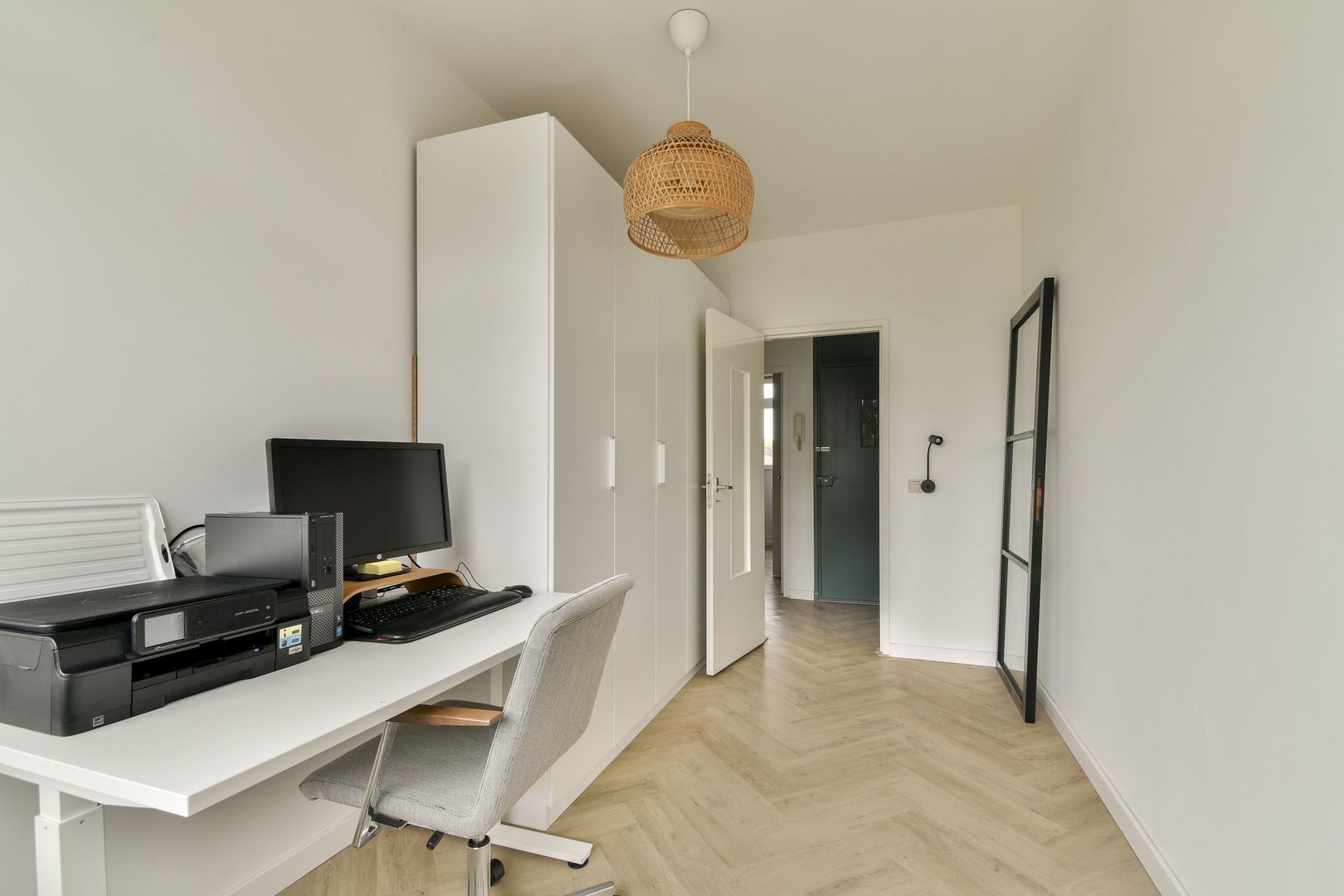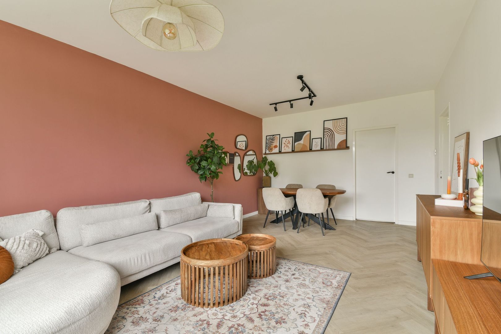 Fijne woonkamer van ca. 24 m2 met veel lichtinval en vrij uitzicht, glad gestuukt plafond en wanden, mooie pvc visgraad vloer met vloerverwarming, die doorloopt in de gehele woning.