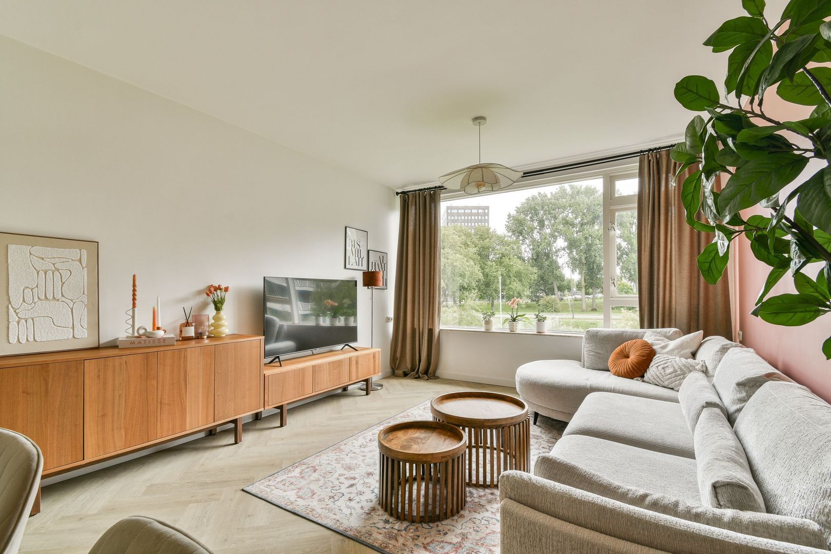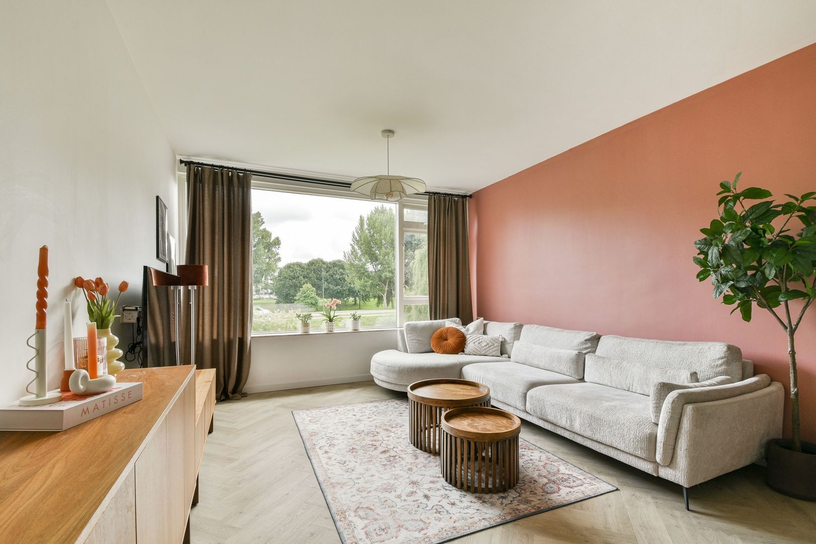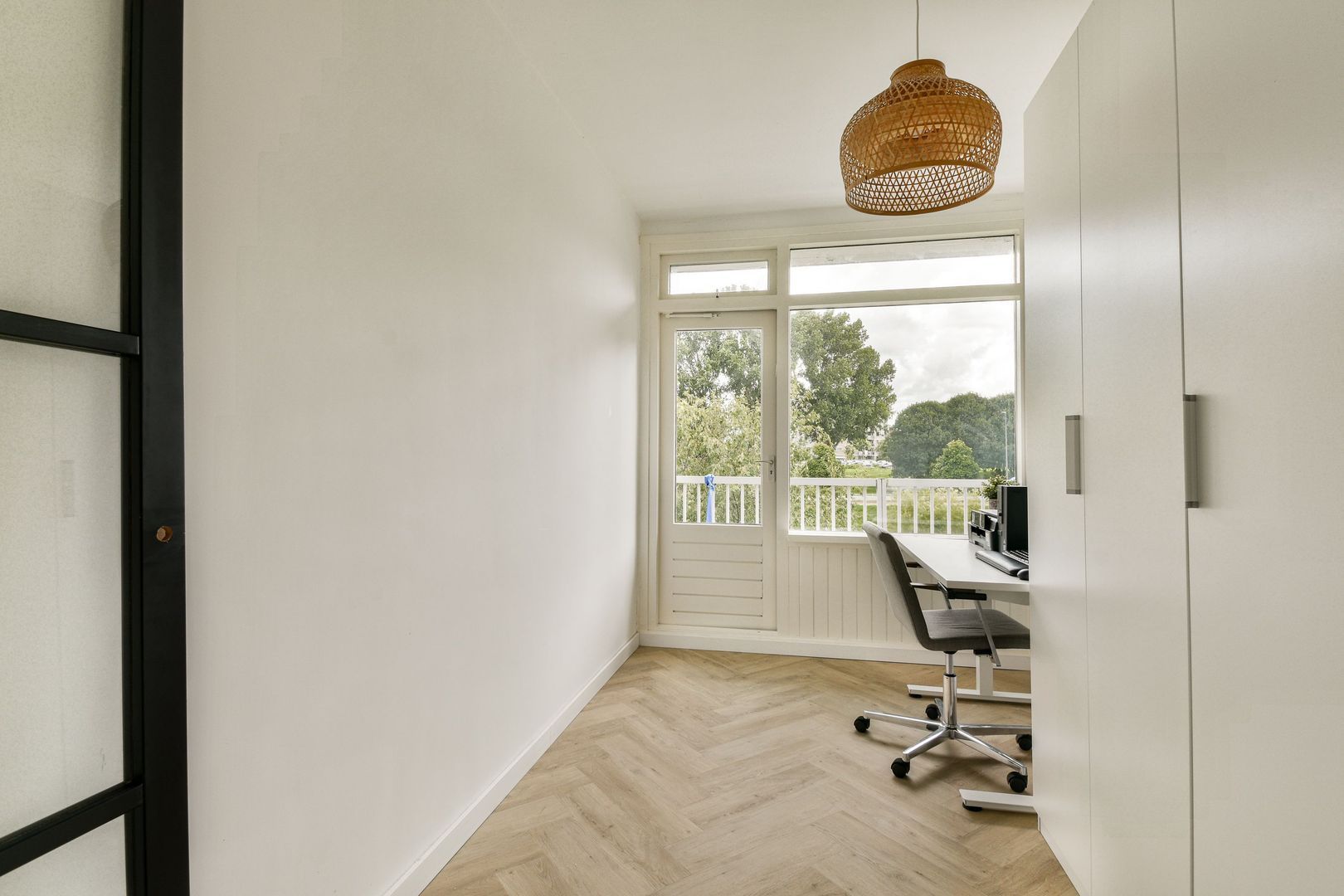 Fijne woonkamer van ca. 24 m2 met veel lichtinval en vrij uitzicht, glad gestuukt plafond en wanden, mooie pvc visgraad vloer met vloerverwarming, die doorloopt in de gehele woning.