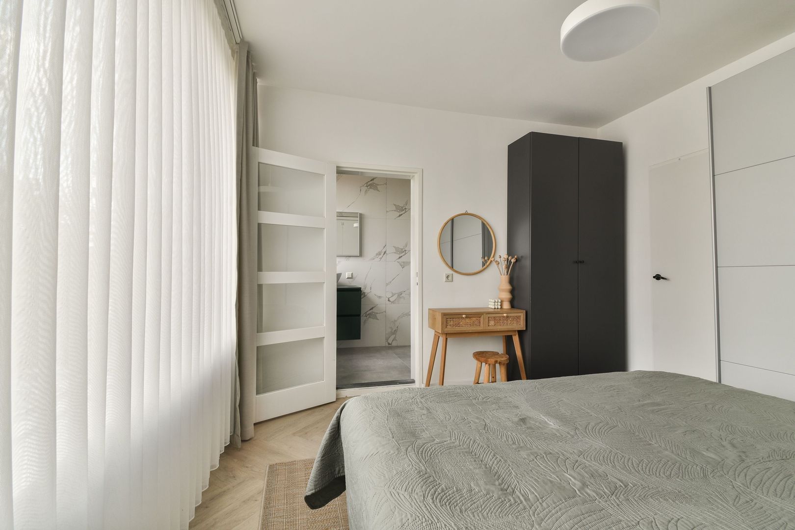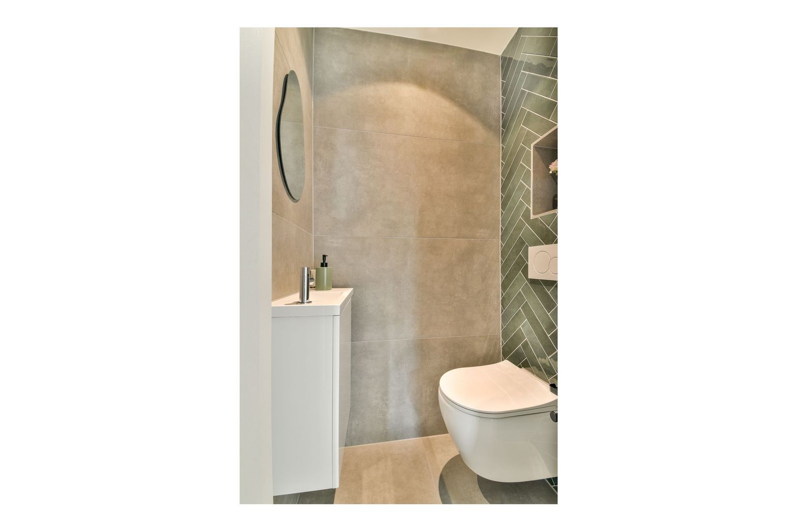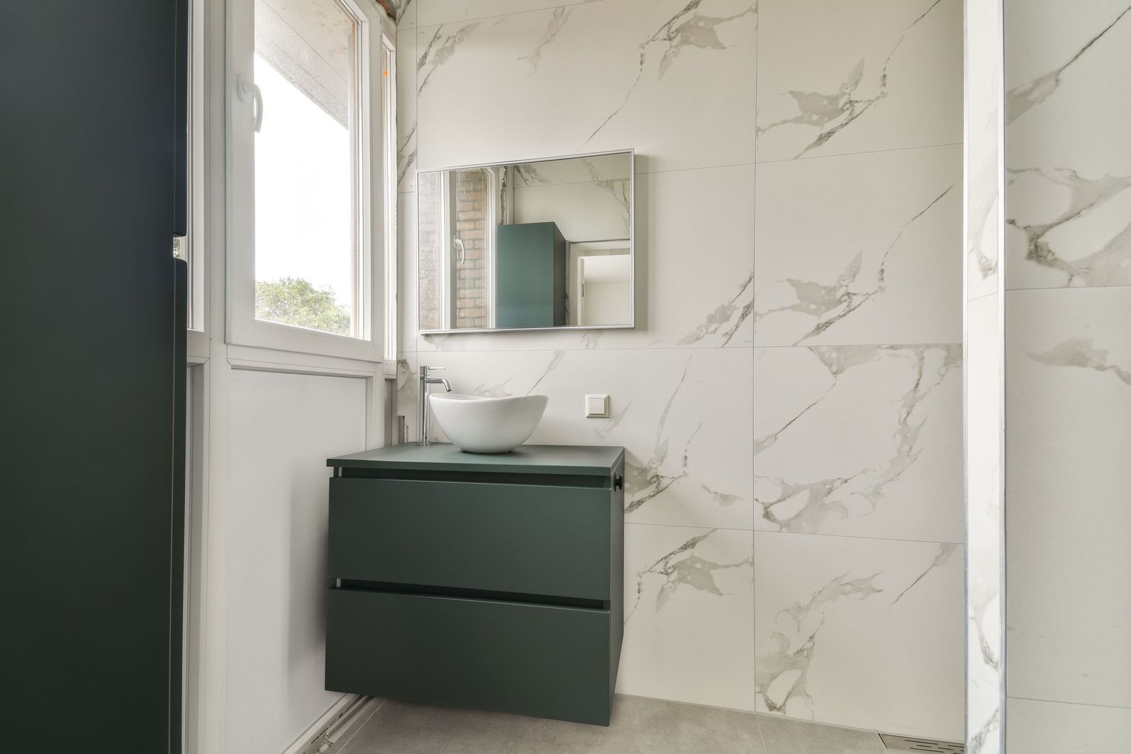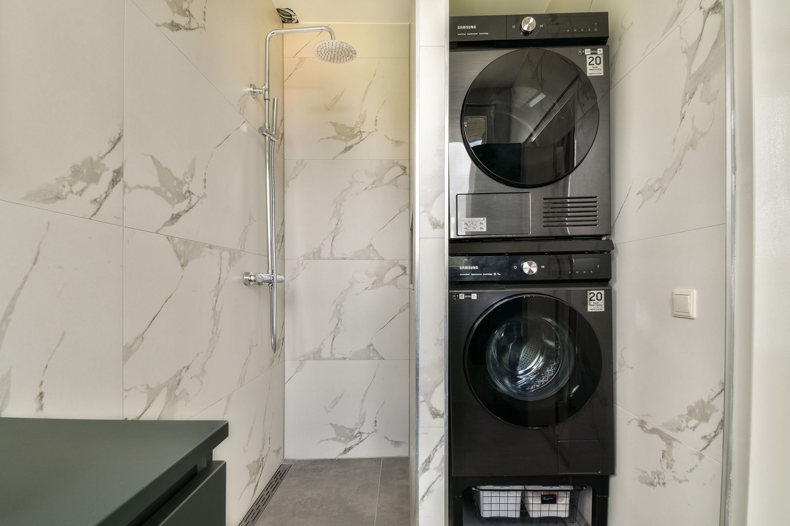 Moderne Badkamer met grote wandtegels uitgevoerd. De tegels met marmermotief geven de badkamer een chique en ruimtelijk effect, daarnaast is er een inloop douche met watergoot, thermostaatkraan, wastafelmeubel met kom, aansluiting wasmachine, plafond met ingebouwde verlichting.