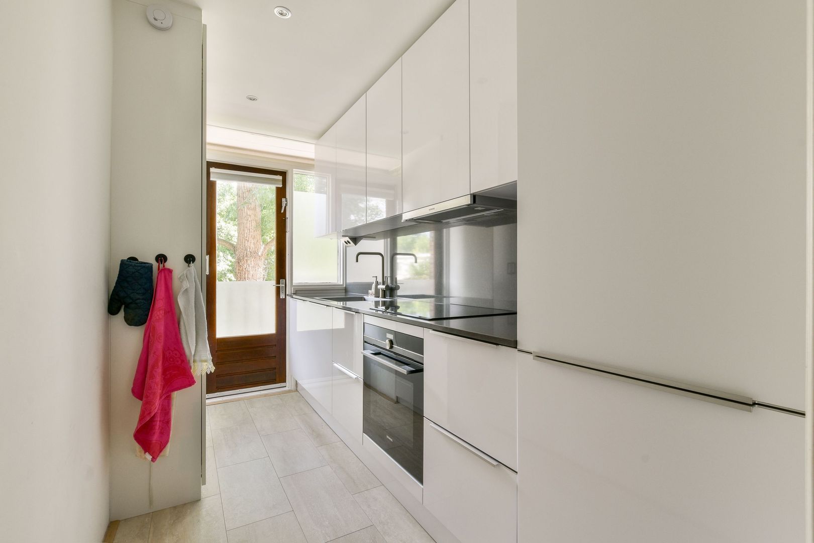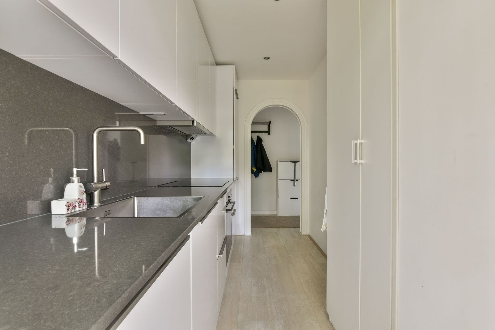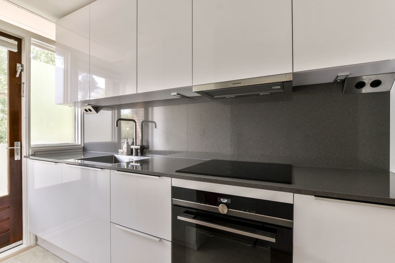 Moderne keuken met achterwandopstelling, witte hoogglans fronts, rvs-grepen, antraciet composiet aanrechtblad en voorzien van de volgende inbouwapparatuur: grote koelvriescombinatie, heteluchtoven, 4-pits inductiekookplaat, vlakscherm afzuigkap en vaatwasser, combi CV-ketel. Vanuit de keuken is er toegang tot het voorbalkon.