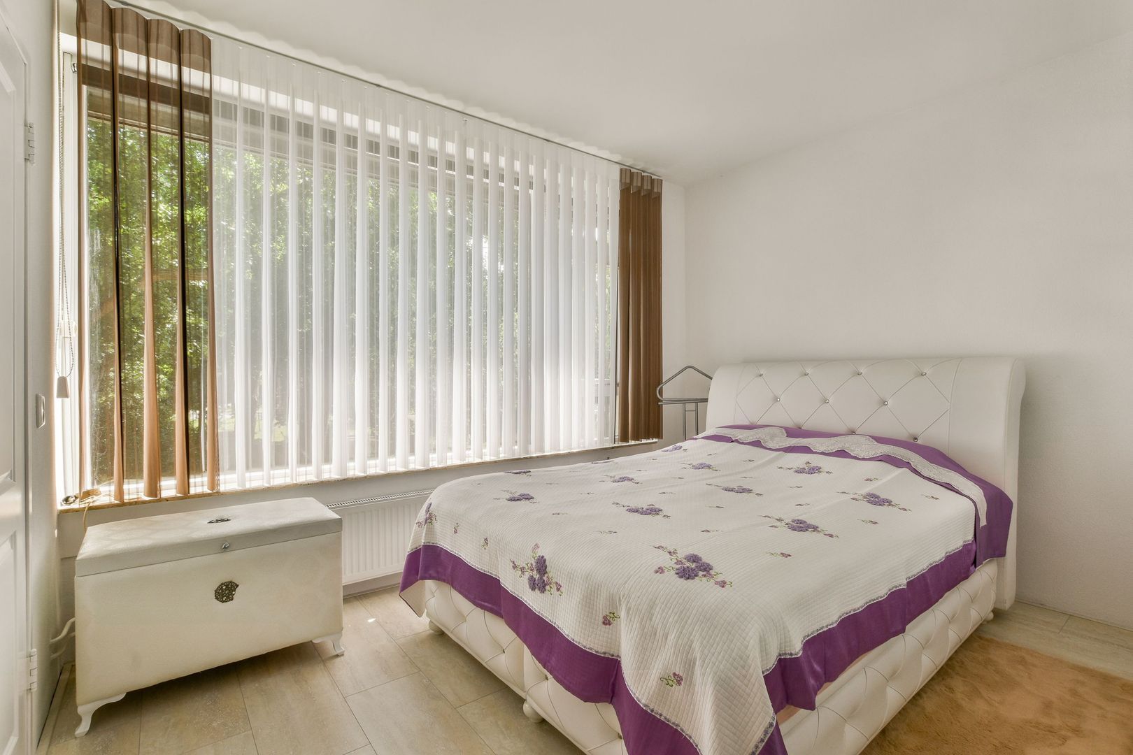 Hoofdslaapkamer van 13 m2 met groot raam en laminaatvloer.