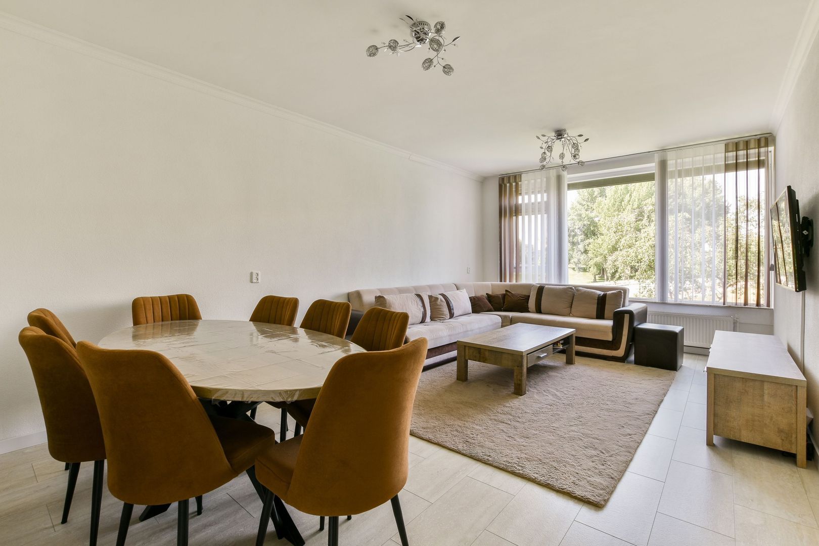 Fijne woonkamer van ca. 24 m2 met veel lichtinval en vrij uitzicht, gladgestuukt plafond en structuur wandafwerking, laminaatvloer met marmermotief.